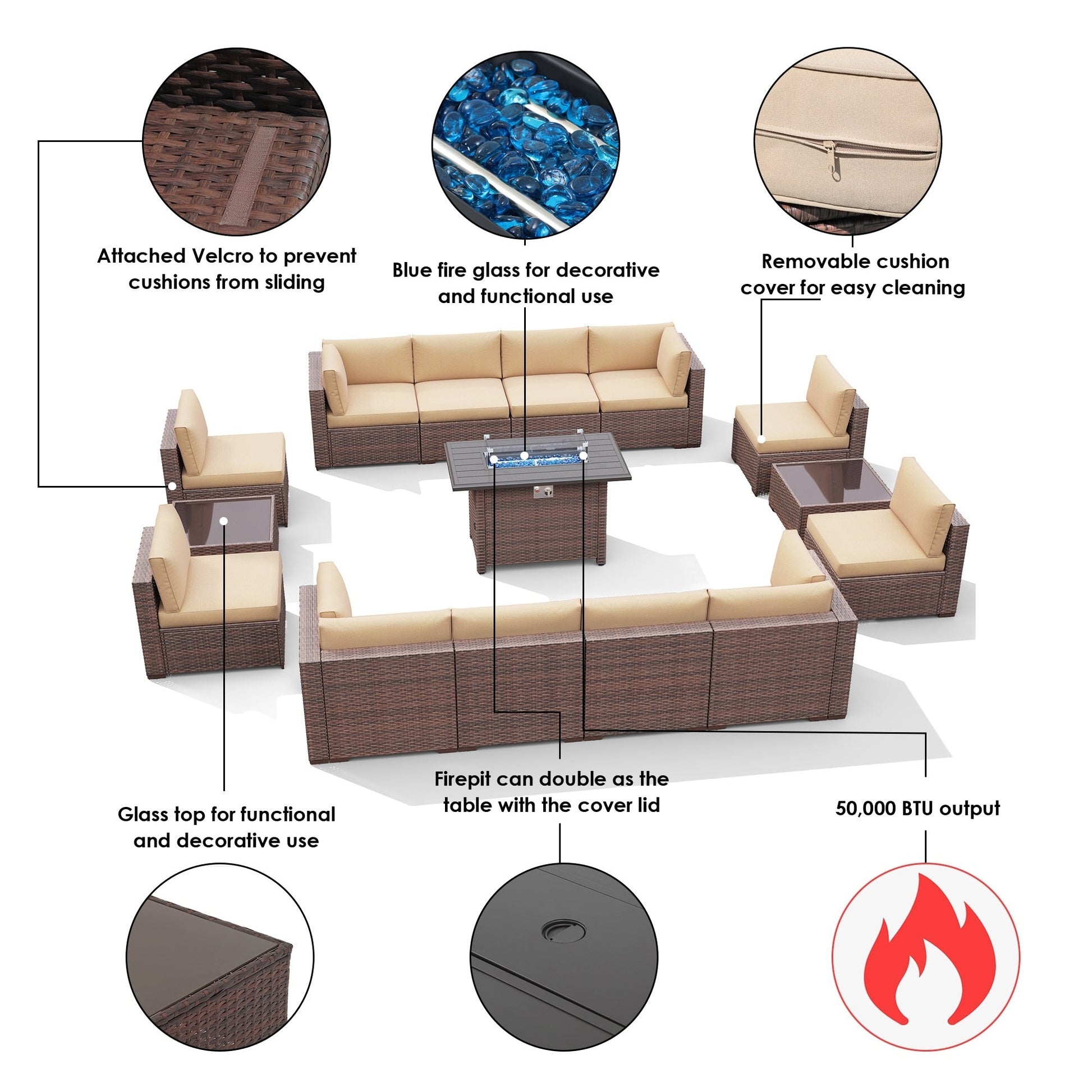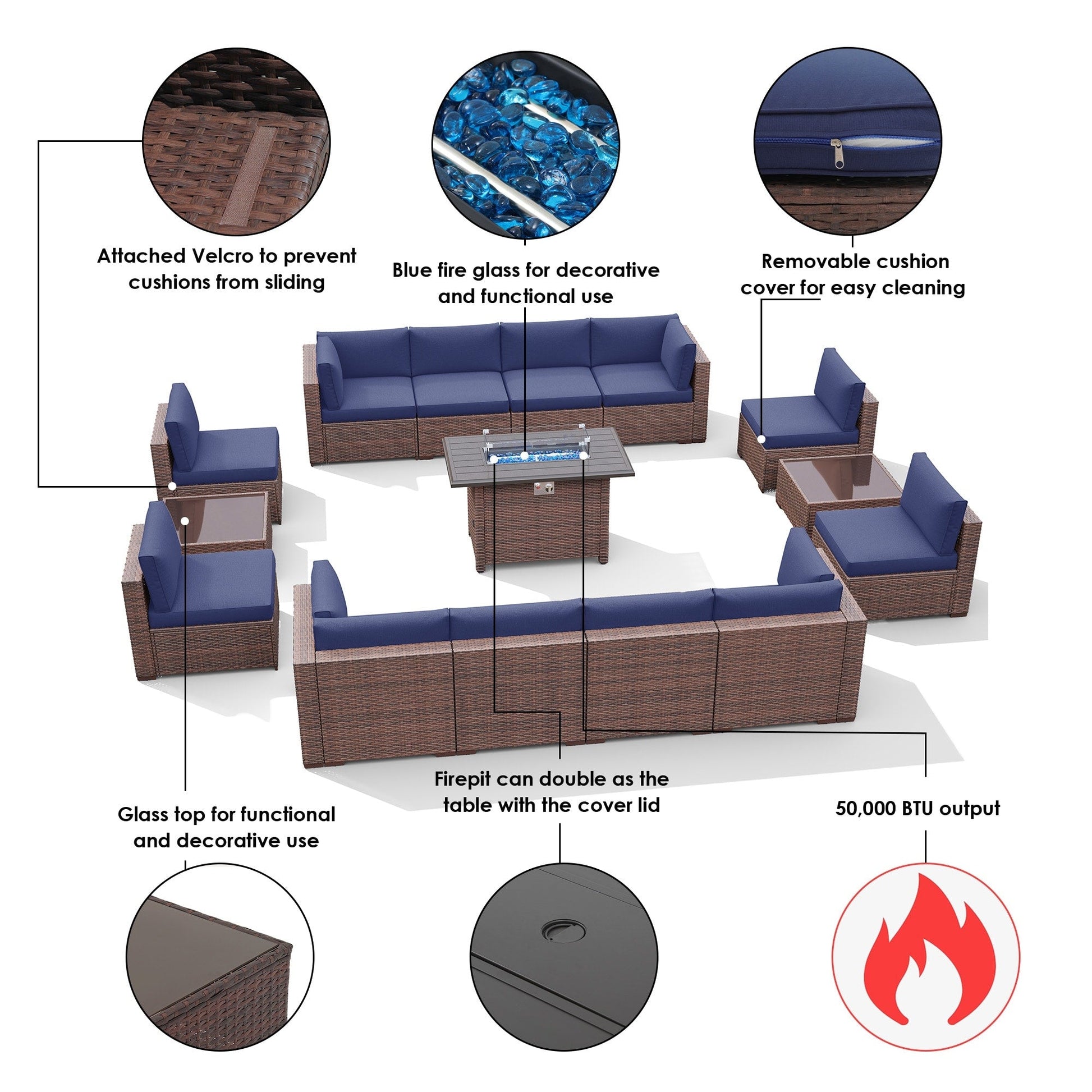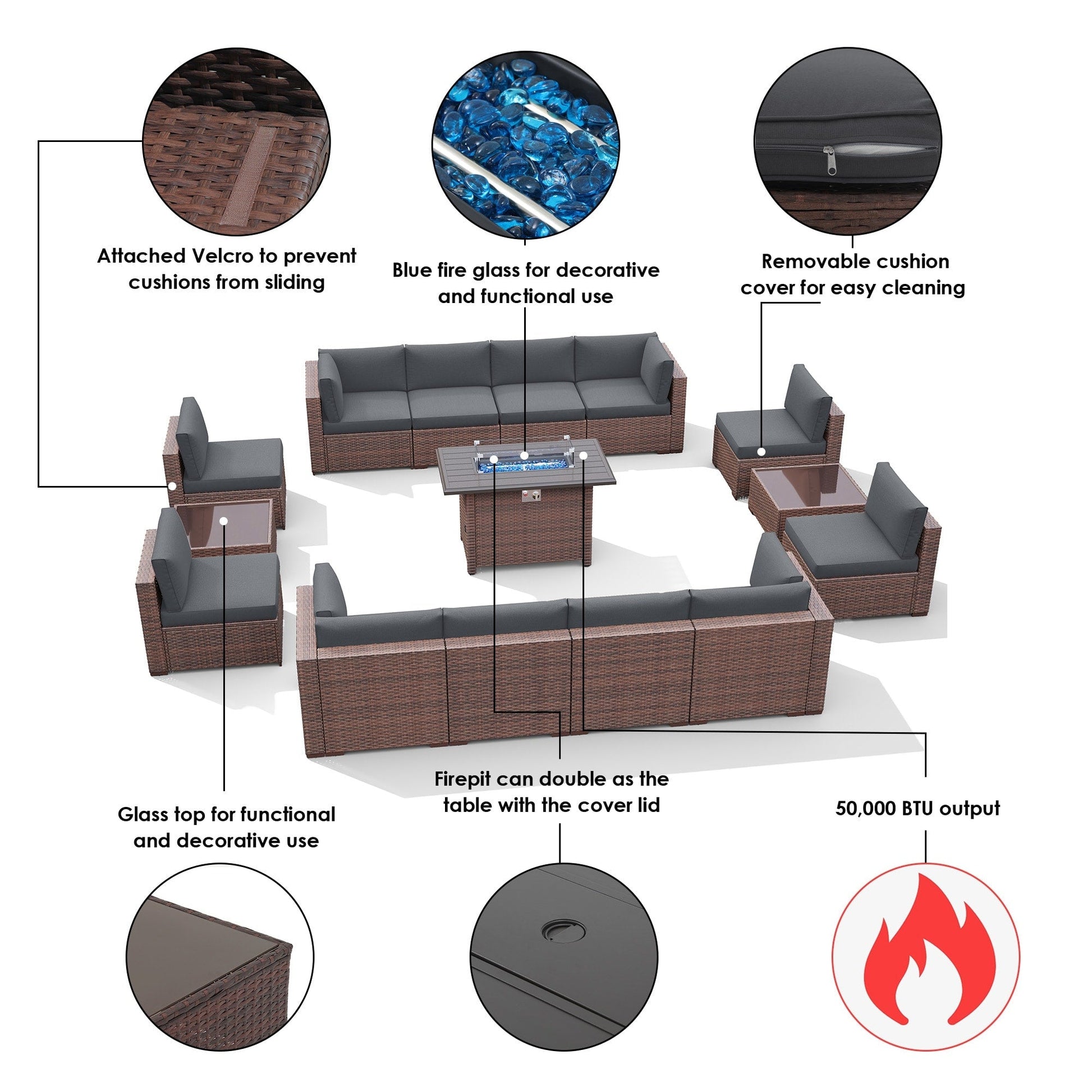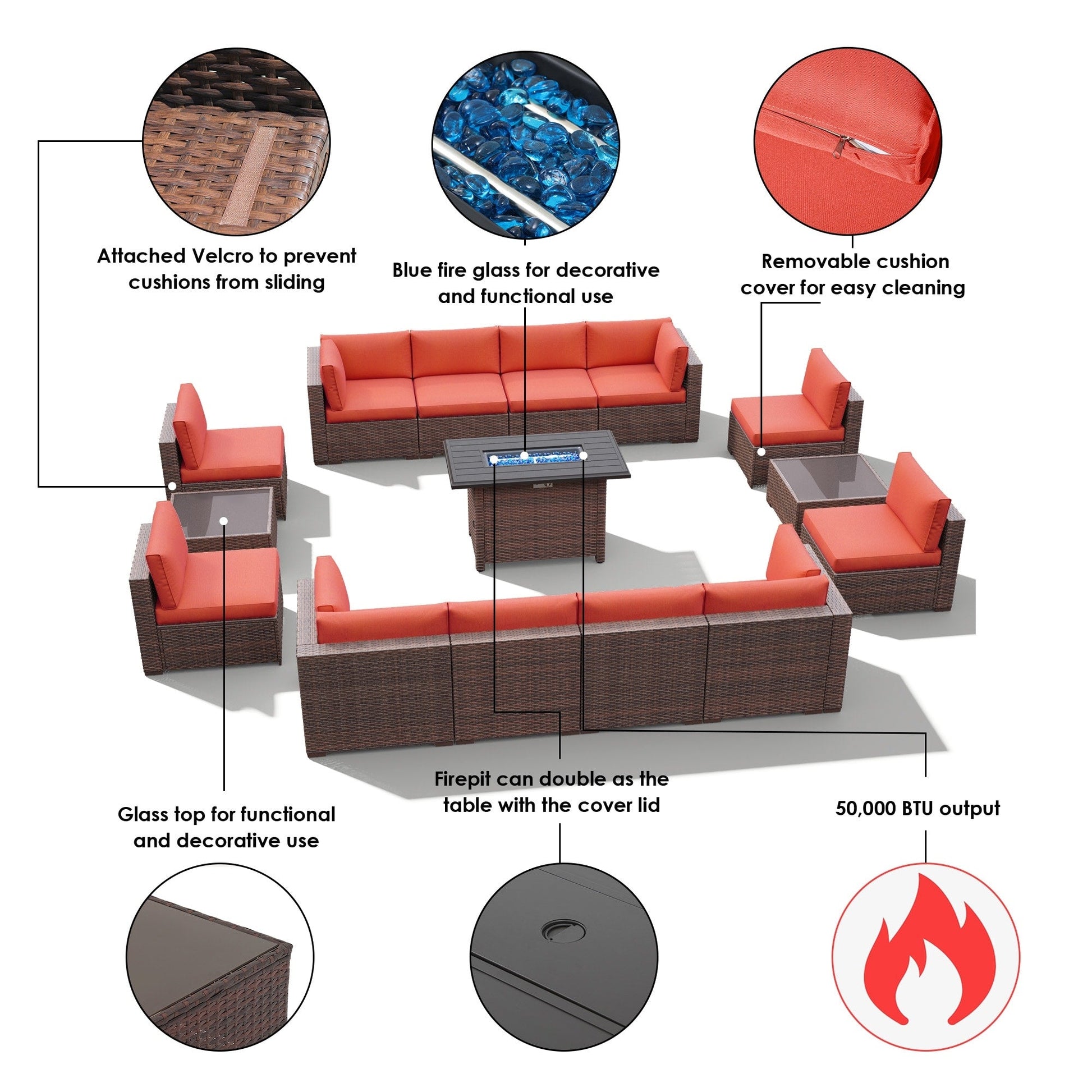 Crea un'elegante area salotto nel tuo patio con questo set di mobili in vimini da 15 pezzi. Realizzato in resistente vimini e telaio in acciaio verniciato a polvere, questo set di mobili da esterno modulare resisterà a diverse condizioni atmosferiche e arrederà diversi ambienti. Le linee pulite e la finitura nera del braciere creeranno un'atmosfera accogliente nel tuo spazio esterno. I cuscini altamente resistenti e gli ampi braccioli dal design ergonomico offrono il massimo comfort e un'esperienza di seduta ottimale. Questo lussuoso set di divani multicolori è dotato di un tavolino nero per tutte le tue esigenze di ricevimento all'aperto.