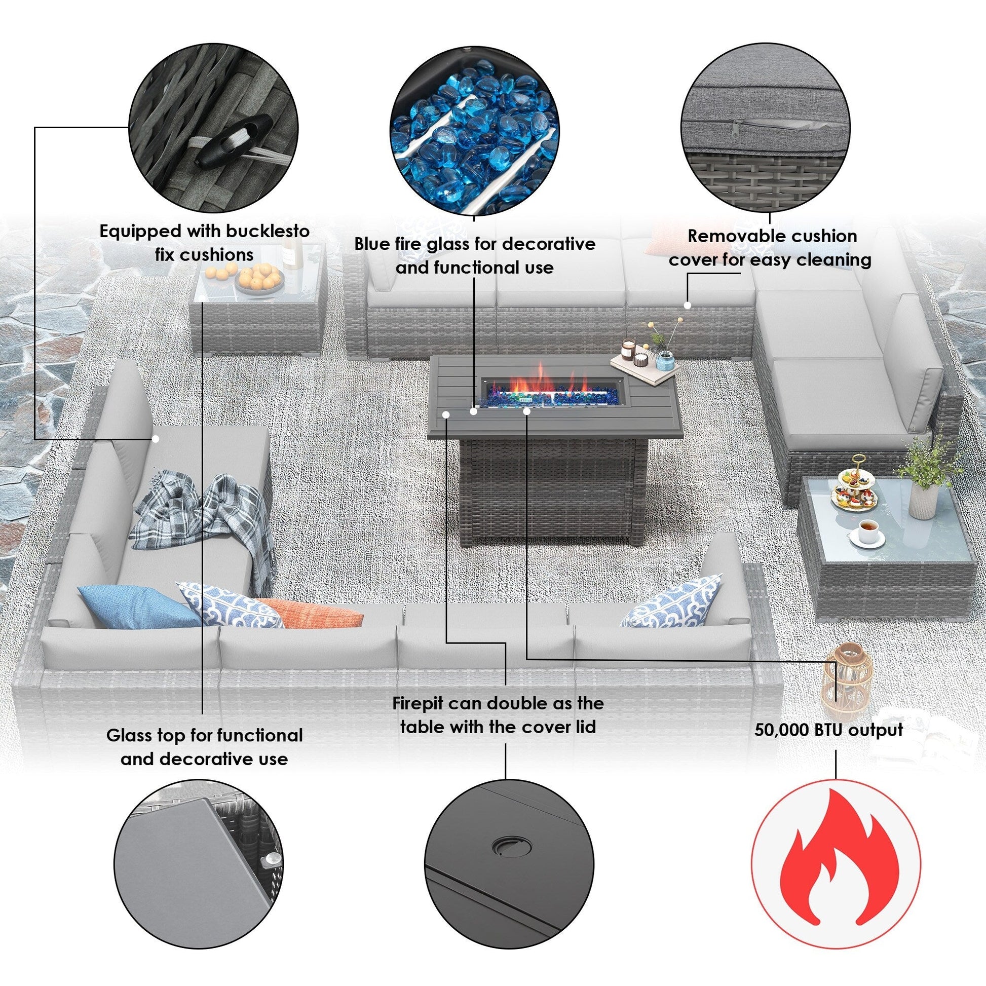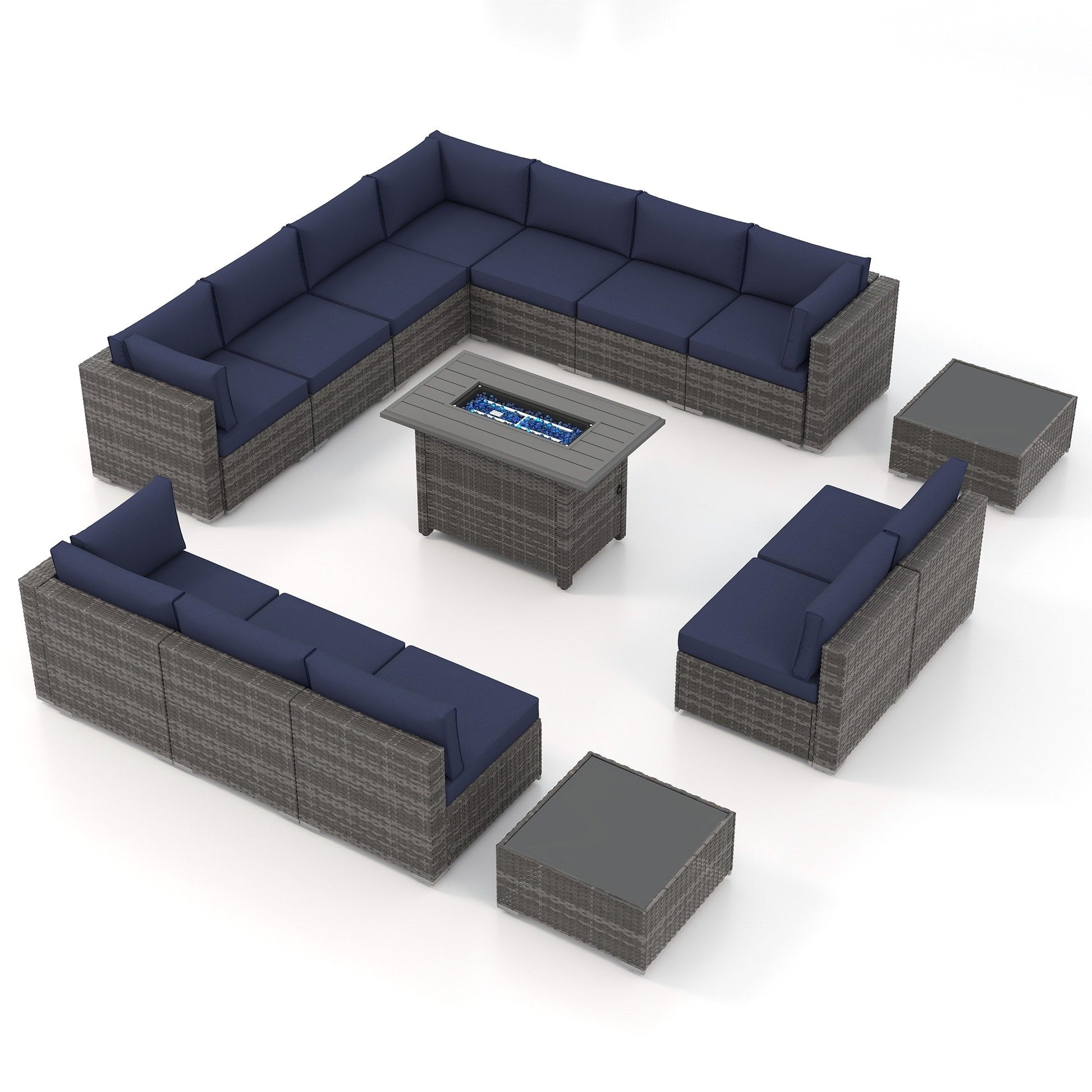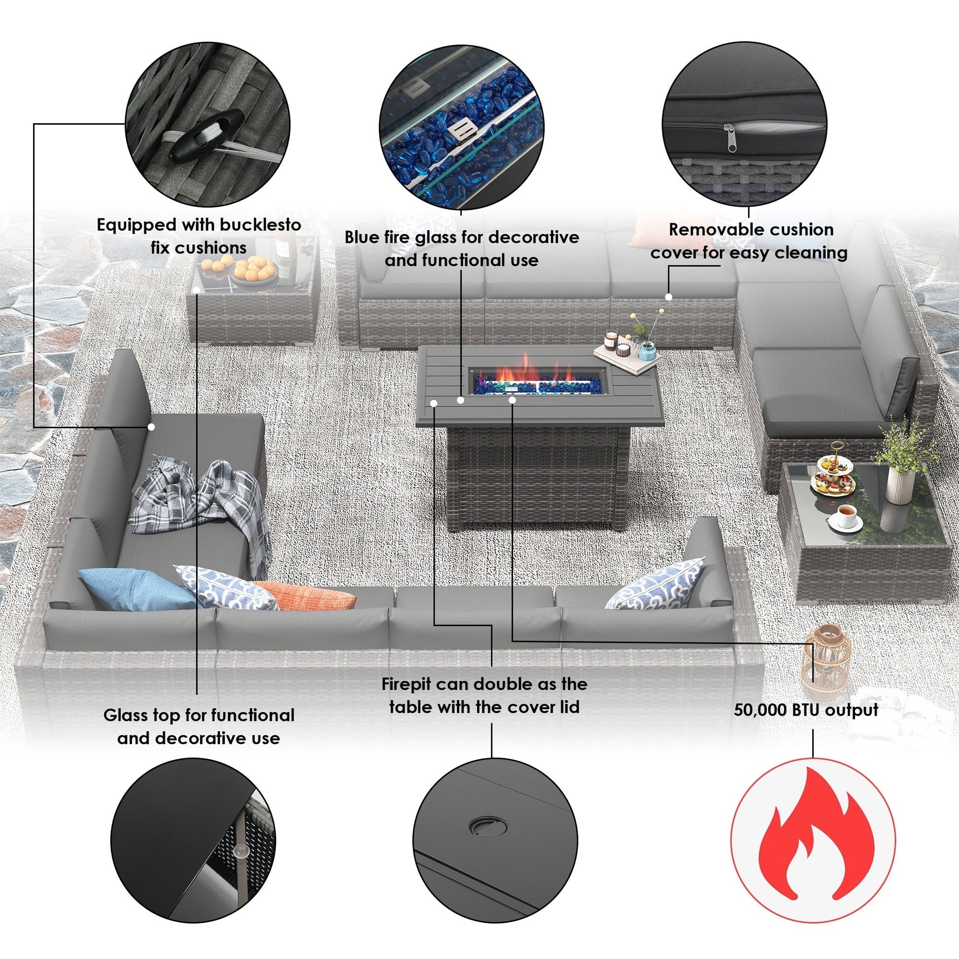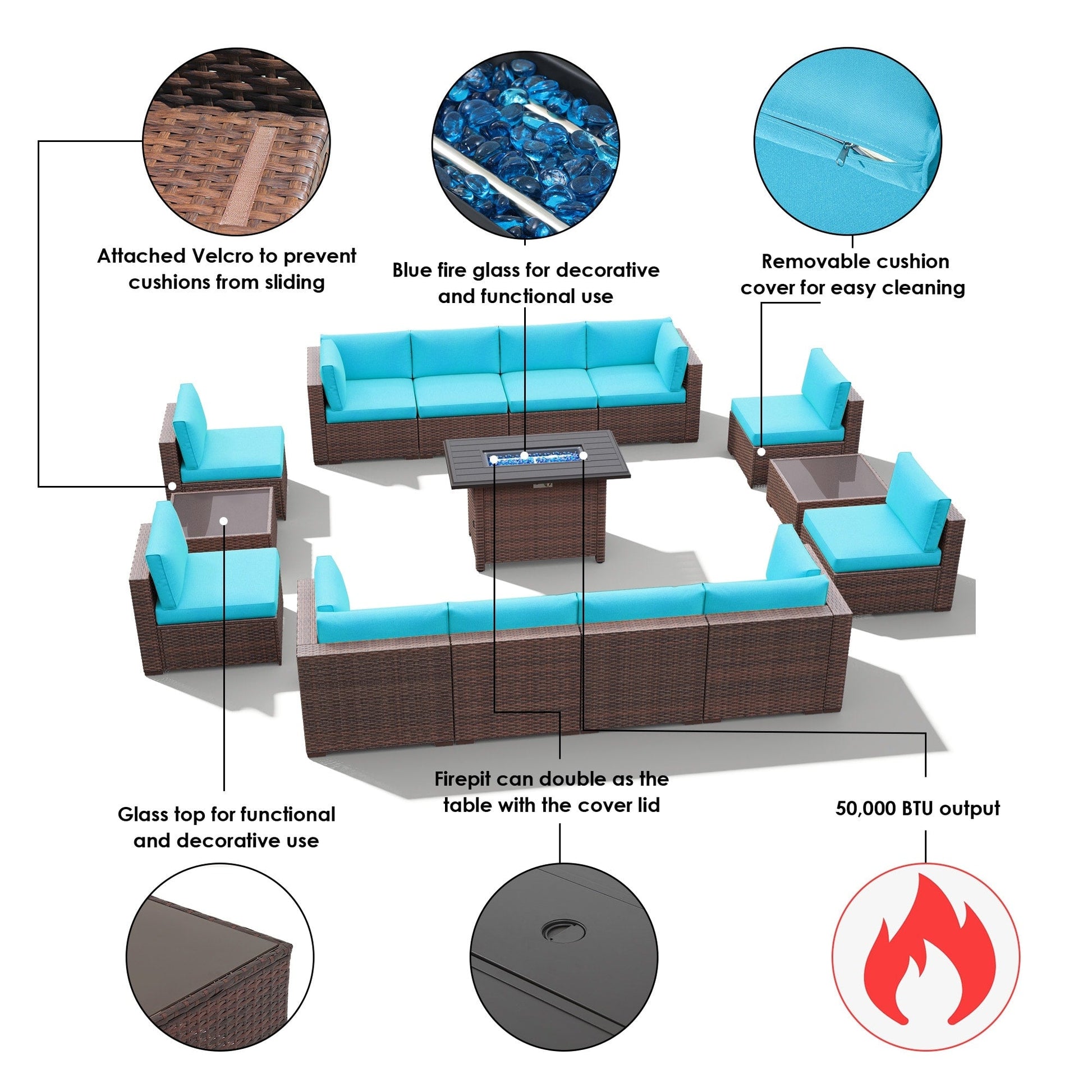 Crea un'elegante area salotto nel tuo patio con questo set di mobili in vimini da 15 pezzi. Realizzato in resistente vimini e telaio in acciaio verniciato a polvere, questo set di mobili da esterno modulare resisterà a diverse condizioni atmosferiche e arrederà diversi ambienti. Le linee pulite e la finitura nera del braciere creeranno un'atmosfera accogliente nel tuo spazio esterno. I cuscini altamente resistenti e gli ampi braccioli dal design ergonomico offrono il massimo comfort e un'esperienza di seduta ottimale. Questo lussuoso set di divani multicolori è dotato di un tavolino nero per tutte le tue esigenze di ricevimento all'aperto.