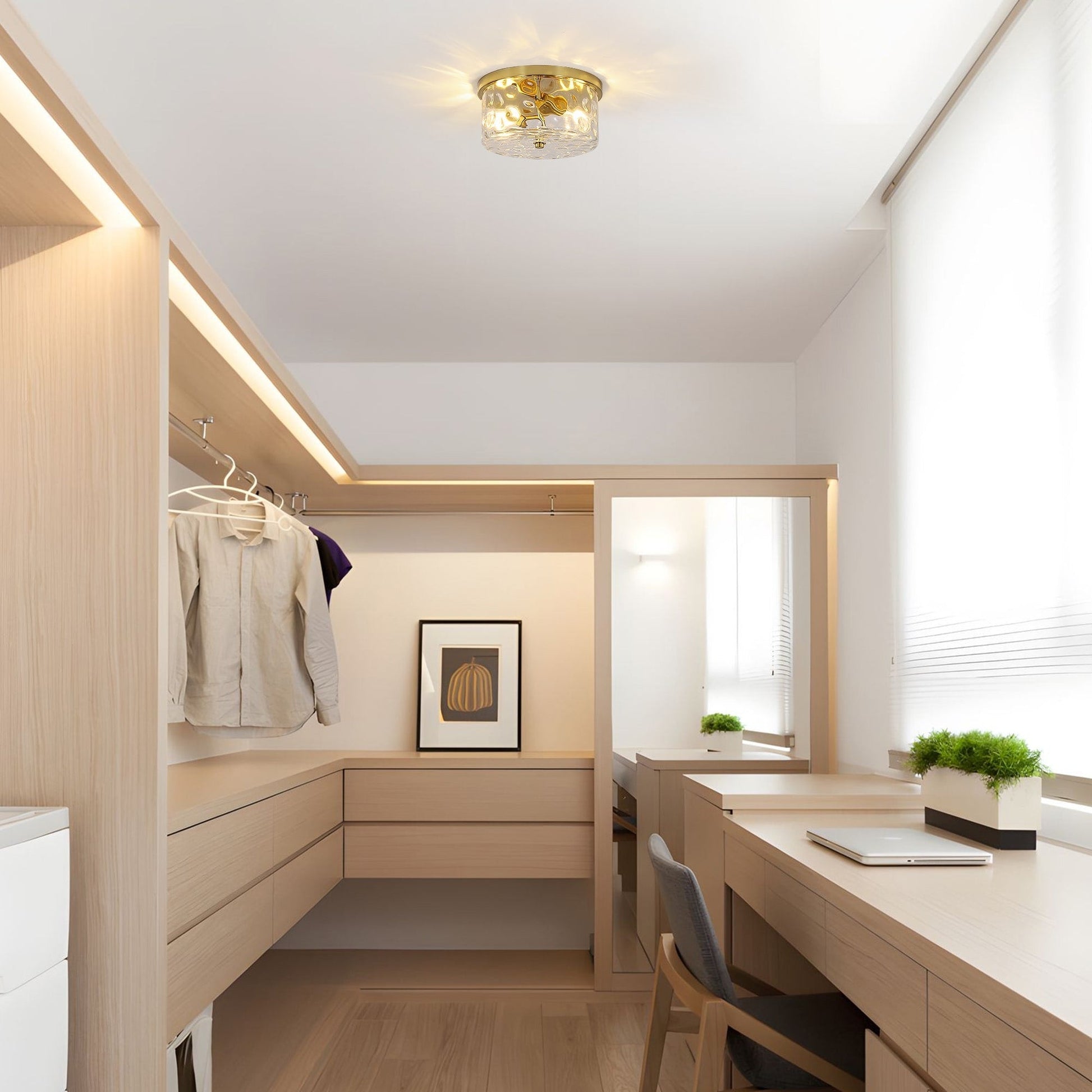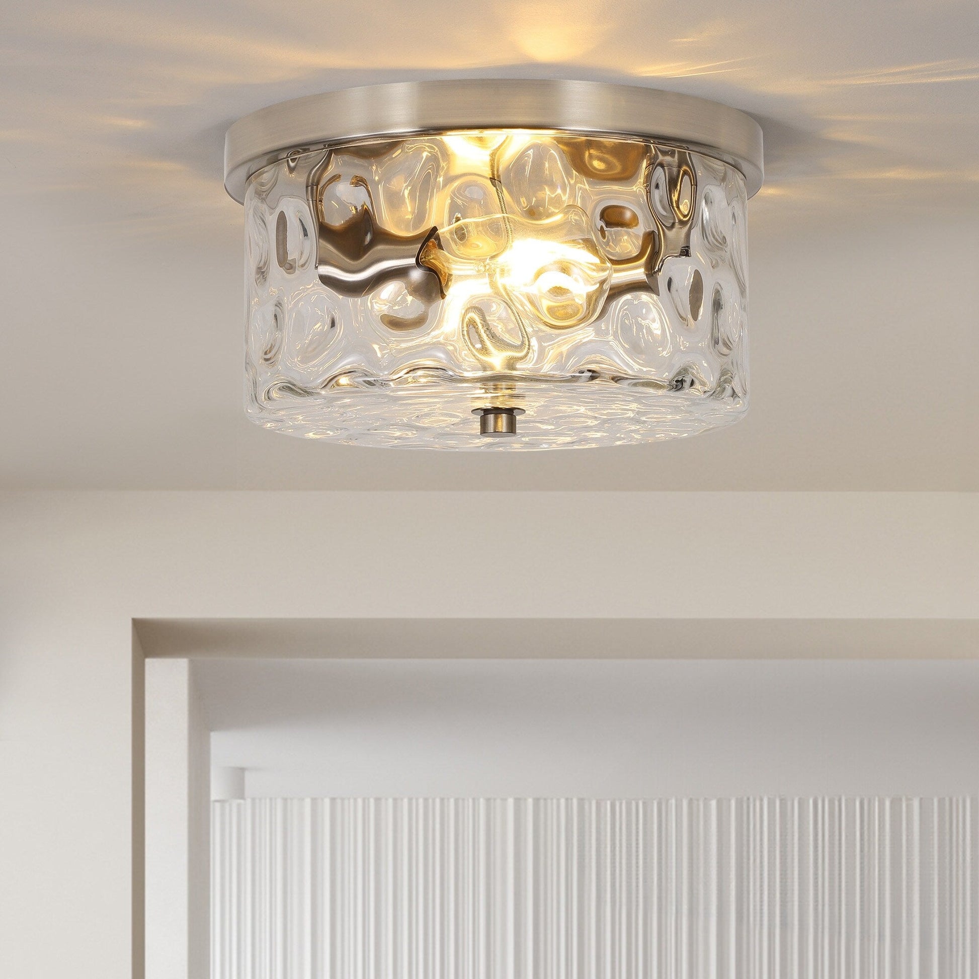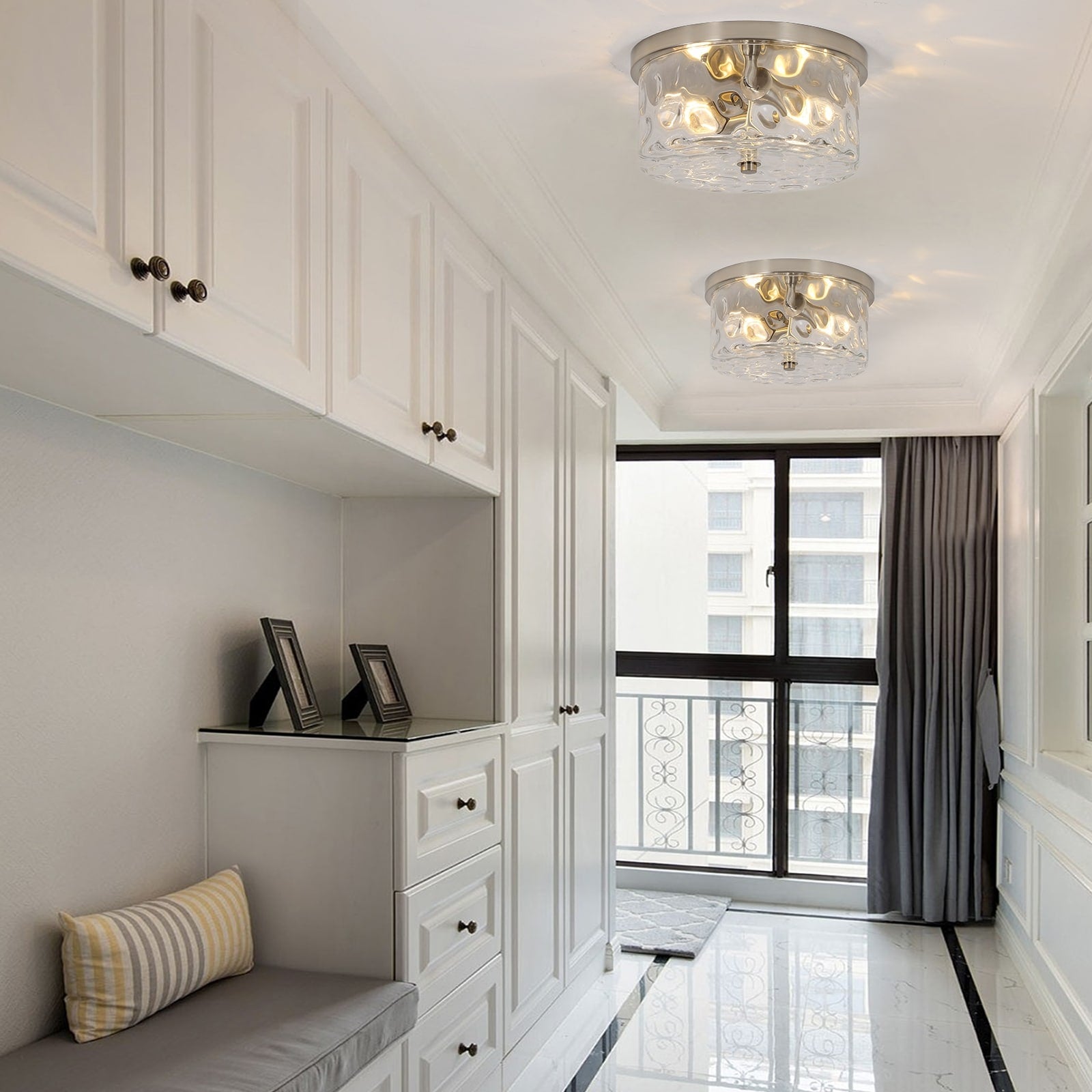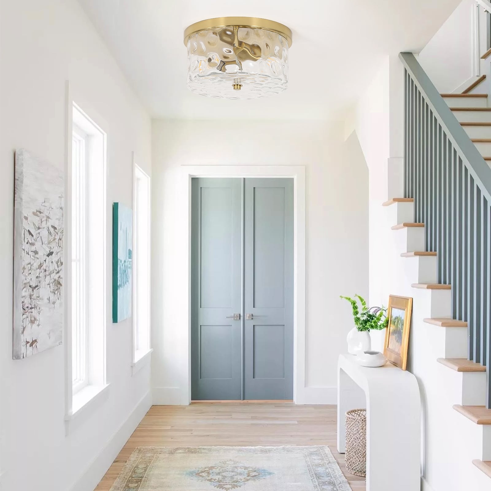 Questa plafoniera è realizzata con una robusta base in metallo, ricoperta da un delicato paralume in vetro martellato, che permette alla luce di diffondersi più lontano e più luminosa, rendendo le 2 luci più vivide e con un tocco vintage. Questa lampada è cablata e include l'hardware di montaggio essenziale per un'installazione rapida e semplice. Utilizzata comunemente in corridoi, scale, ingressi, cucine, camere da letto, bagni e altri luoghi che si desidera arredare.