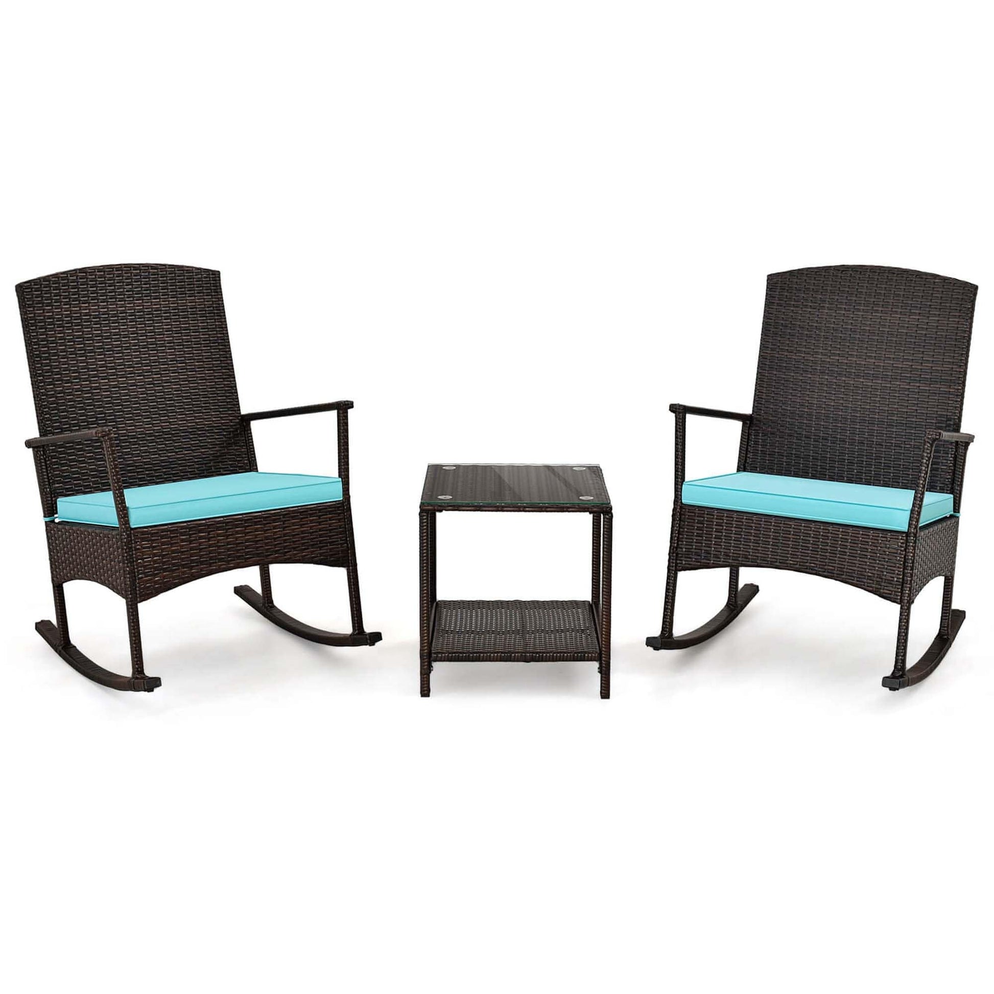 Set da 3 sedie a dondolo in vimini per patio con tavolino da caffè a 2 livelli