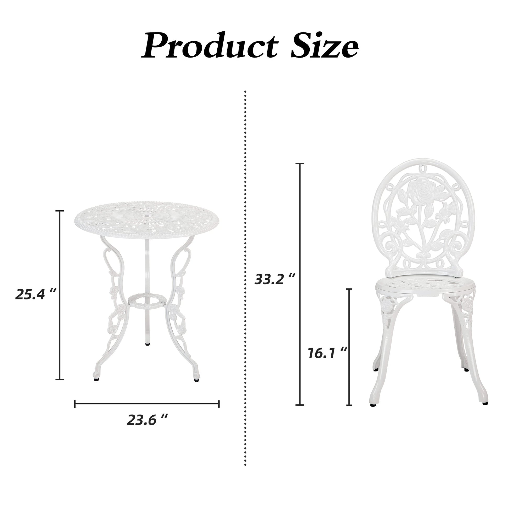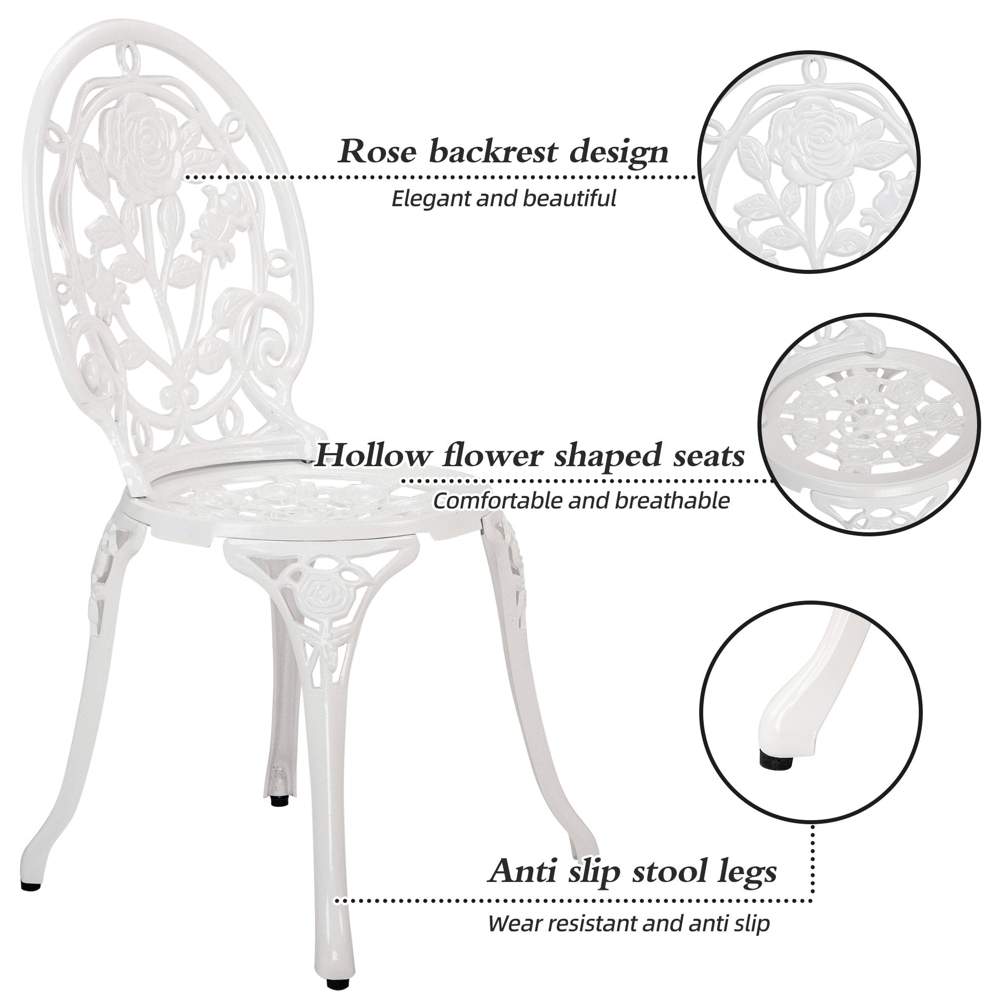 Godetevi il fascino spensierato di questo delizioso set da bistrot da 3 pezzi nel vostro patio. Con intricati dettagli floreali a spirale e una resistente struttura in alluminio pressofuso e ghisa con finitura bianca verniciata a polvere, questo set donerà sicuramente un tocco di stile al vostro arredamento da esterno. Perfetto per piccoli spazi, il set include due sedie e un piccolo tavolo da bistrot rotondo con foro per ombrellone.