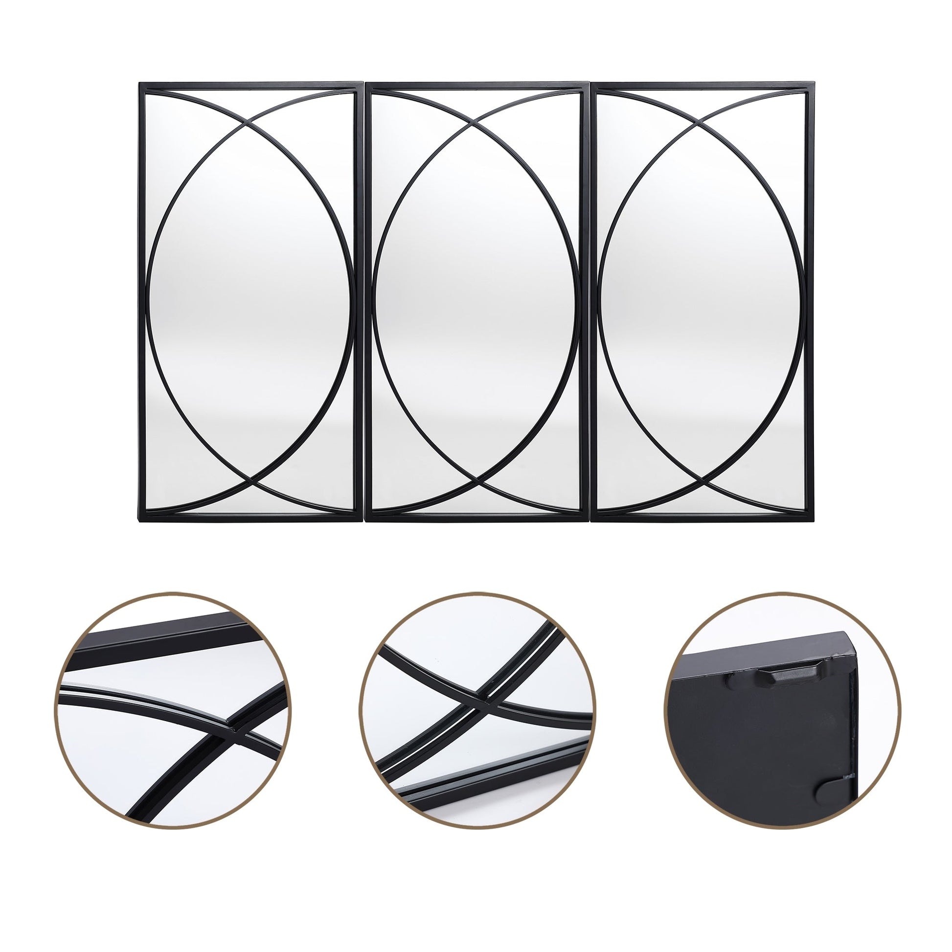 Valorizza il tuo spazio abitativo con questi specchi da parete rettangolari in metallo nero di alta qualità. Il set include tre specchi dal design contemporaneo che possono essere disposti insieme o separatamente in diverse posizioni per aggiungere un tocco personalizzato al tuo arredamento. Gli specchi vantano una superficie in vetro di alta qualità che offre riflessi cristallini, rendendoli perfetti sia per scopi funzionali che decorativi. Il bellissimo design moderno presenta due semicerchi che si intersecano al centro, permettendoti di combinarli e abbinarli in base alle tue esigenze e alla tua creatività.