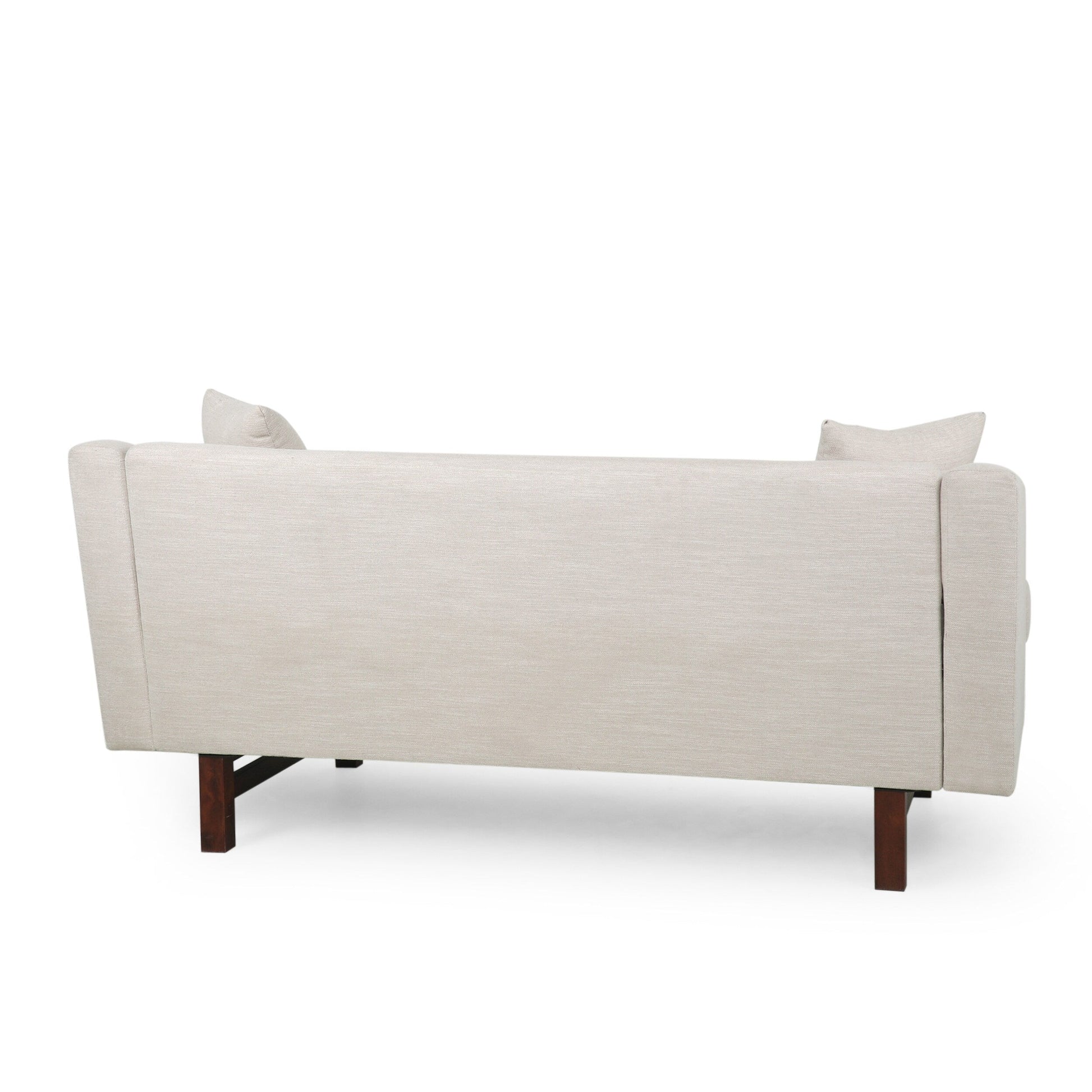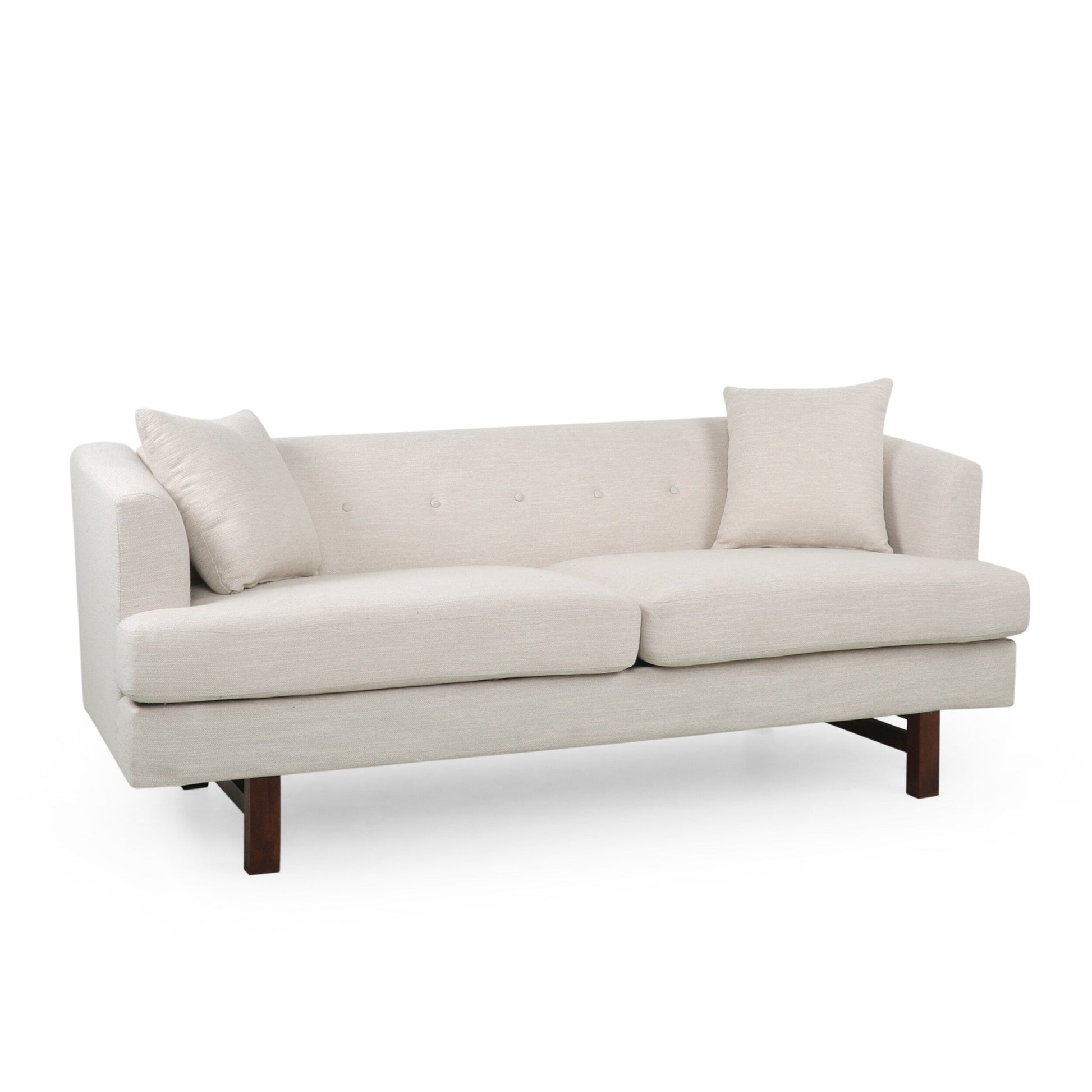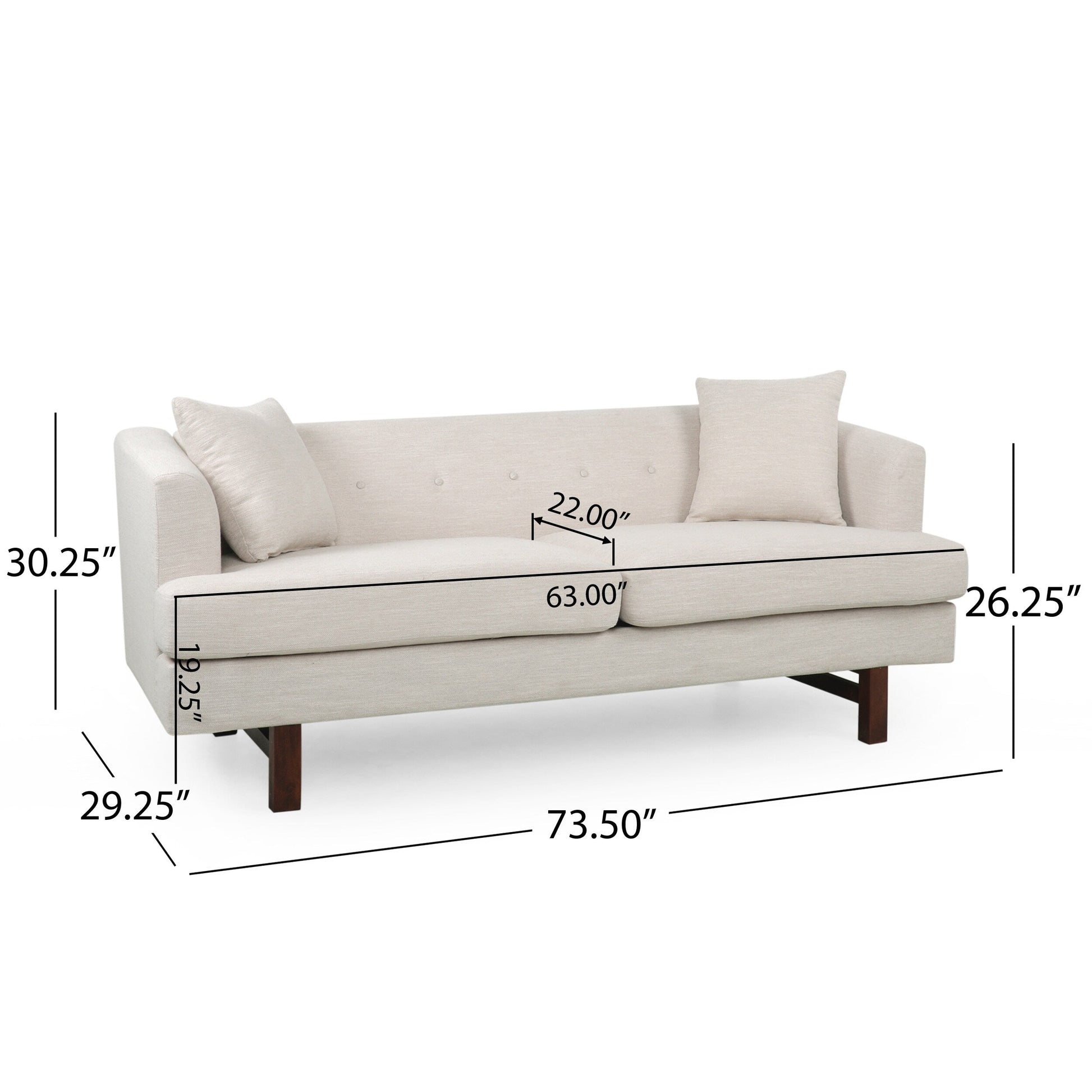 Questo divano unisce uno splendido look classico a un tocco moderno di grande impatto, inserendo facilmente il vostro arredamento in un'atmosfera di eleganza moderna di metà secolo. Questo divano è perfettamente bilanciato su robuste gambe in legno ed è sormontato da cuscini decorativi, che donano uno stile straordinario e una resistenza eccezionale alla vostra casa. DESIGN DI METÀ CENTO: Unendo gambe in legno dritte a linee pulite e un rivestimento liscio, il nostro divano offre un look di metà secolo al vostro salotto. Con le sue linee pulite e il suo aspetto sobrio, questo divano utilizza nuovi materiali per reinterpretare un design tradizionale. IMBOTTITO: Il nostro divano è generosamente imbottito, conferendo a qualsiasi ambiente un aspetto raffinato. Questo conferisce a questo pezzo una texture liscia e impeccabile, oltre a un'imbottitura confortevole per sedute morbide. CUSCINI DECORATIVI: I cuscini decorativi quadrati contribuiscono a legare insieme questo divano contemporaneo, bilanciando le sue gambe tornite e completando il divano in generale. Questo aggiunge un tocco di comfort in più al pezzo. GAMBE IN LEGNO DI BETULLA: Questo divano è sostenuto da robuste gambe in legno di betulla che offrono un aspetto accattivante e una struttura resistente. La sua grana fine resiste bene alle macchie, conferendo a questo pezzo una finitura splendida. DIMENSIONI: Scegli un accessorio della dimensione perfetta per te e per i tuoi mobili. Questo divano misura 73,50' L x 30,25' P x 29,25' A. Amerai quanto il tuo spazio possa trasformarsi con la semplice aggiunta di questo grazioso divano.