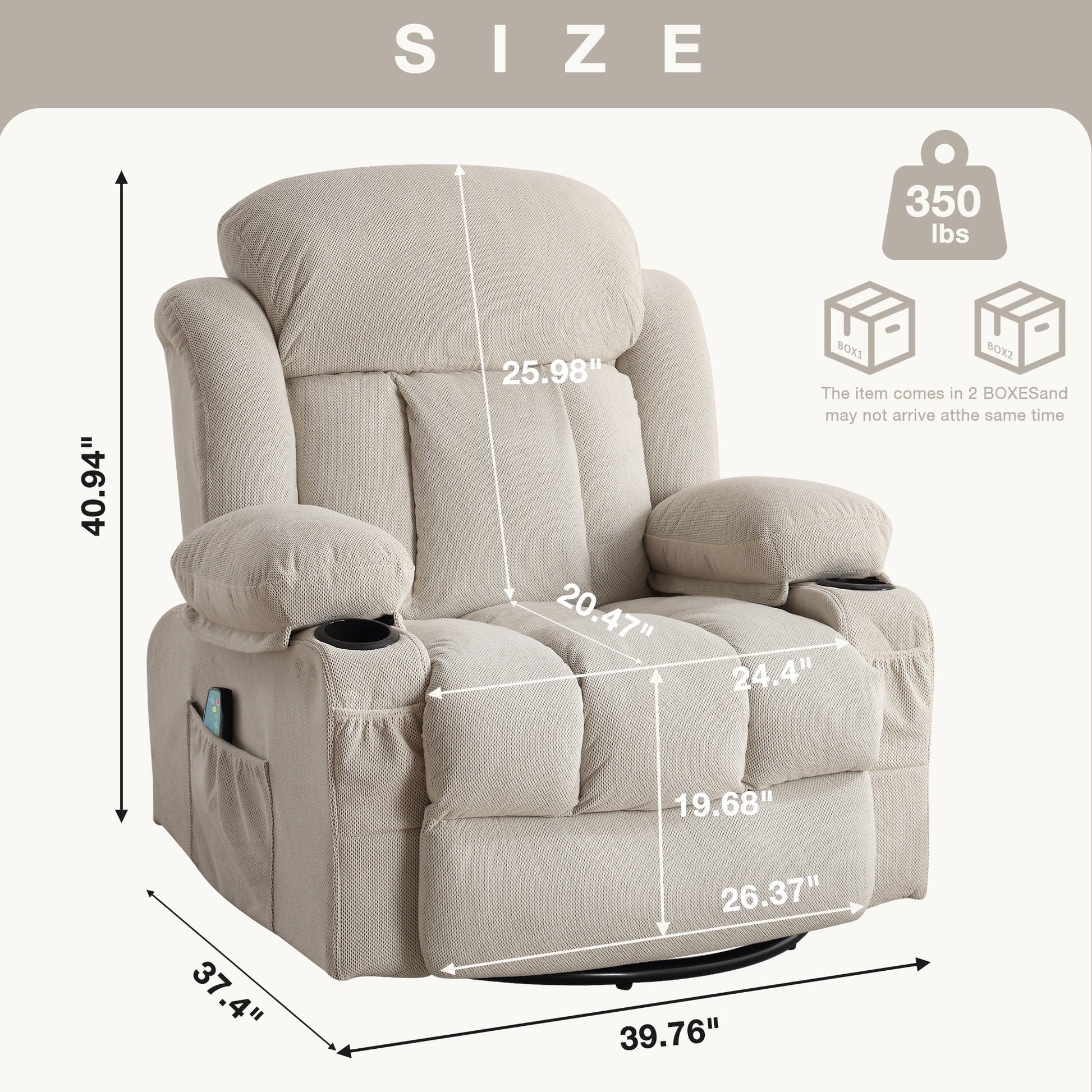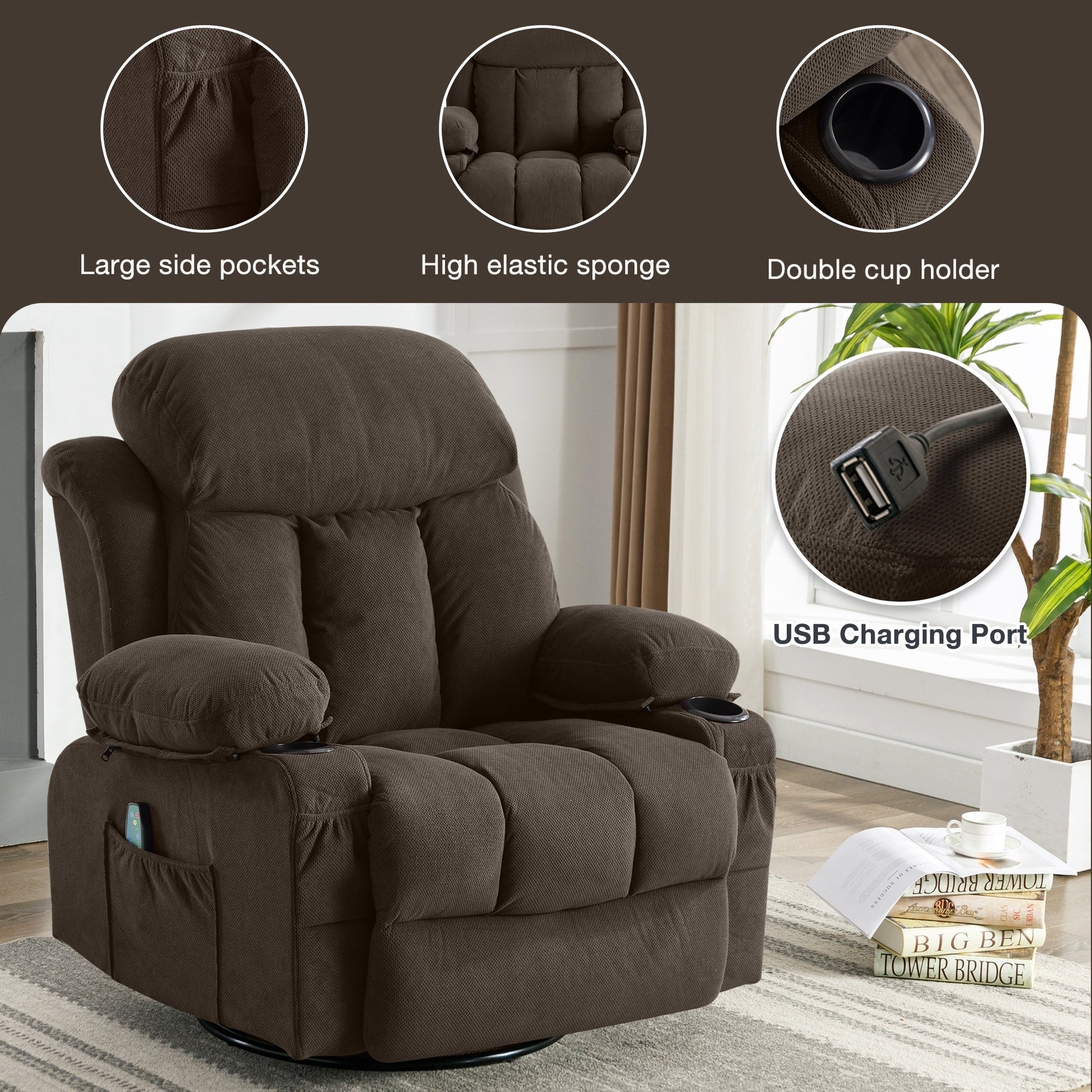Poltrona reclinabile massaggiante riscaldata girevole a 360° con ricarica USB, portabicchieri, vano portaoggetti laterale e rivestimento in morbido pile