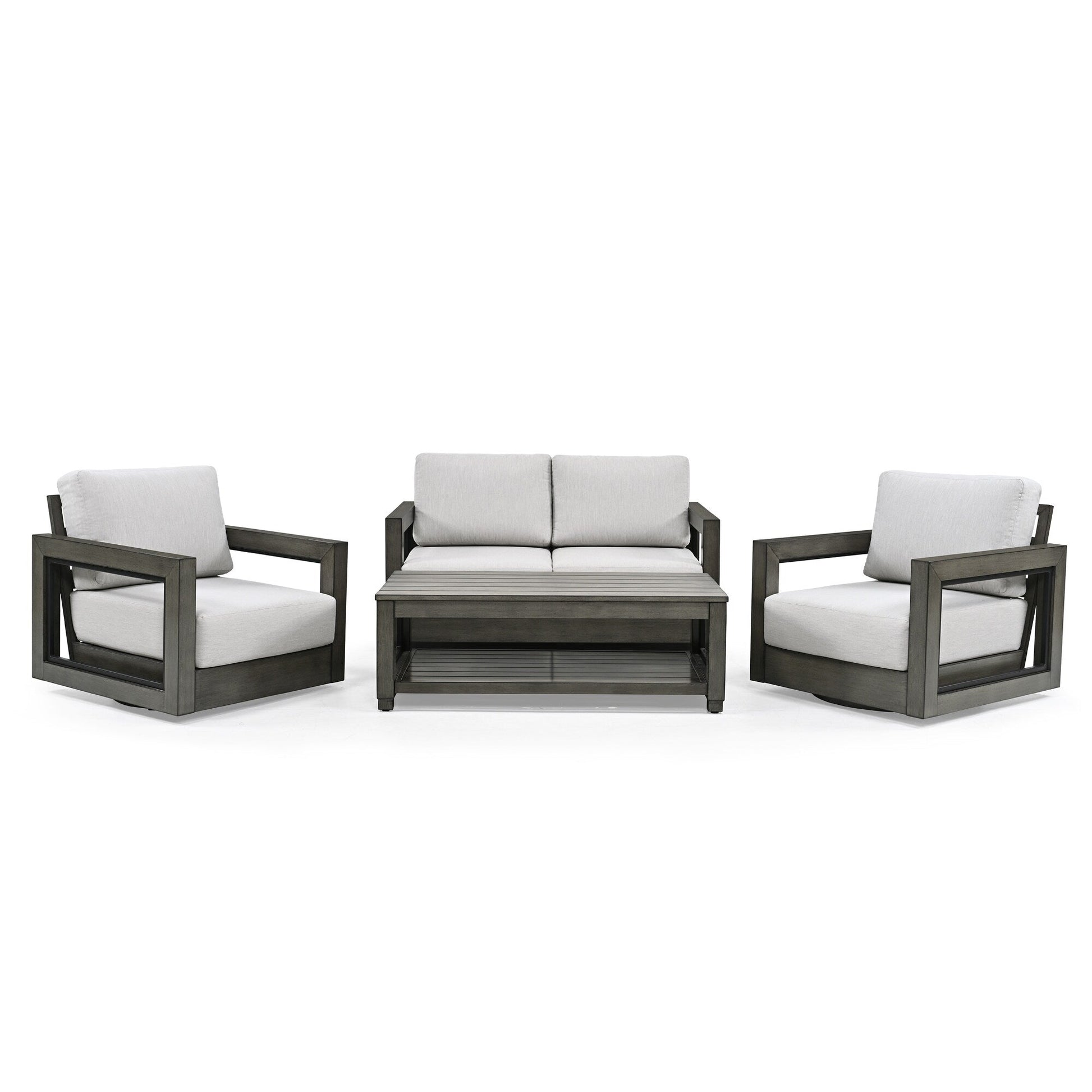 Set da conversazione in alluminio per 4 persone con sedie girevoli, struttura dipinta a mano e cuscini
