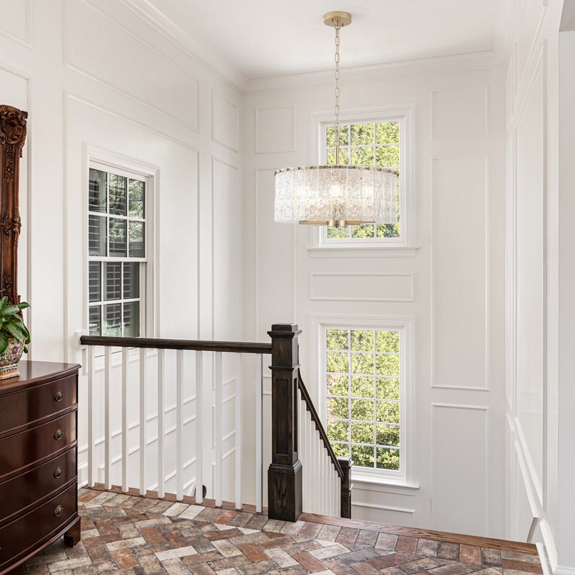 Illumina la tua isola cucina con eleganza con la nostra lampada a sospensione a forma di tamburo. Caratterizzata da un design mozzafiato con dettagli in cristallo, questa lampada emana raffinatezza e lusso. Con cinque luci e una direzione della luce verso l'alto, fornisce un'ampia illuminazione aggiungendo un tocco di glamour al tuo spazio. Realizzata in metallo di alta qualità, vetro e vero cristallo cinese K9, garantisce durata e un'estetica lussuosa. La lunghezza regolabile consente un posizionamento flessibile, mentre la sua compatibilità con i soffitti inclinati offre opzioni di installazione versatili. Perfetta per luoghi asciutti, questa lampada a sospensione combina stile e funzionalità per valorizzare qualsiasi ambiente cucina. Nota: le lampadine non sono incluse.