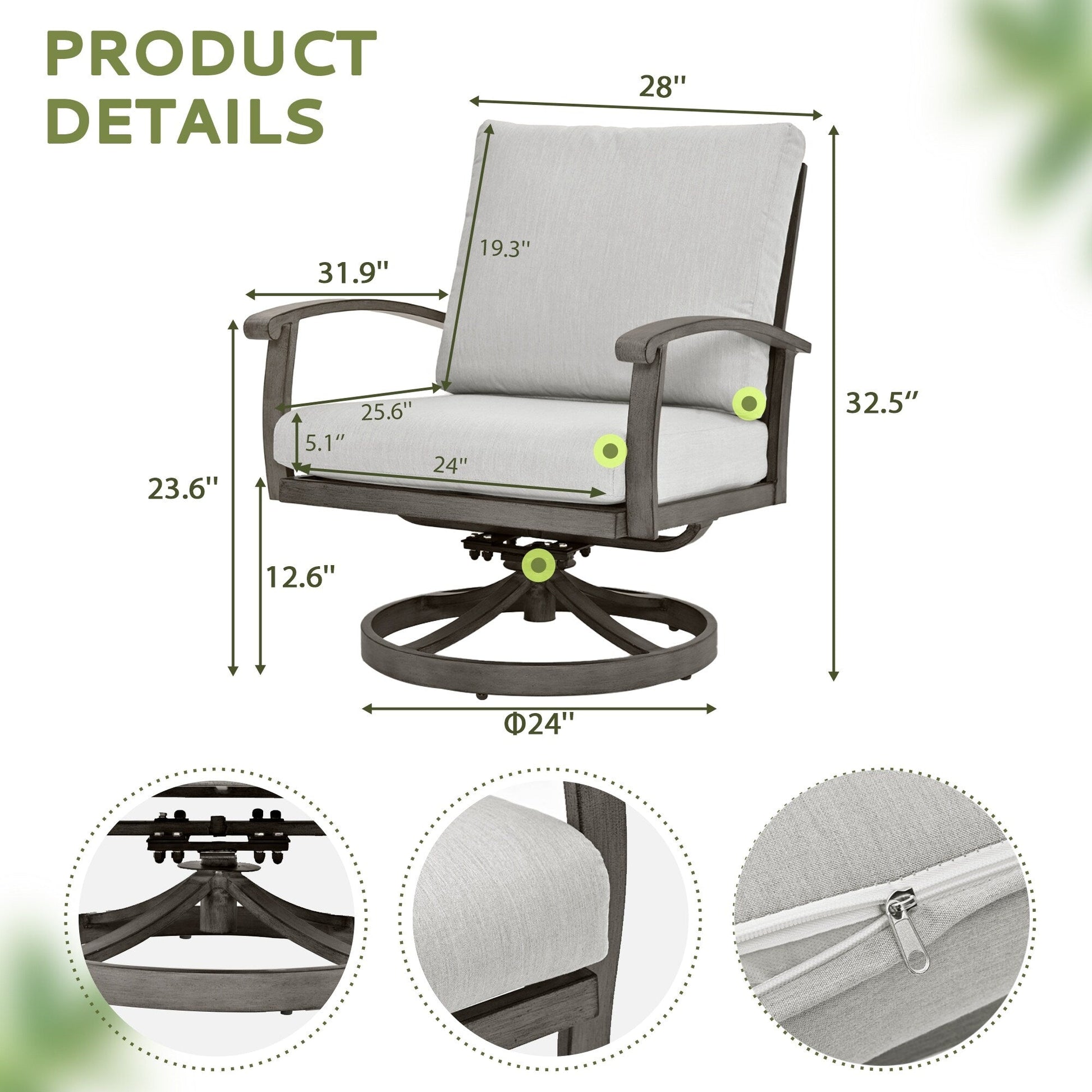 Questo set da conversazione da patio composto da 5 pezzi si adatta agli spazi esterni limitati. Include 2 poltrone girevoli, 2 pouf e 1 tavolino. Offre l'ambiente perfetto per condividere un cocktail, guardare il tramonto o chiacchierare con gli amici. Le strutture sono realizzate in alluminio in una tonalità scura, resistente alle intemperie, ai raggi UV, alla ruggine e alla muffa. Perfetto per gustare una tazza di caffè o sorseggiare un drink con la famiglia o gli amici in giardino, cortile, balcone, veranda, patio o soggiorno. L'esterno semplice ed elegante è ideale per patio, prato, bordo piscina, soggiorno o giardino. Design ergonomico: questo set da conversazione per patio presenta un design moderno ed ergonomico, ogni seduta ha comodi braccioli e schienali che si inarcano perfettamente per adattarsi ai contorni del tuo corpo. Robusto e durevole, il telaio di questo set da conversazione per patio è realizzato in alluminio di alta qualità, resistente alle intemperie e resistente alla ruggine. Il suo materiale interamente in alluminio protegge i dannosi raggi UV dalla ruggine e dalla muffa. Cuscini comodi dotati di cuscini morbidi e ad alta resilienza da 4,3 pollici di spessore, il sedile ti offrirà un'esperienza confortevole e ti farà rilassare completamente. Facile da pulire: tutti i cuscini di questo set di mobili da esterno sono rimovibili, design con cerniera per un facile lavaggio e manutenzione. FACILE DA MONTARE: forniamo istruzioni di installazione dettagliate e tutti i componenti necessari sono inclusi nella confezione. Puoi scansionare il codice QR sul manuale per ottenere il video di installazione come riferimento. Applicazione multi-scenario, i nostri set da conversazione per patio sono il complemento perfetto per il tuo cortile, terrazza, veranda, balcone o piscina. Imballaggio e servizio, questo set da conversazione per patio è dotato di 3 scatole, che contengono: 2 sedie, 2 pouf, 1 tavolino, per qualsiasi domanda, non esitare a contattarci.