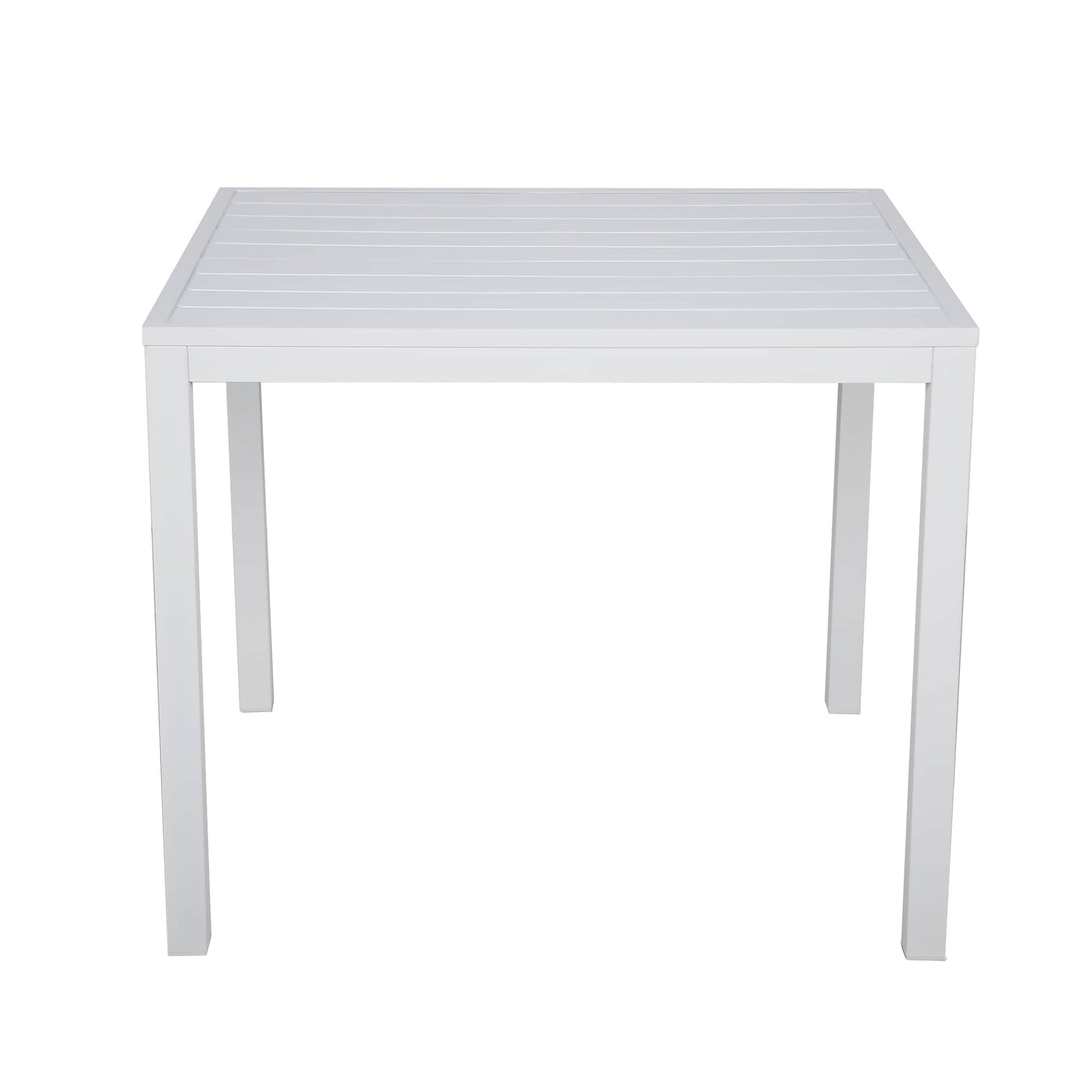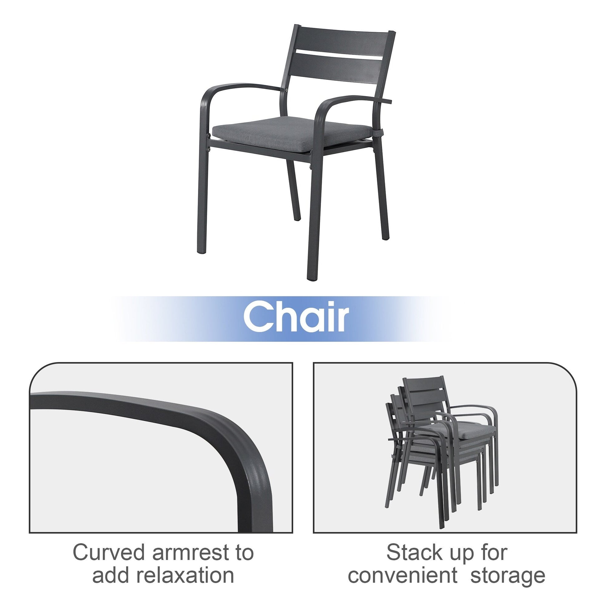 Crea uno spazio accogliente e accogliente per cenare in famiglia con questo set da pranzo in alluminio dalle linee essenziali. Realizzato in alluminio verniciato a polvere, ogni pezzo è resistente a tutte le intemperie e progettato per durare all'esterno. Il design a listelli del piano del tavolo garantisce una manutenzione ridotta e una maggiore stabilità, per godersi appieno l'aria aperta. La finitura grigio scuro/bianco conferisce un tocco moderno e contemporaneo al tuo arredamento da esterno e si adatta a molti stili. I cuscini imbottiti in spugna sulle sedie ti offriranno maggiore comfort e il bracciolo curvo è perfetto per un riposo migliore. Rilassati nella brezza calda e sorseggia un drink fresco, organizza una riunione all'aperto per trascorrere momenti di relax sul nostro set da 4 posti in alluminio per patio.
