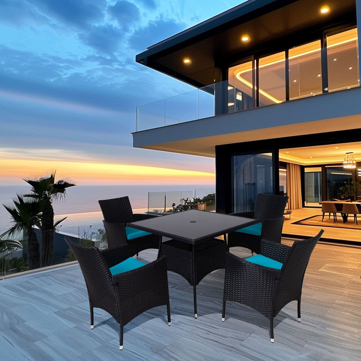 Questo set da pranzo da patio da 5 pezzi include un pratico tavolo da pranzo e 4 poltrone. Al centro del tavolo è presente un foro da 3,8 cm per l'ombrellone, che consente di aggiungere un ombrellone. Anche nelle calde giornate estive, potrete godere di un ambiente fresco quando cenate all'aperto. Questo set di mobili da patio crea un'area accogliente per il caffè del mattino o la cena. È la prima scelta per il tempo libero e i pasti all'aperto. Aggiungere questo splendido set da 5 pezzi in rattan al balcone, al giardino, al cortile o al portico sarà una combinazione perfetta.