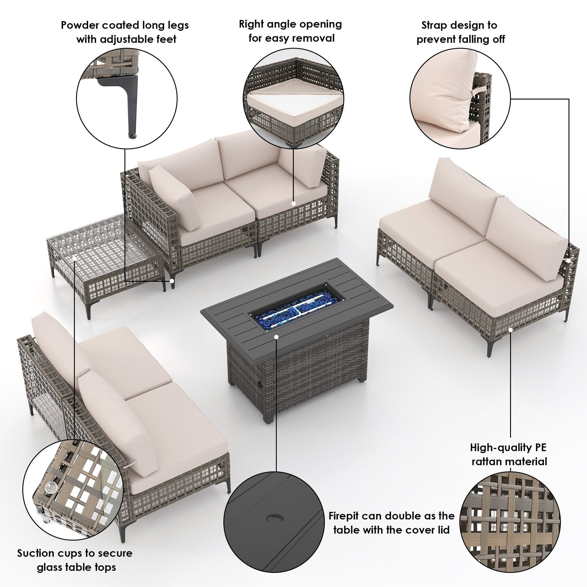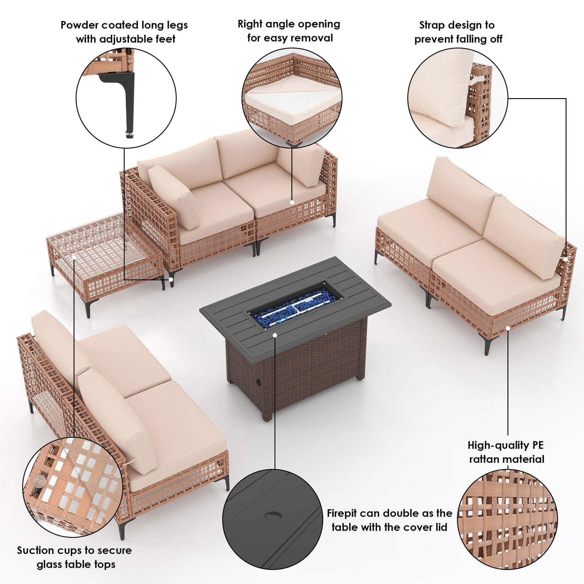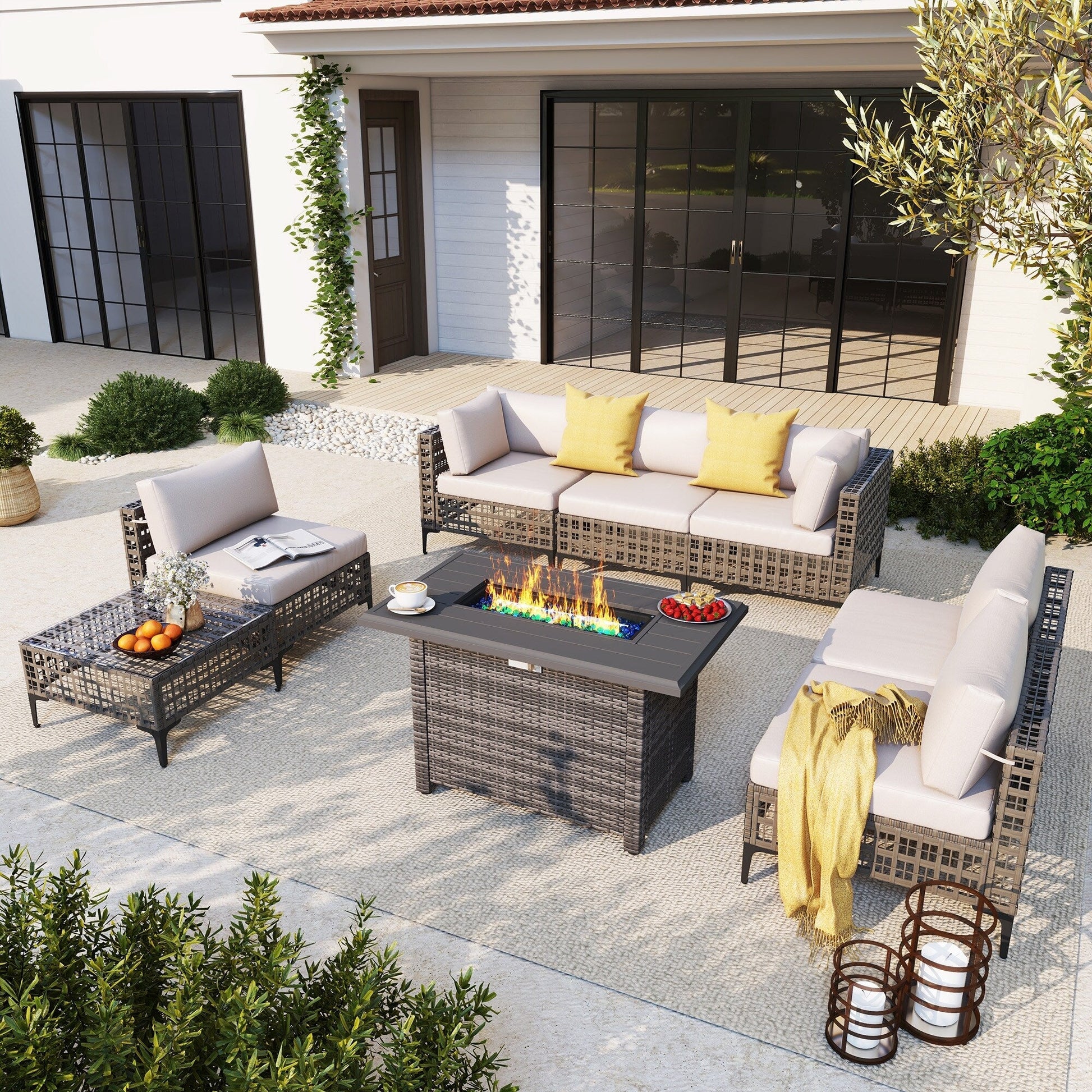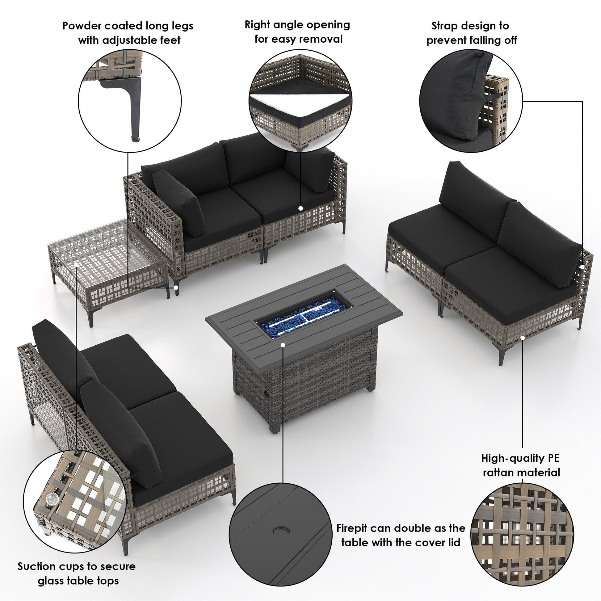 Gruppo di posti a sedere componibili per esterni da 6 persone con braciere