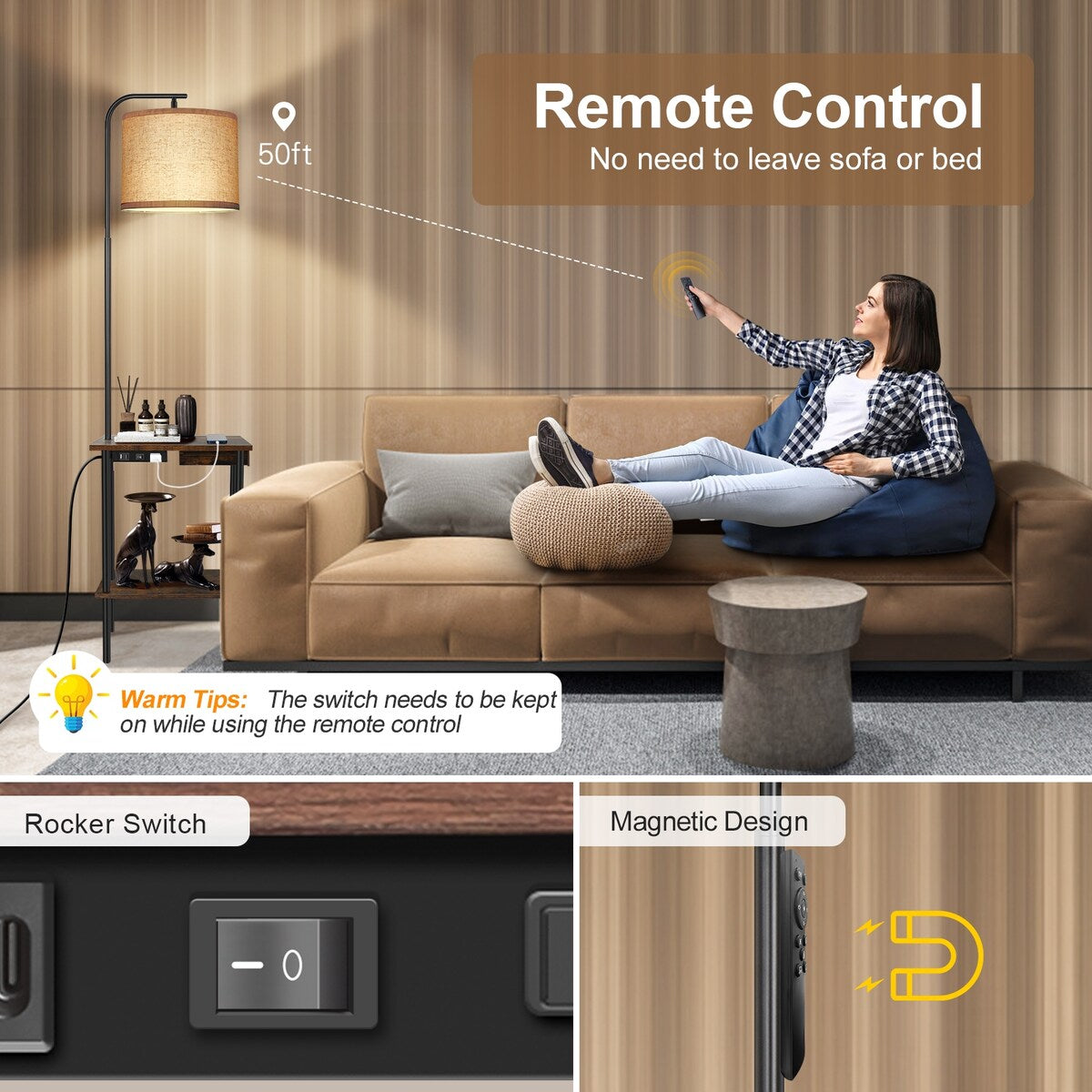 Questa lampada da terra con tavolino portariviste ha una duplice funzione. Non solo può appoggiare oggetti sul tavolo, ma fornisce anche illuminazione per la lettura. Abbinata a un telecomando magnetico portatile, può essere fissata ovunque e può essere regolata in base alla temperatura di colore e alla luminosità preferite, sempre e ovunque. Dispone di 5 modalità di scena integrate per una facile selezione.