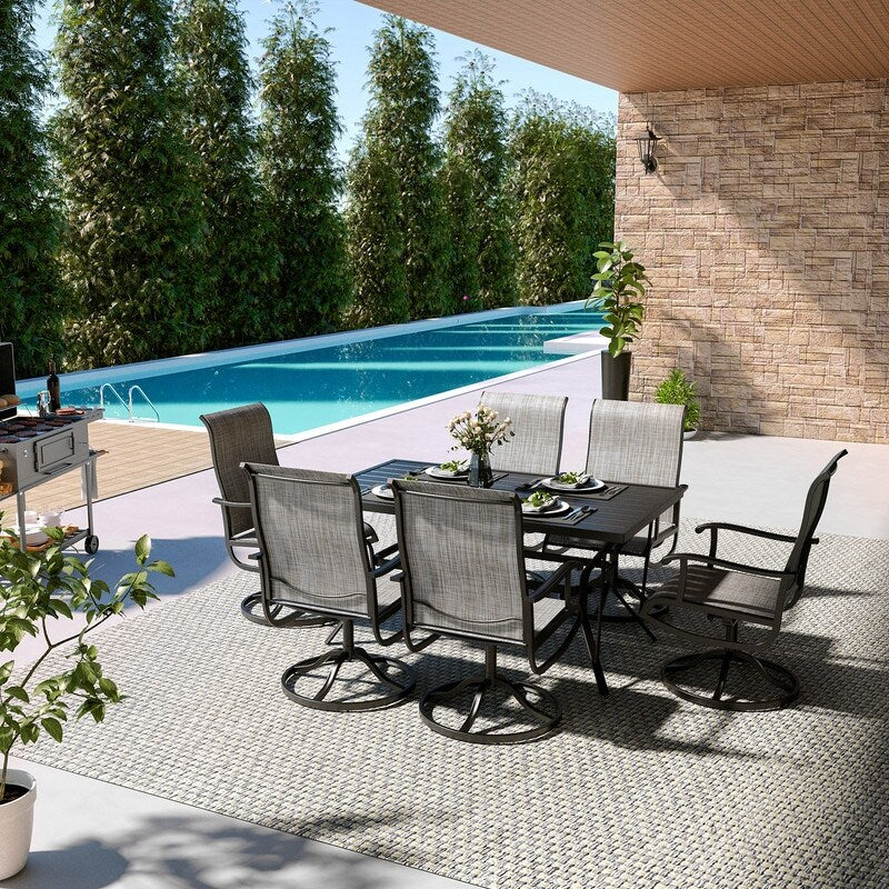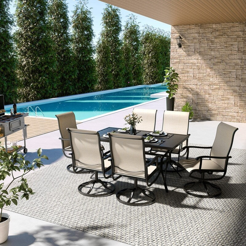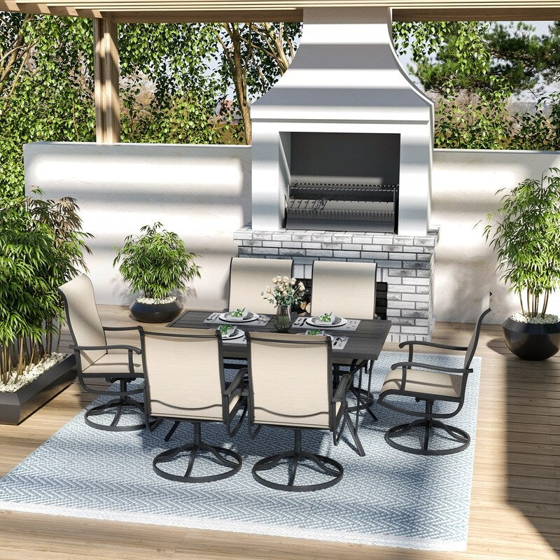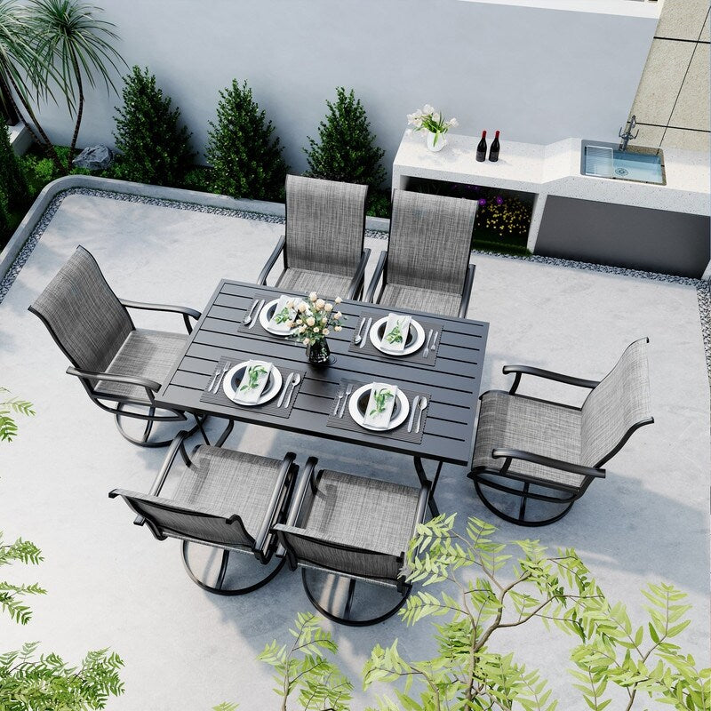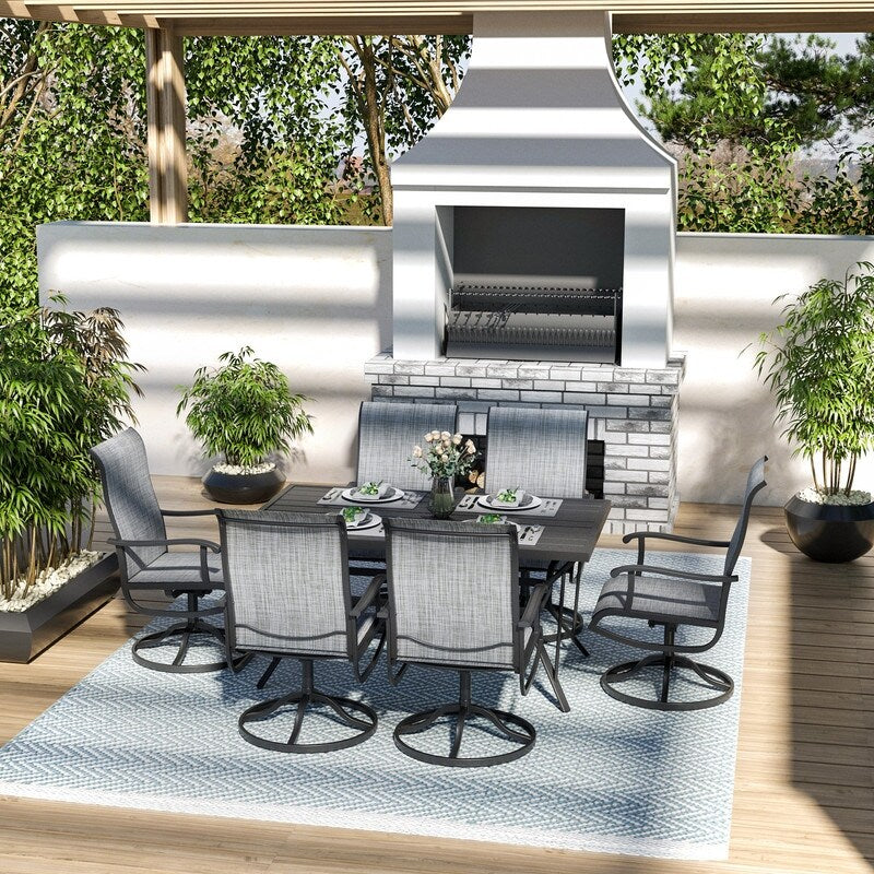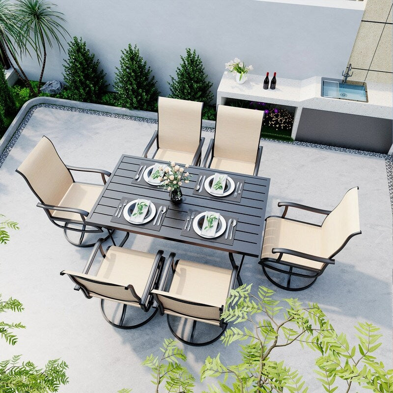 Set da pranzo per esterni in metallo da 7 pezzi con tavolo rettangolare e sedie girevoli in textilene
