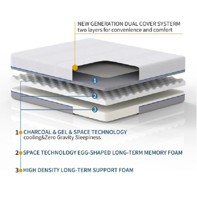 • Lo strato superiore del materasso è in memory foam Charcoal & Gel Space Technology. La schiuma traspirante perforata aiuta a ridurre il calore. I piccoli fori allontanano l'aria calda e il calore corporeo, donandoti freschezza e sonnolenza in assenza di gravità. La base in schiuma resistente previene l'affondamento e il cedimento e sostiene tutto il corpo. Questo materasso offre tre strati di schiuma premium certificata CertiPUR-US per una combinazione di supporto, traspirabilità e comfort.