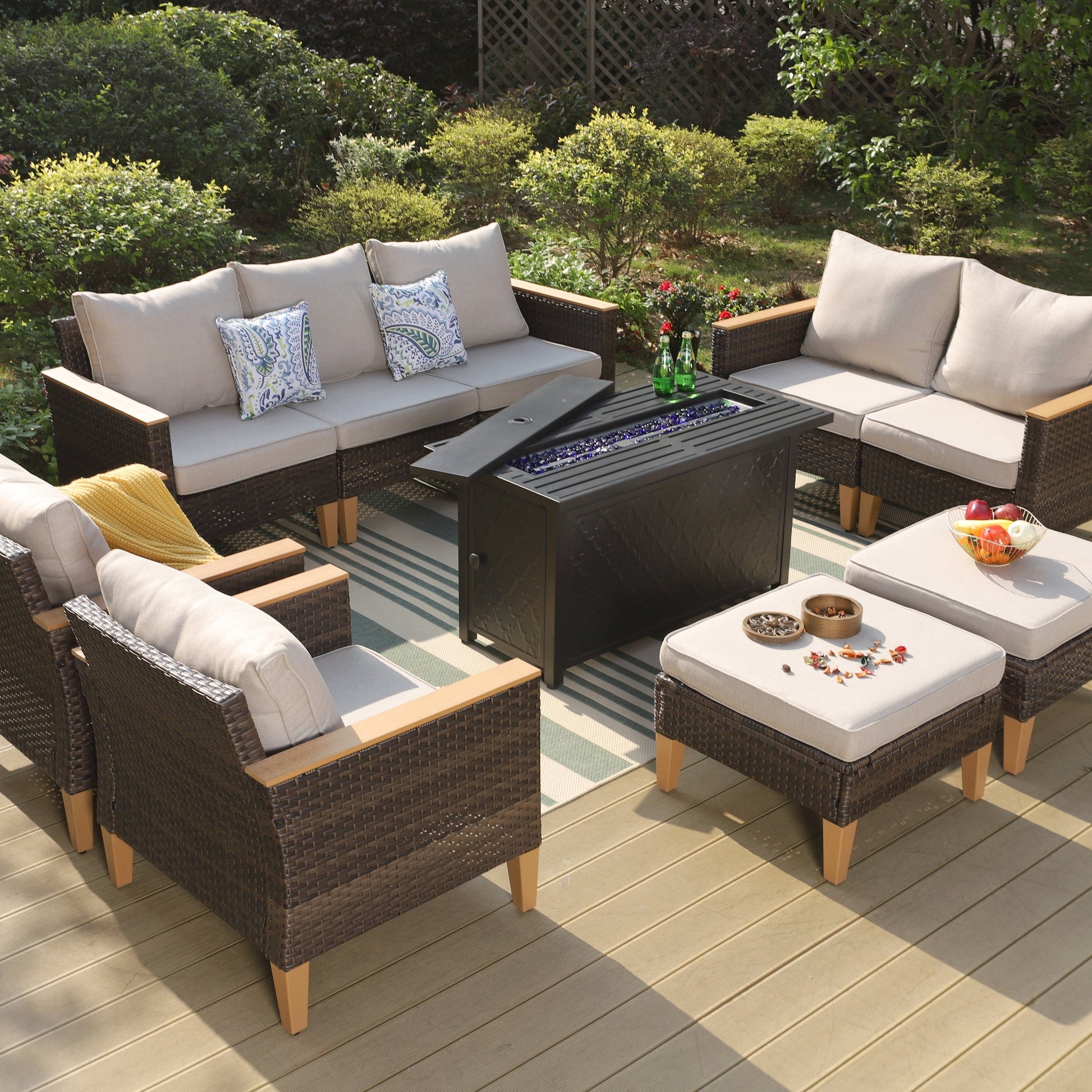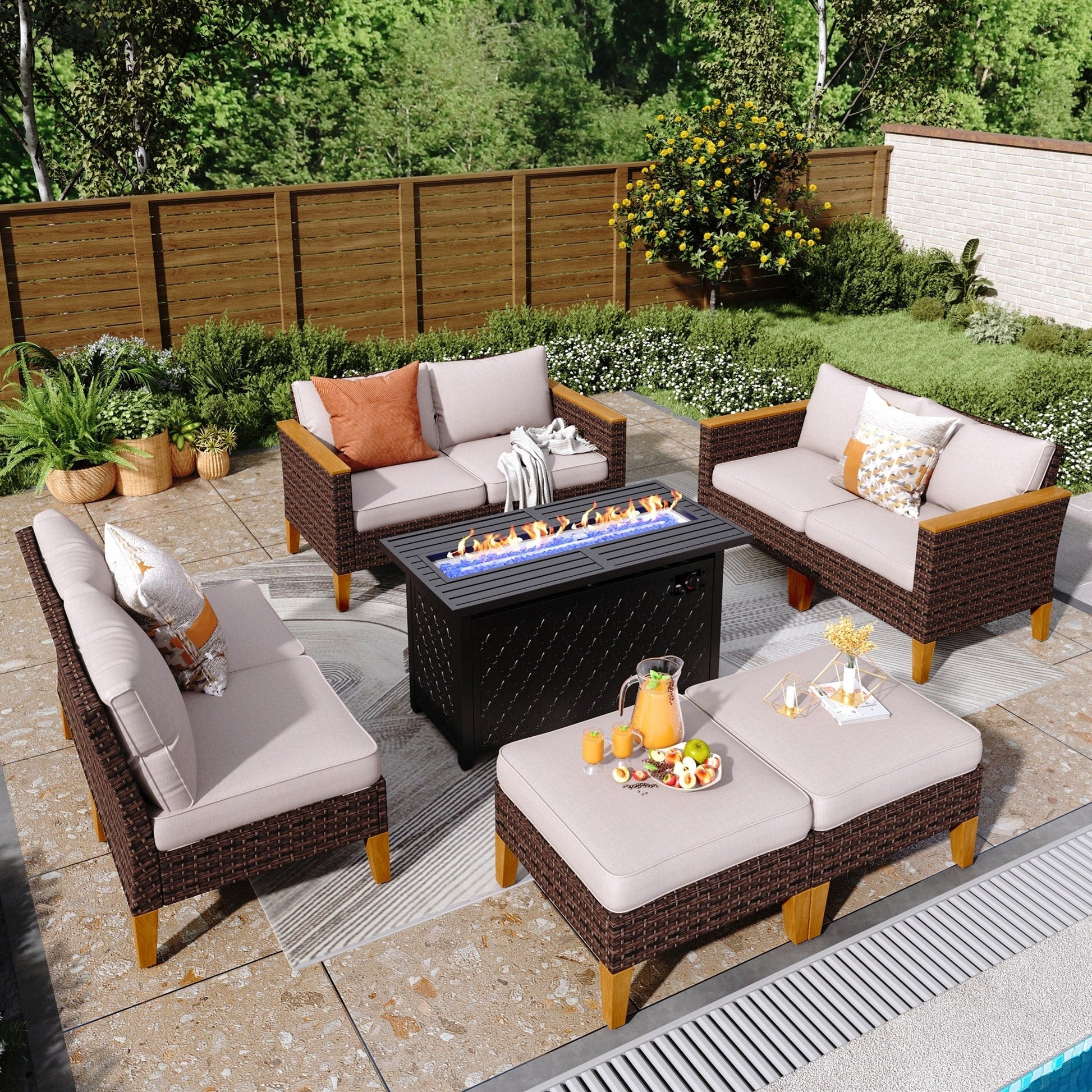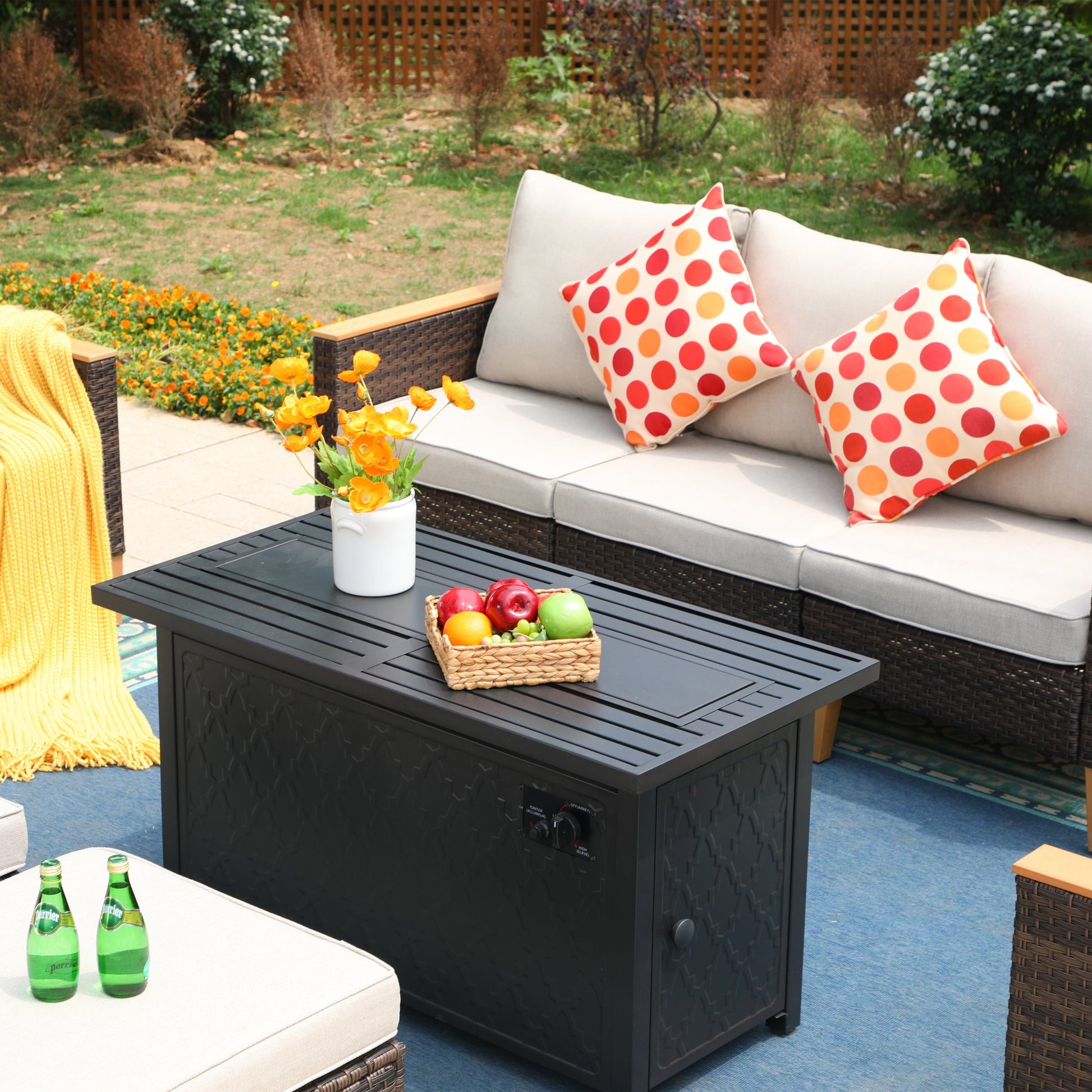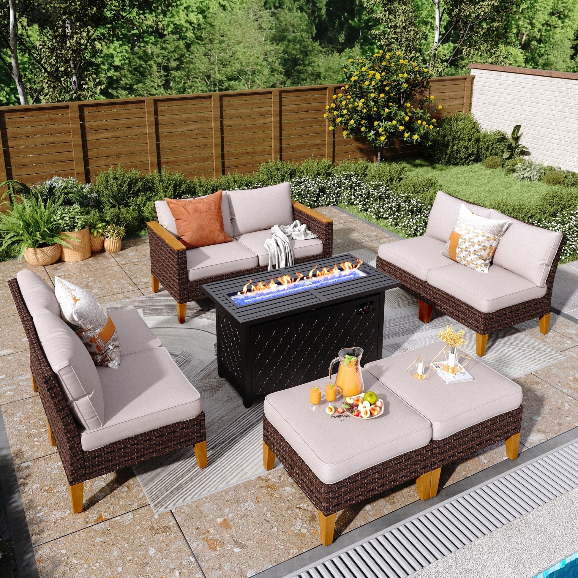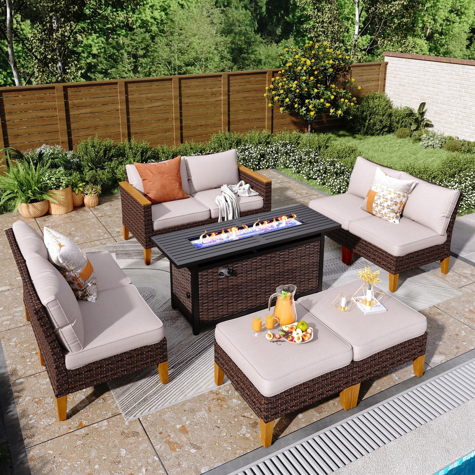 Set di divani componibili per patio liberamente combinabili : questo set di mobili da giardino include un divano a 3 posti, un divano a 2 posti, un divano singolo con braccioli, un divano senza braccioli, un pouf e un tavolo con braciere a gas propano da 45 piedi, consentendoti di creare la configurazione perfetta per adattarla al tuo spazio esterno. Si adatta perfettamente al tuo giardino, cortile, balcone o bordo piscina per creare una confortevole zona relax o per avvicinarti alla splendida natura con la famiglia e gli amici.