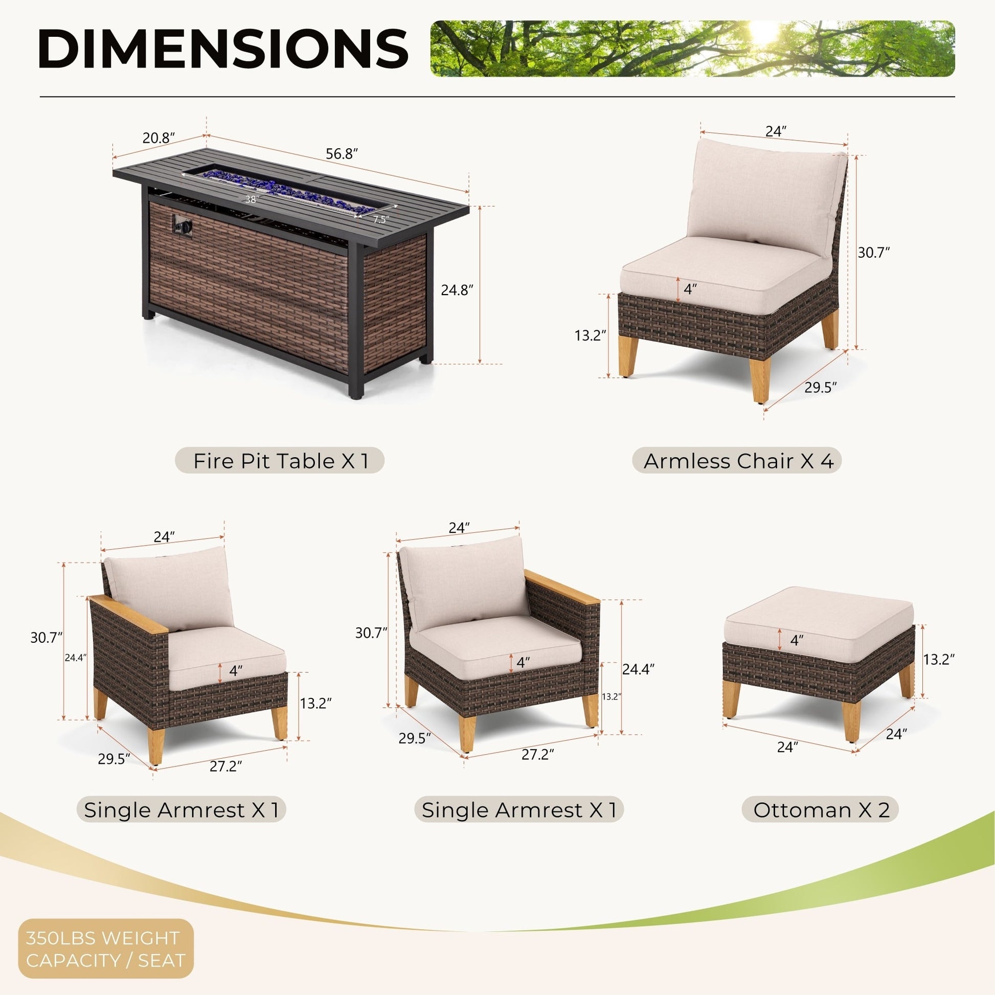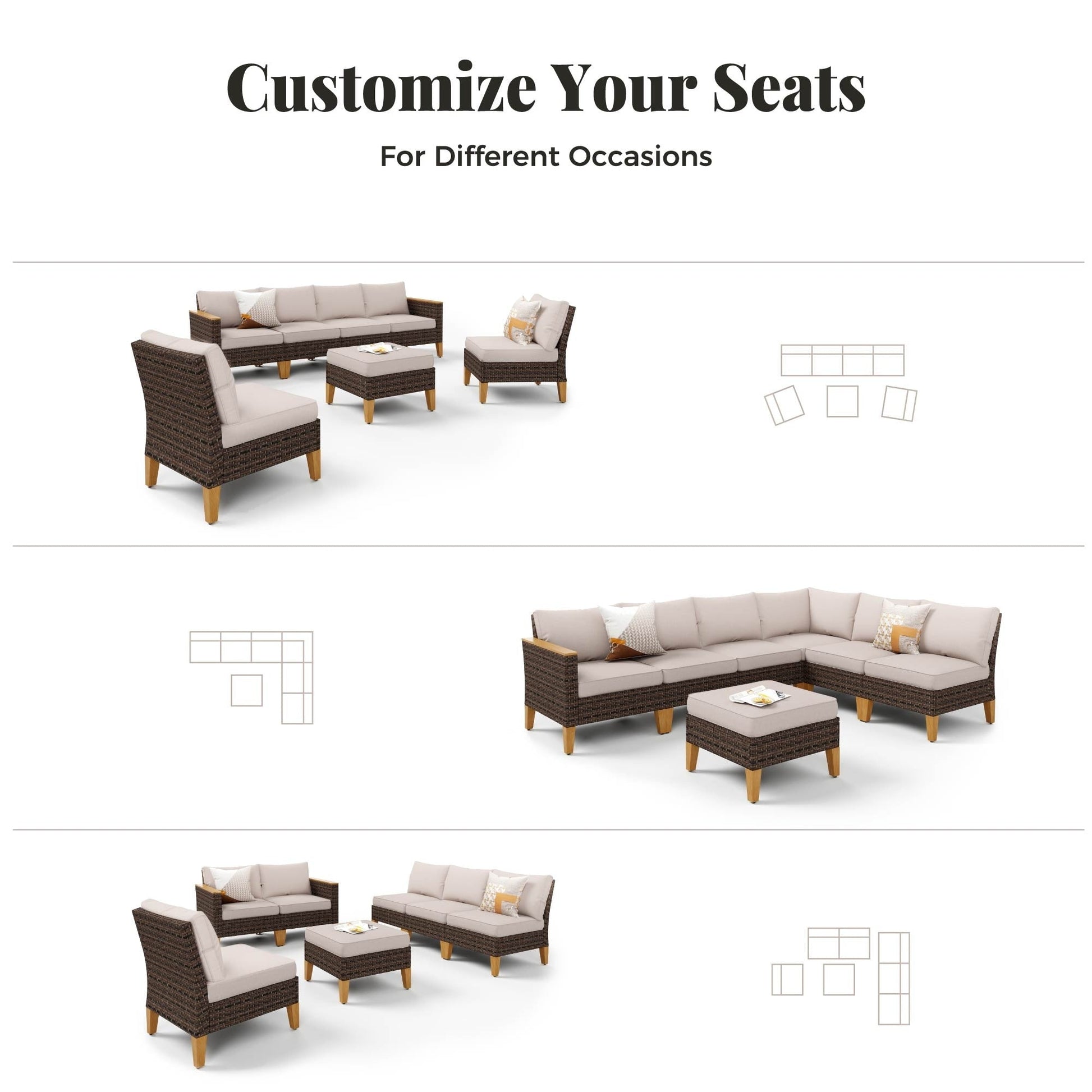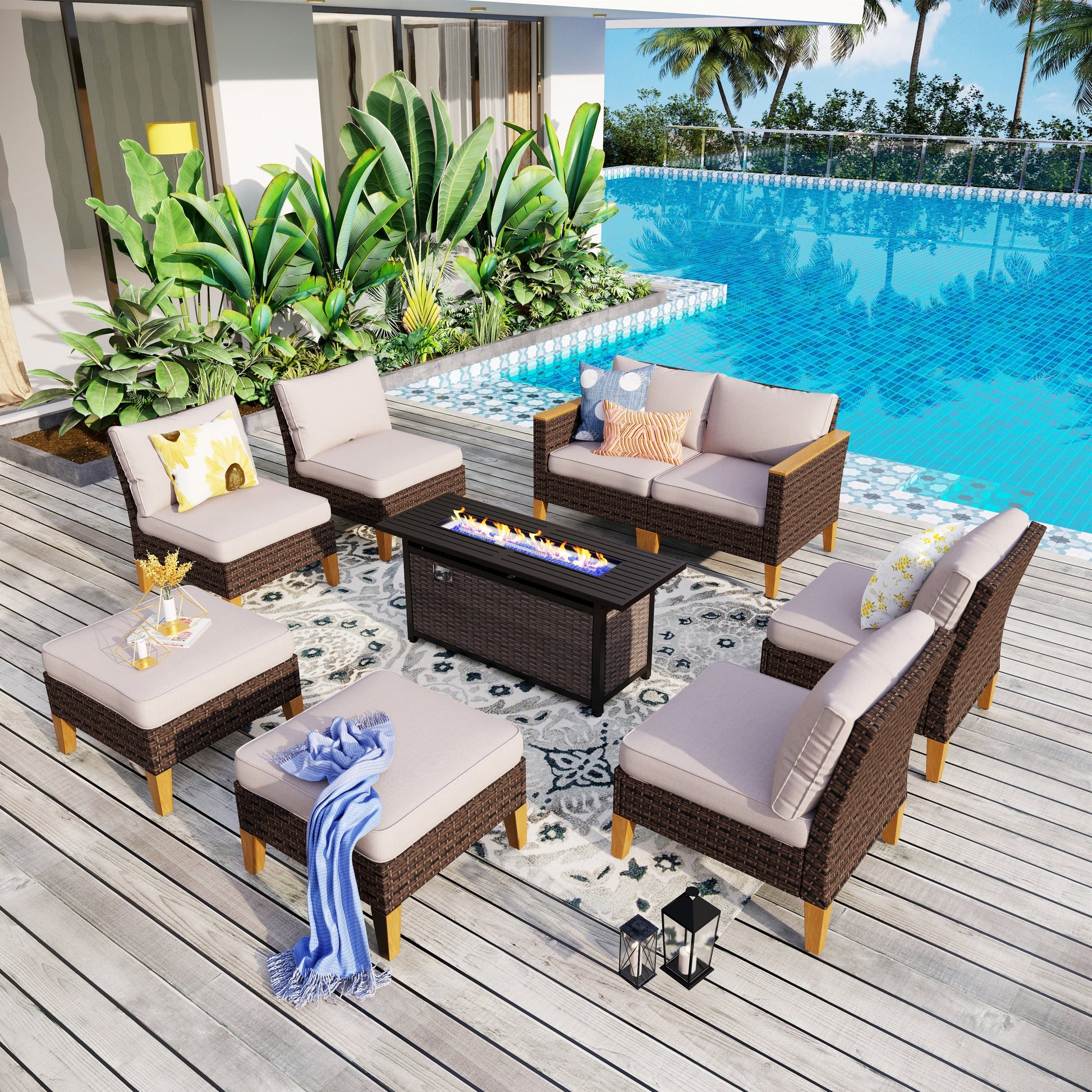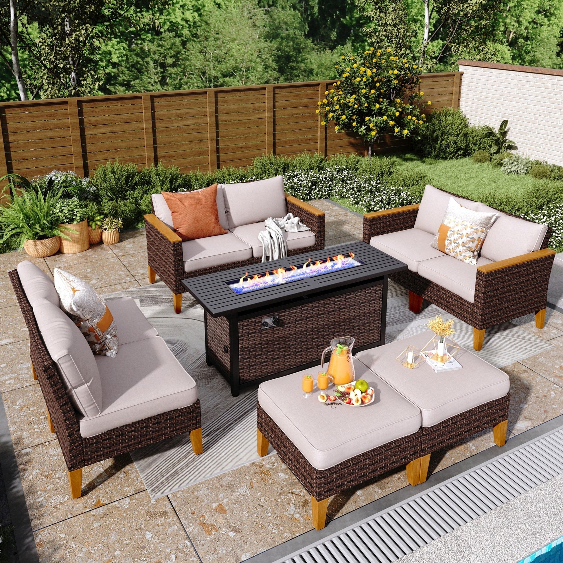 Set di divani componibili per patio liberamente combinabili : questo set di mobili da giardino include un divano a 3 posti, un divano a 2 posti, un divano singolo con braccioli, un divano senza braccioli, un pouf e un tavolo con braciere a gas propano da 45 piedi, consentendoti di creare la configurazione perfetta per adattarla al tuo spazio esterno. Si adatta perfettamente al tuo giardino, cortile, balcone o bordo piscina per creare una confortevole zona relax o per avvicinarti alla splendida natura con la famiglia e gli amici.