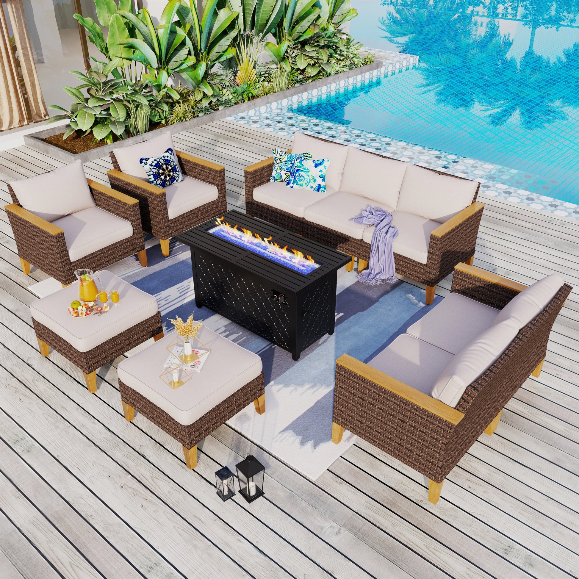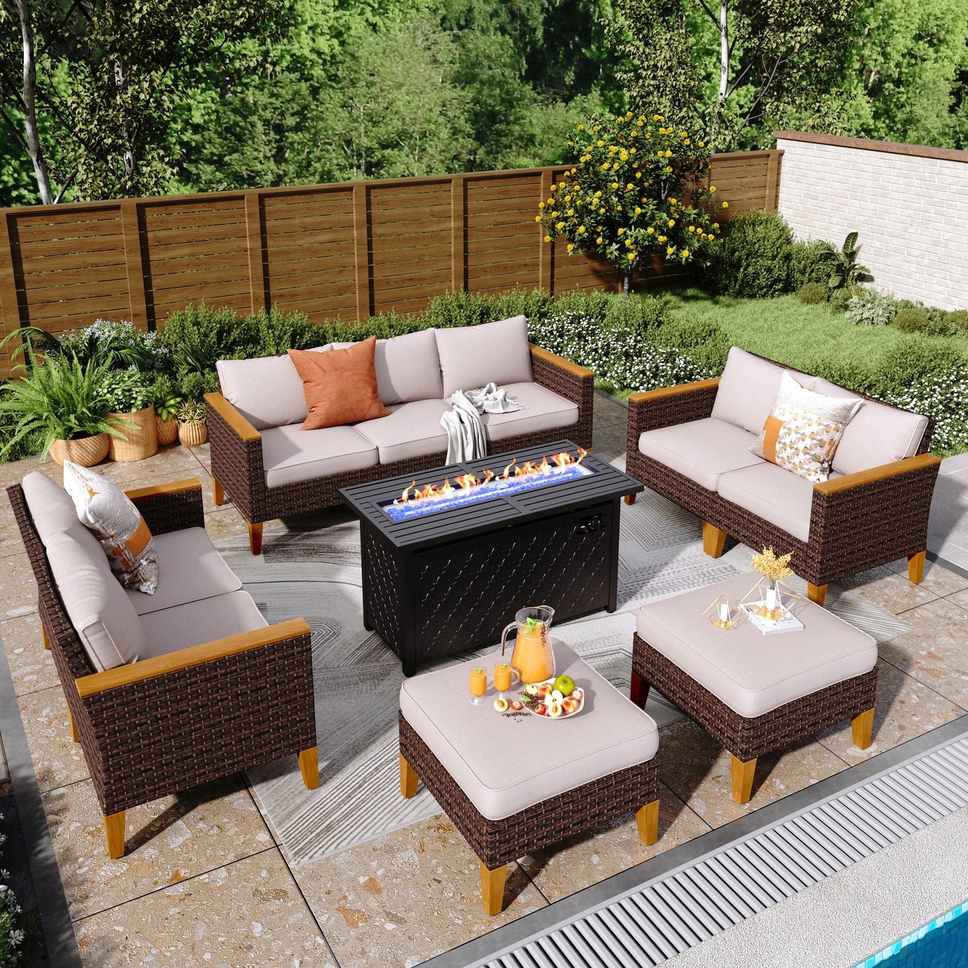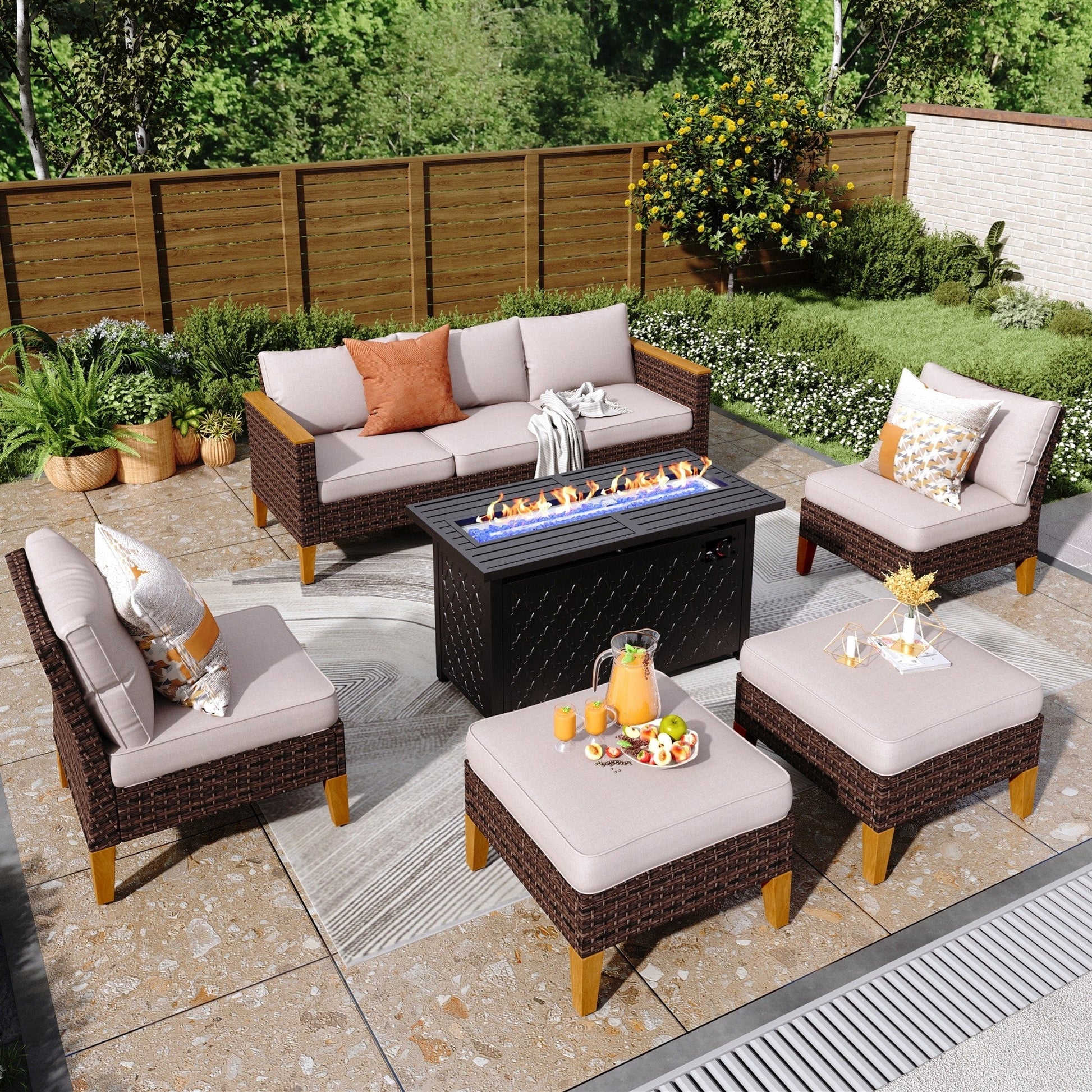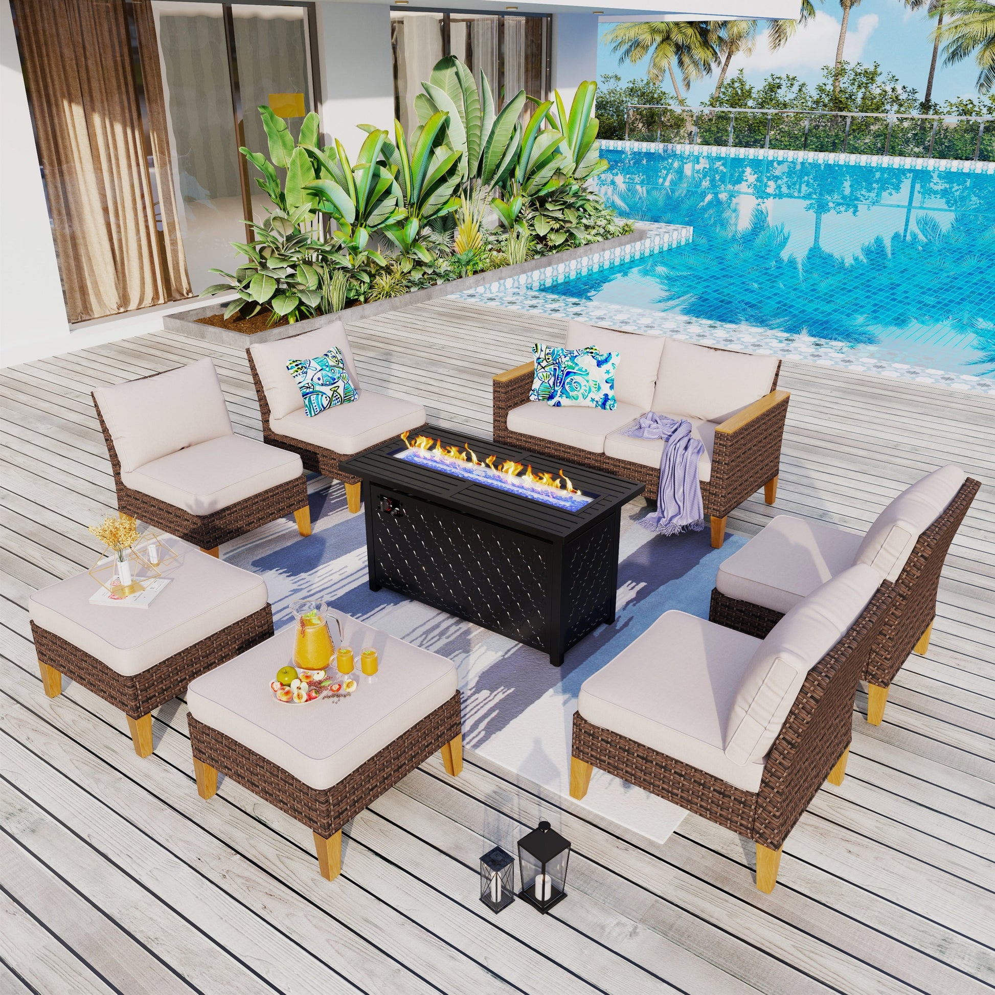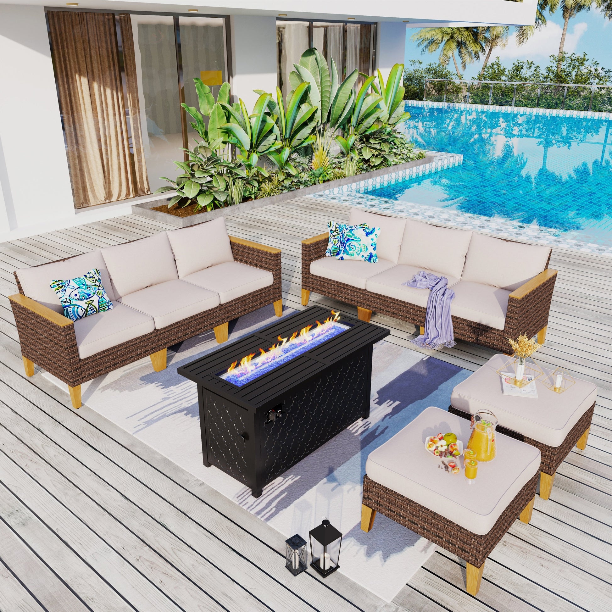 Set di divani componibili per patio liberamente combinabili : questo set di mobili da giardino include un divano a 3 posti, un divano a 2 posti, un divano singolo con braccioli, un divano senza braccioli, un pouf e un tavolo con braciere a gas propano da 45 piedi, consentendoti di creare la configurazione perfetta per adattarla al tuo spazio esterno. Si adatta perfettamente al tuo giardino, cortile, balcone o bordo piscina per creare una confortevole zona relax o per avvicinarti alla splendida natura con la famiglia e gli amici.