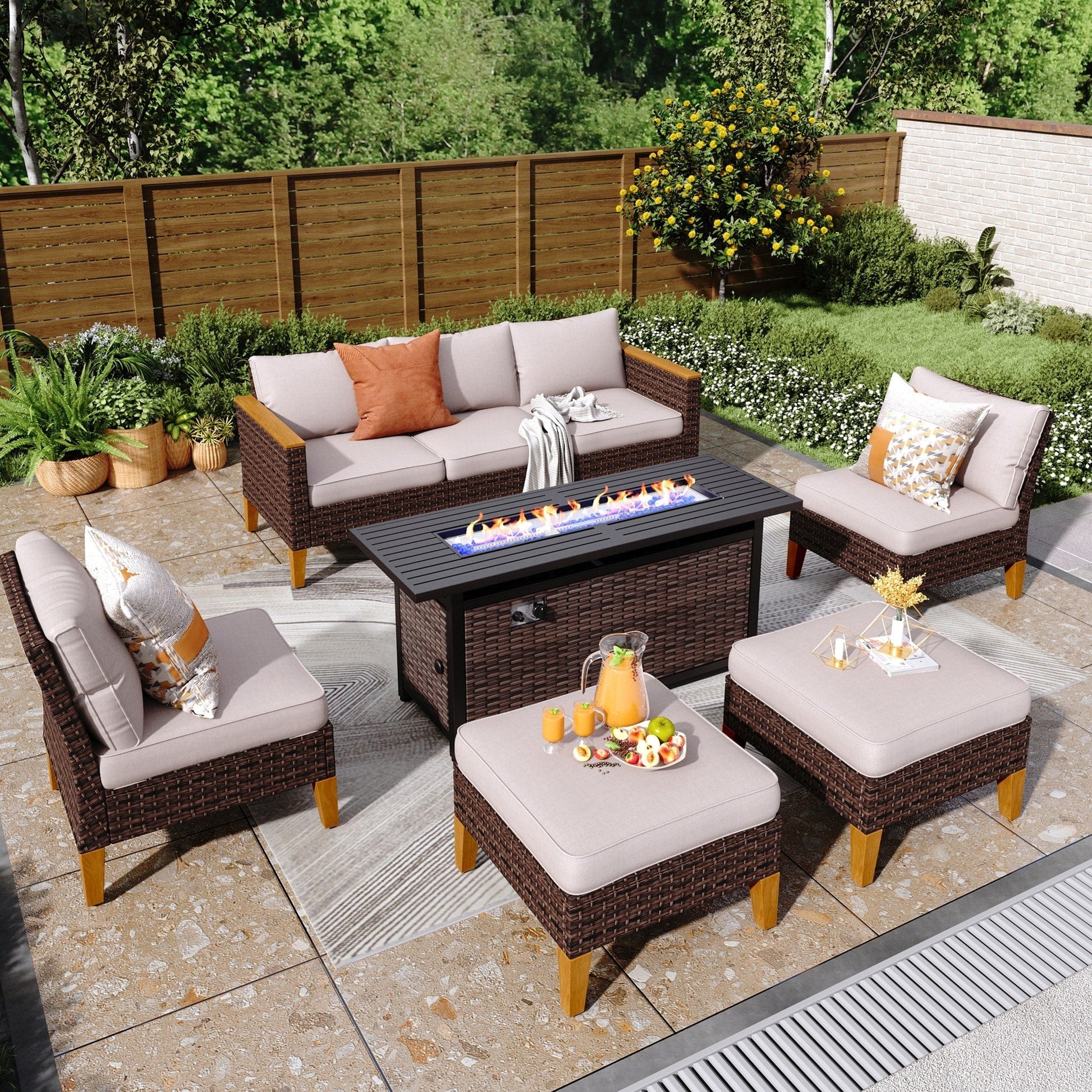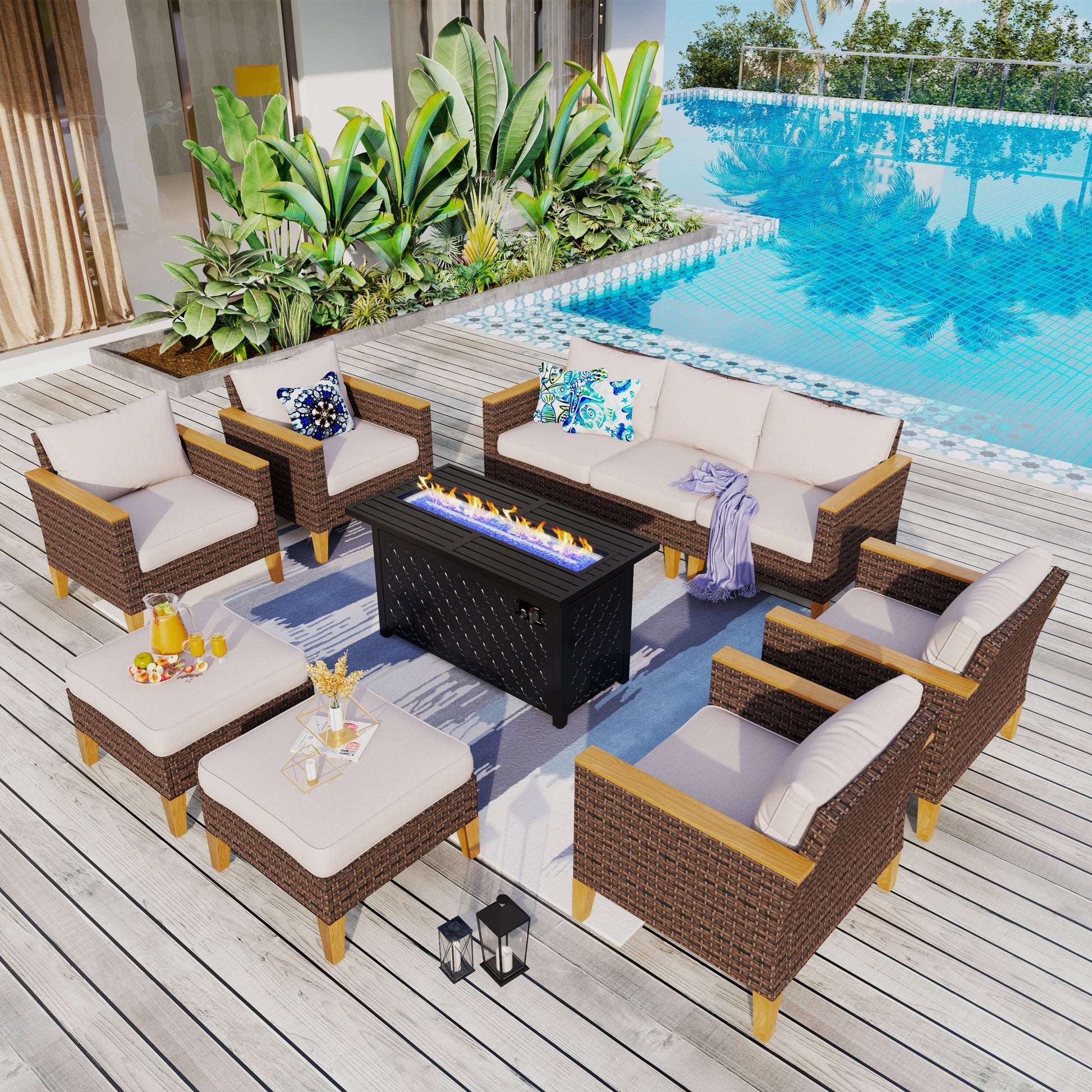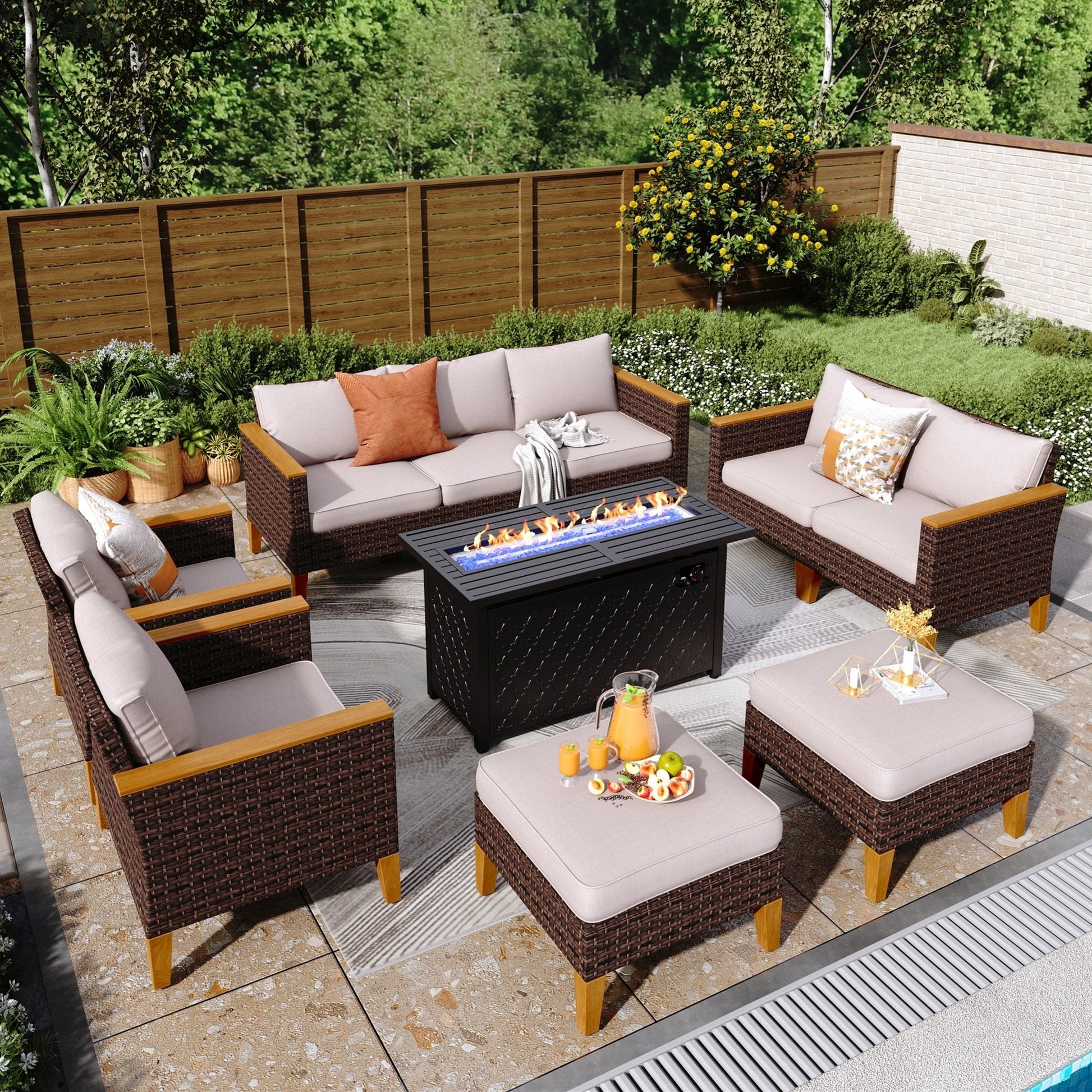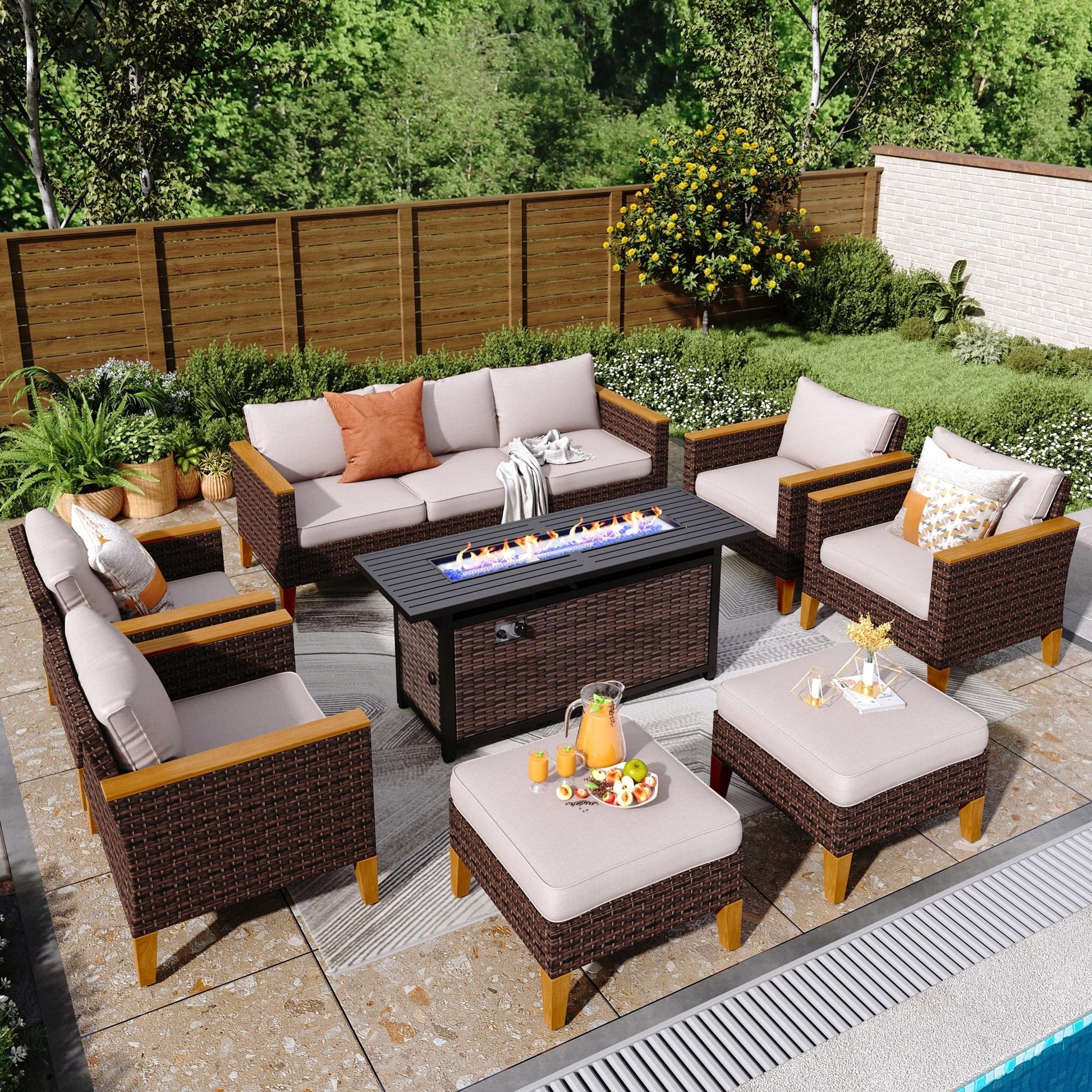 Set di divani componibili per patio liberamente combinabili : questo set di mobili da giardino include un divano a 3 posti, un divano a 2 posti, un divano singolo con braccioli, un divano senza braccioli, un pouf e un tavolo con braciere a gas propano da 45 piedi, consentendoti di creare la configurazione perfetta per adattarla al tuo spazio esterno. Si adatta perfettamente al tuo giardino, cortile, balcone o bordo piscina per creare una confortevole zona relax o per avvicinarti alla splendida natura con la famiglia e gli amici.