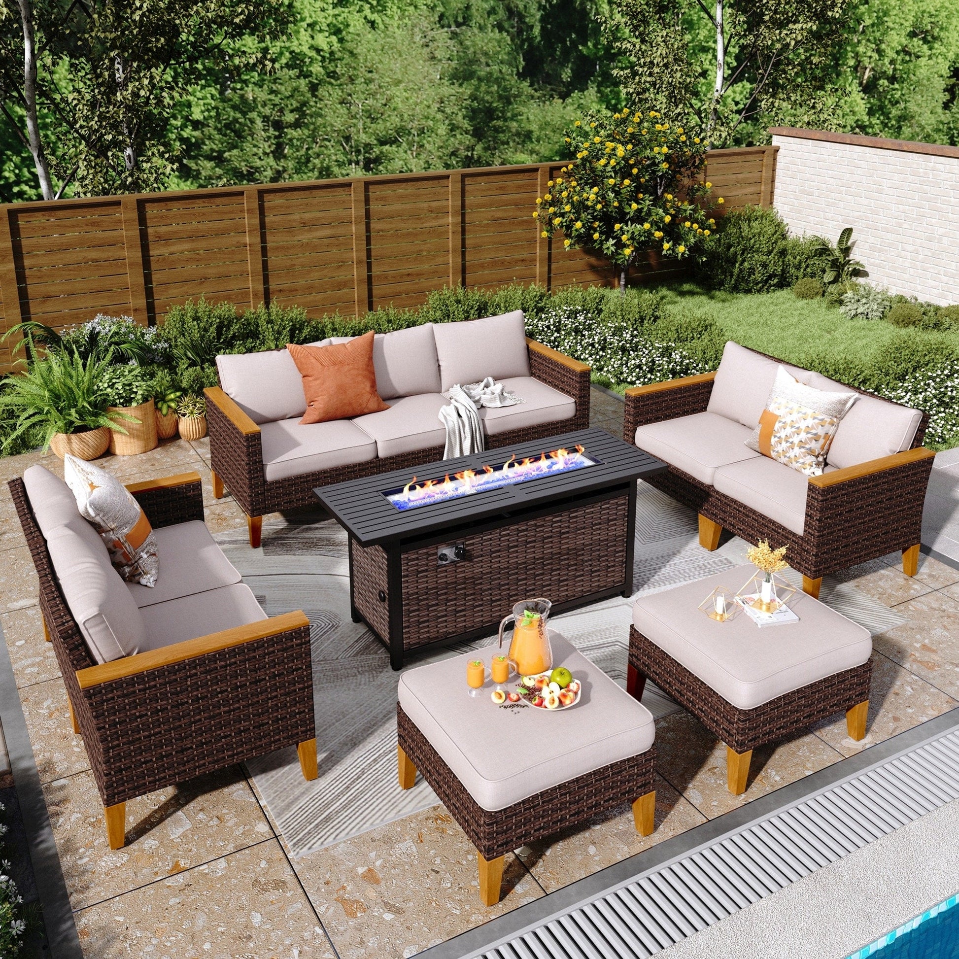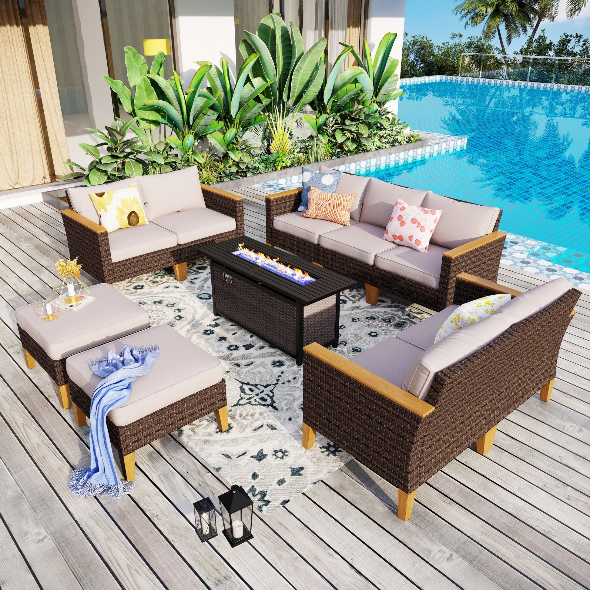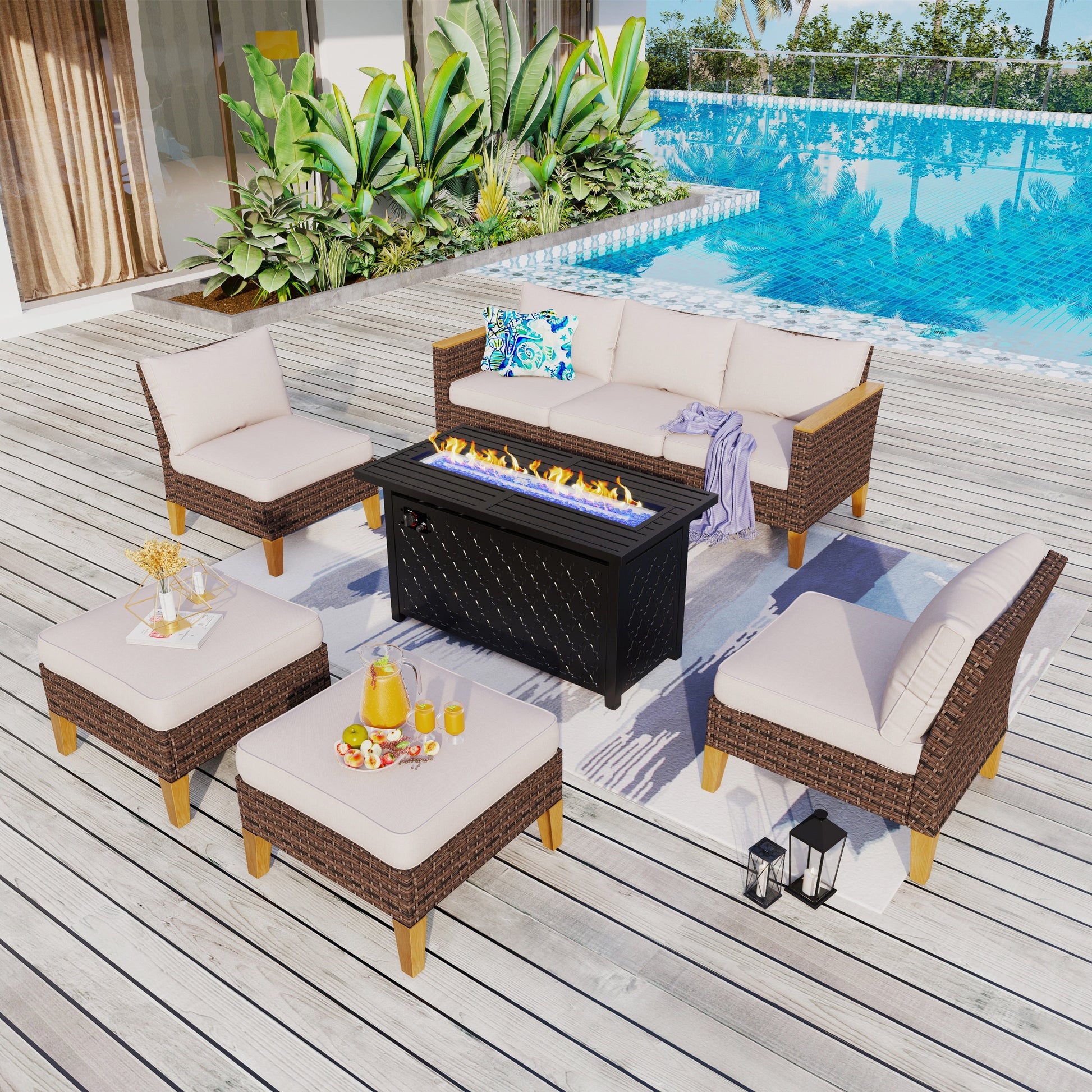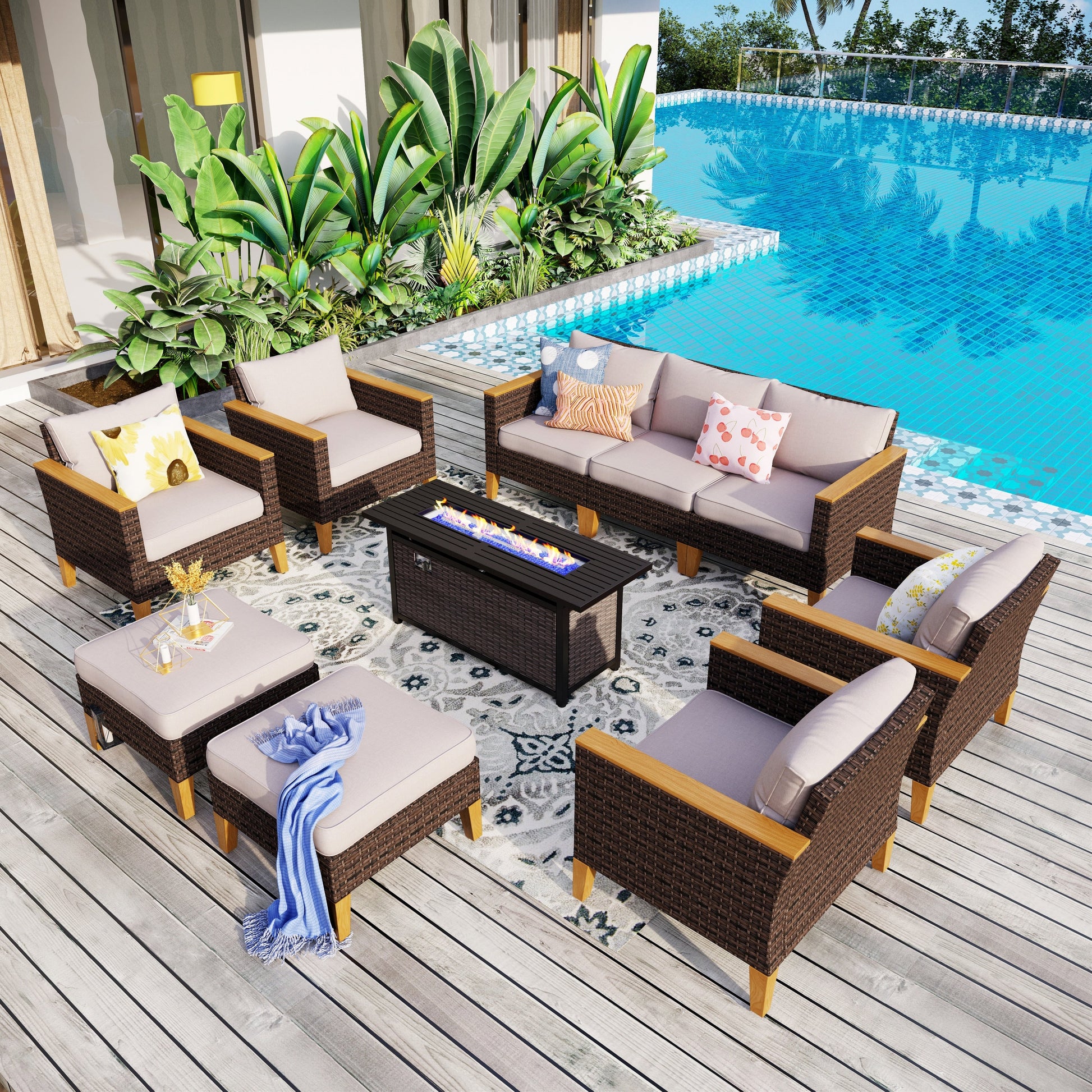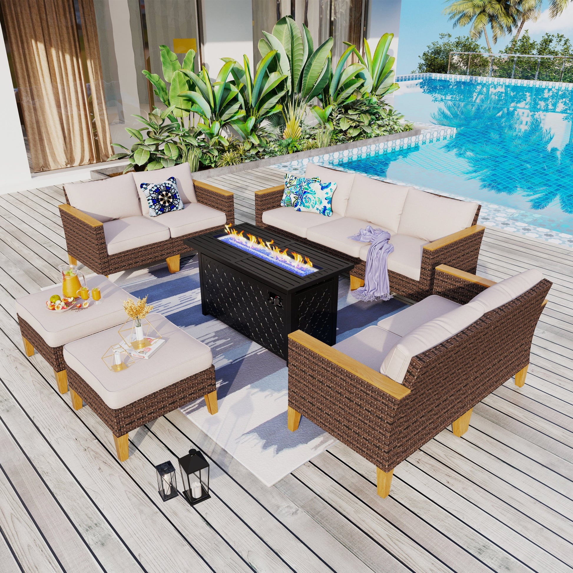 Set di divani componibili per patio liberamente combinabili : questo set di mobili da giardino include un divano a 3 posti, un divano a 2 posti, un divano singolo con braccioli, un divano senza braccioli, un pouf e un tavolo con braciere a gas propano da 45 piedi, consentendoti di creare la configurazione perfetta per adattarla al tuo spazio esterno. Si adatta perfettamente al tuo giardino, cortile, balcone o bordo piscina per creare una confortevole zona relax o per avvicinarti alla splendida natura con la famiglia e gli amici.