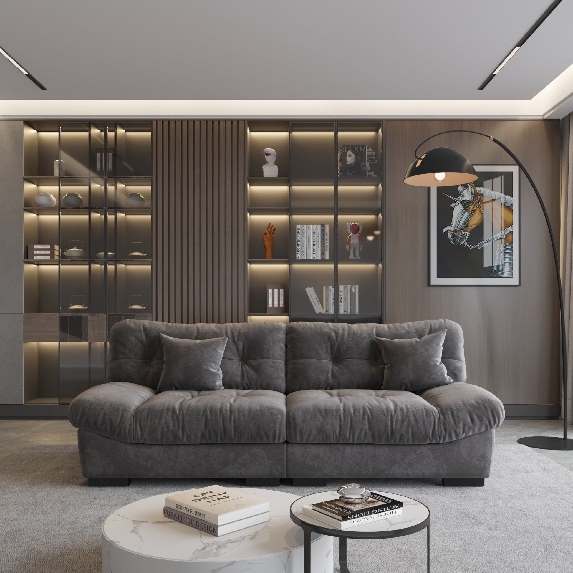 [Divano Cloud Comfort] Realizzato in velluto satinato di alta qualità, imbottito con l'80% di spugna, il 15% di cotone per bambole e il 5% di piumino. Il divano Cloud a tre posti è resistente all'usura, alle pieghe, non si deforma e rimane come nuovo anche dopo un uso prolungato. Costruito con struttura in pino, morbidezza e durezza moderate, comodo da sedersi, ripristinando il rilassamento naturale. Capacità massima: 500 libbre per posto.