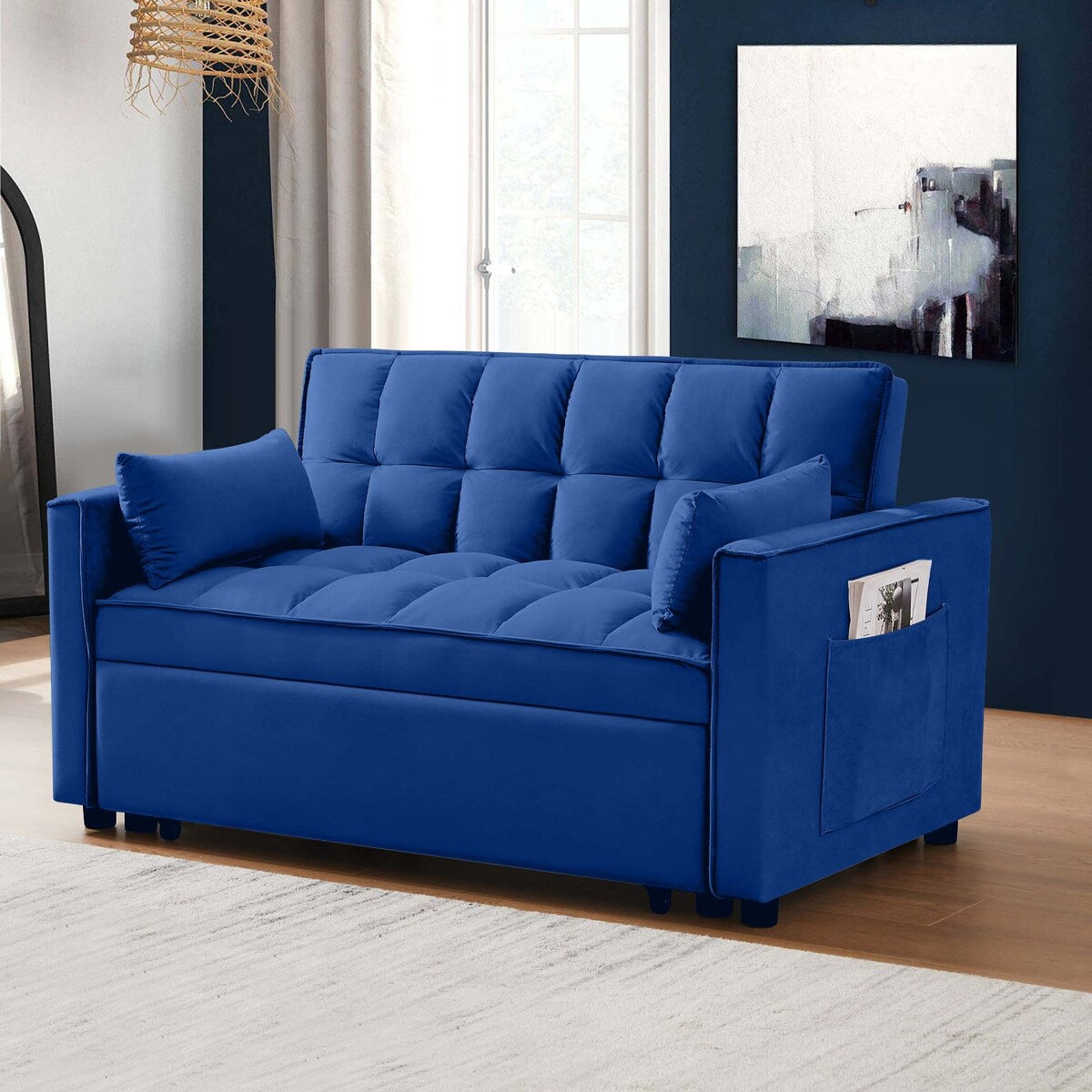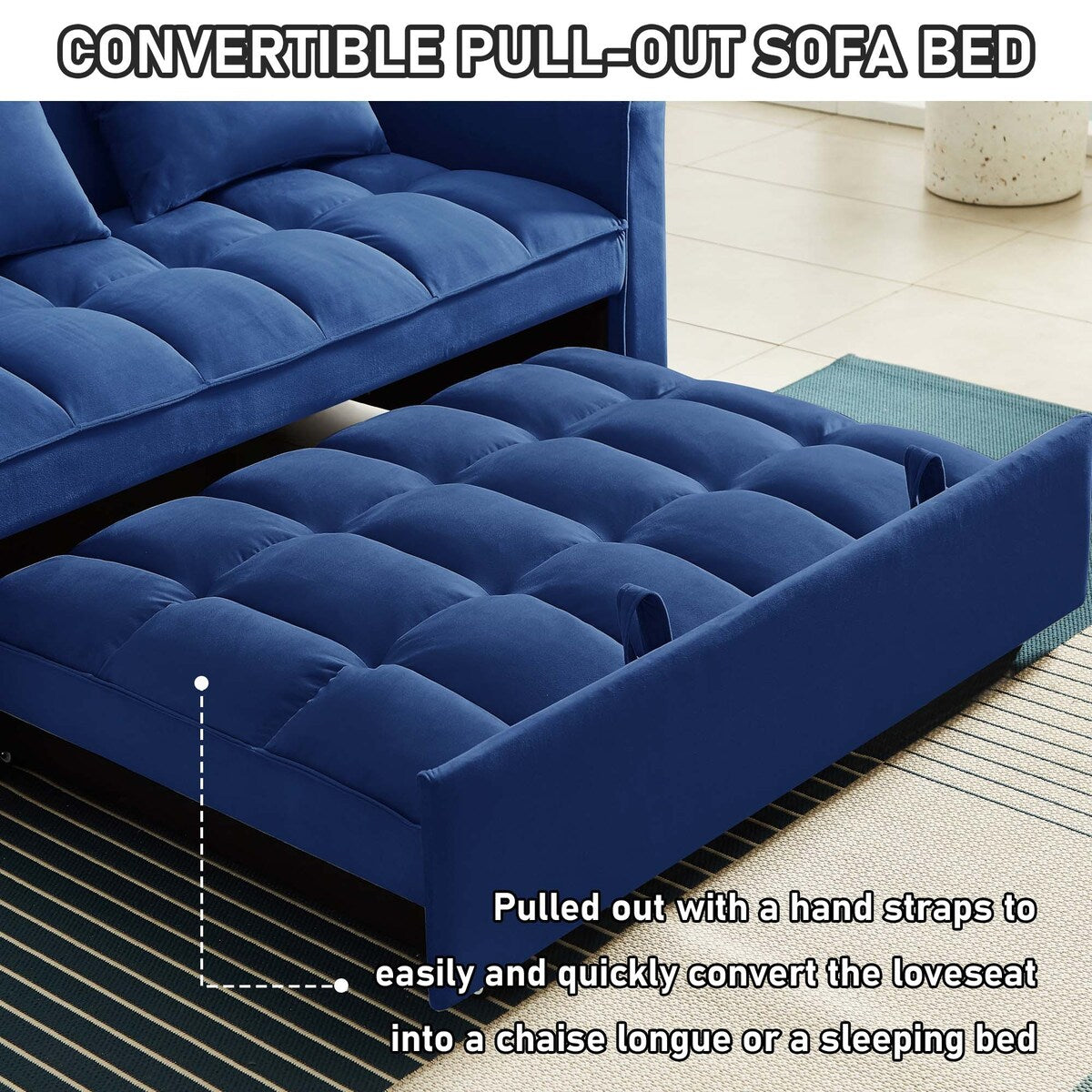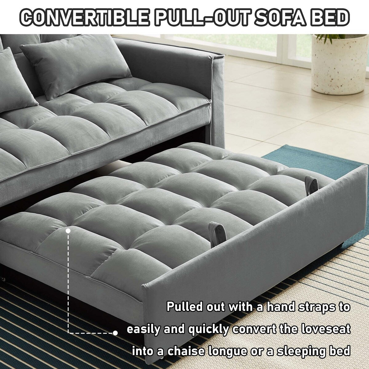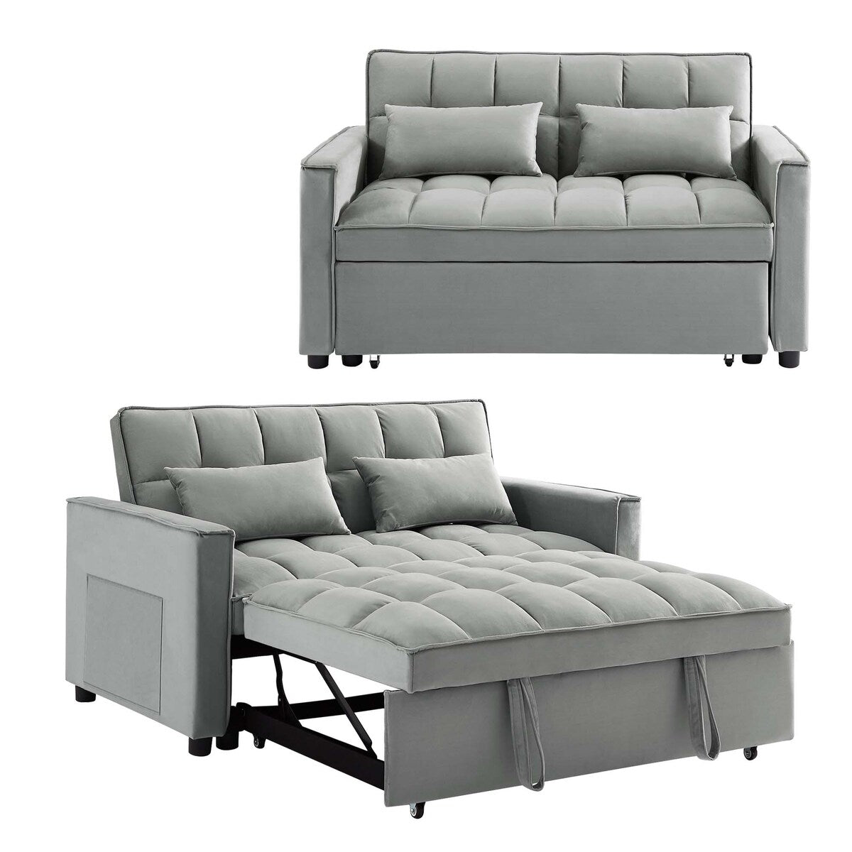 Per un piccolo soggiorno o una camera da letto, questo divano a due posti con letto estraibile è assolutamente il complemento d'arredo perfetto. All'occorrenza, questo divano a due posti può essere convertito in un letto per soddisfare le vostre esigenze di sonno. Dotato di schienale ergonomico regolabile, braccioli quadrati con tasche laterali portaoggetti. Appoggiate delicatamente lo schienale su questo morbido divano per rilassare la schiena e alleviare la stanchezza della giornata. Include due cuscini, tessuto in velluto, morbido e delicato, buona permeabilità all'aria e buona resistenza all'usura. Il cuscino della seduta imbottito in spugna ad alta densità è pieno di morbidezza e il divano non si piegherà dopo essere stati seduti a lungo. Questo divano letto convertibile ha gambe in plastica per sostenervi saldamente e garantire un'eccellente stabilità, proteggendo al contempo il pavimento dai graffi.