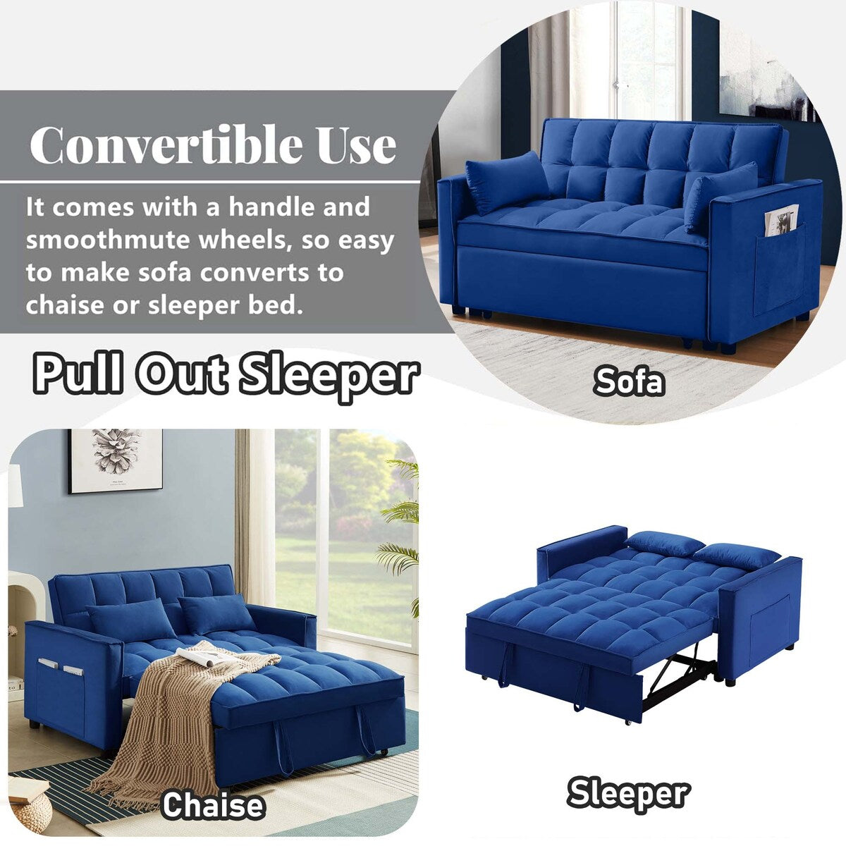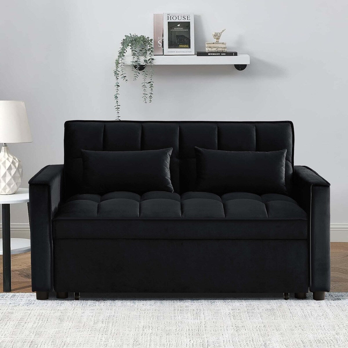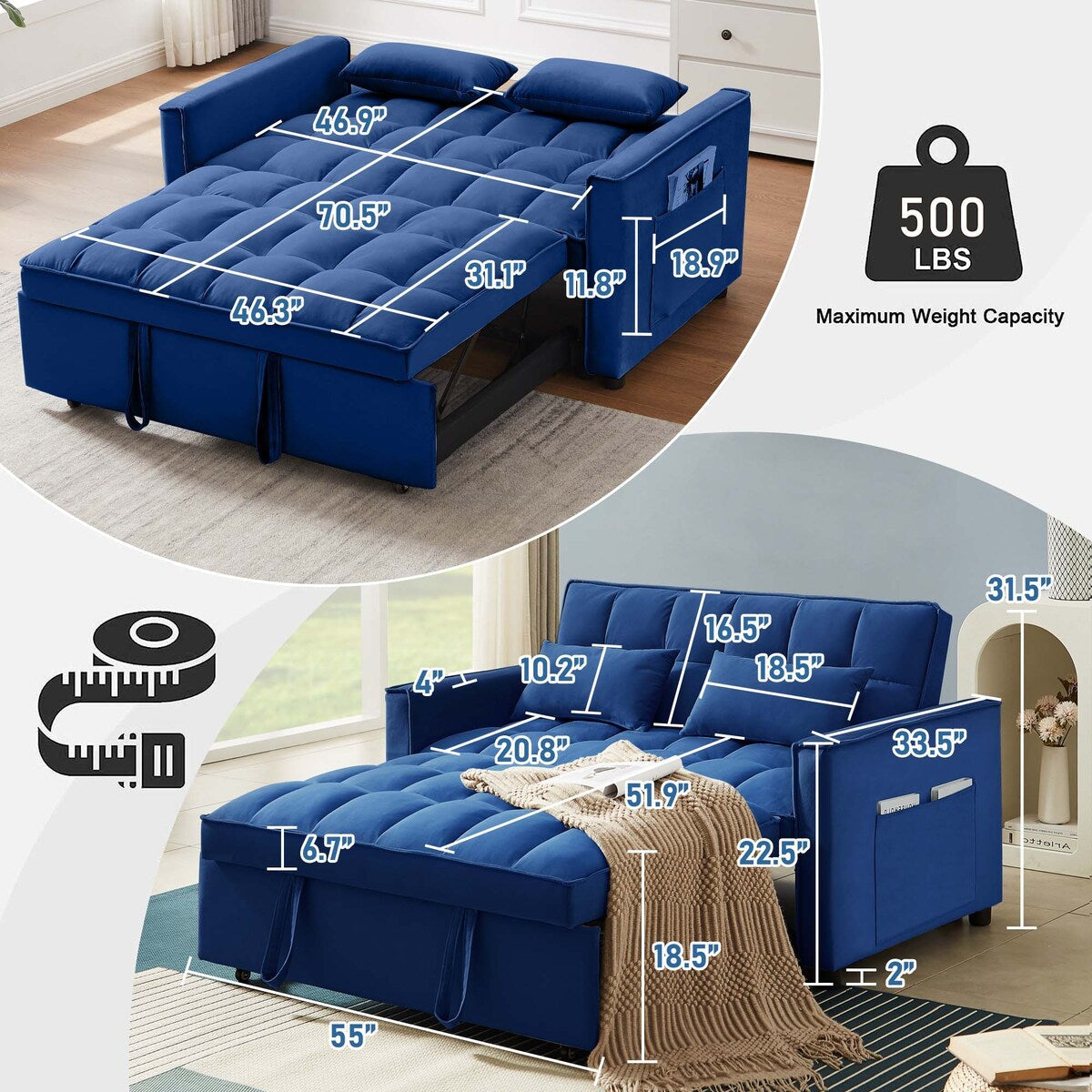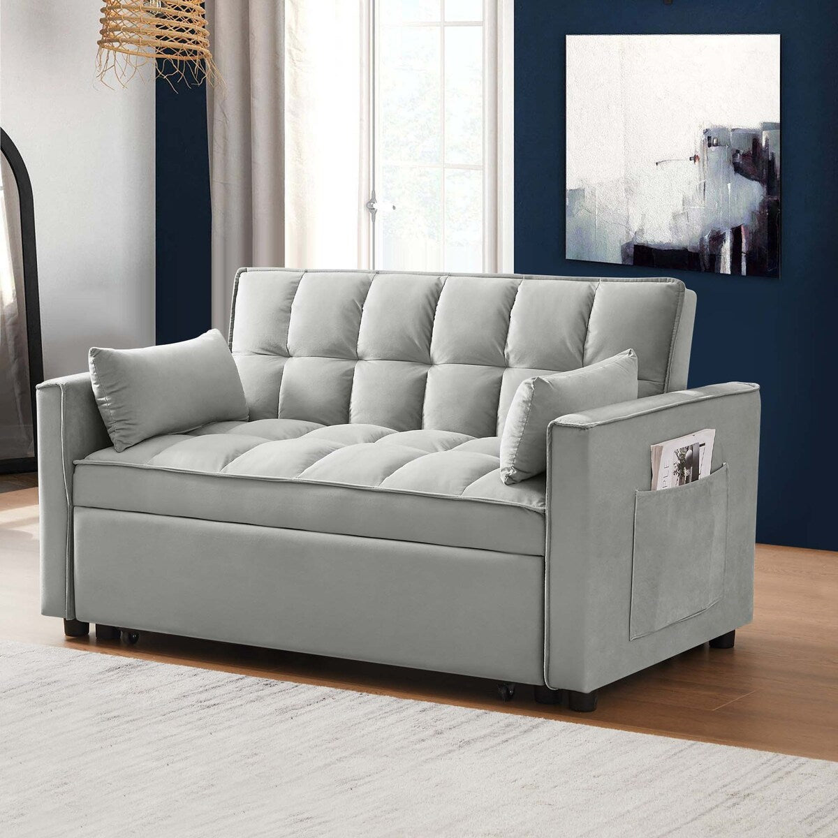 Per un piccolo soggiorno o una camera da letto, questo divano a due posti con letto estraibile è assolutamente il complemento d'arredo perfetto. All'occorrenza, questo divano a due posti può essere convertito in un letto per soddisfare le vostre esigenze di sonno. Dotato di schienale ergonomico regolabile, braccioli quadrati con tasche laterali portaoggetti. Appoggiate delicatamente lo schienale su questo morbido divano per rilassare la schiena e alleviare la stanchezza della giornata. Include due cuscini, tessuto in velluto, morbido e delicato, buona permeabilità all'aria e buona resistenza all'usura. Il cuscino della seduta imbottito in spugna ad alta densità è pieno di morbidezza e il divano non si piegherà dopo essere stati seduti a lungo. Questo divano letto convertibile ha gambe in plastica per sostenervi saldamente e garantire un'eccellente stabilità, proteggendo al contempo il pavimento dai graffi.