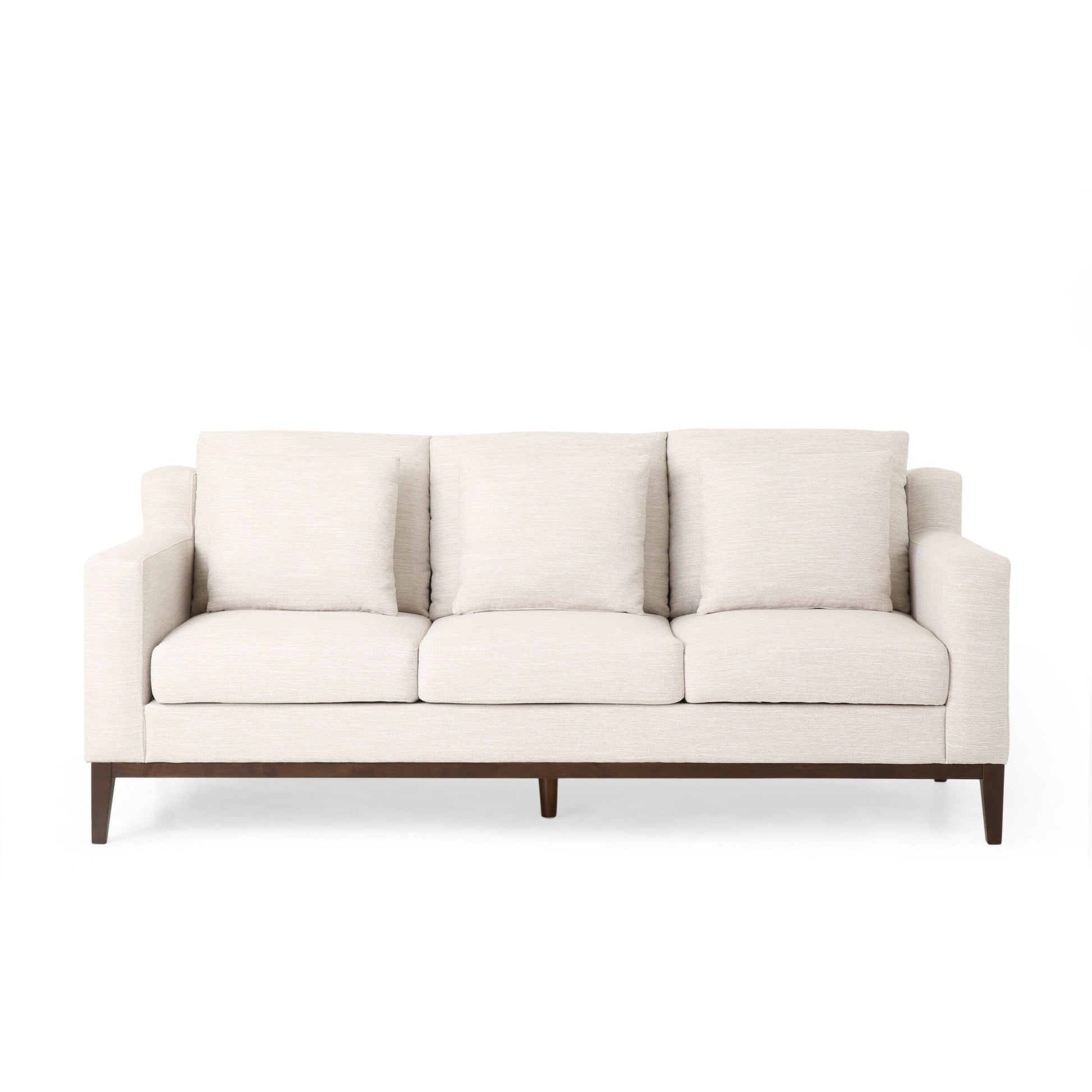 Divano beige a 3 posti con gambe in legno e cuscini coordinati