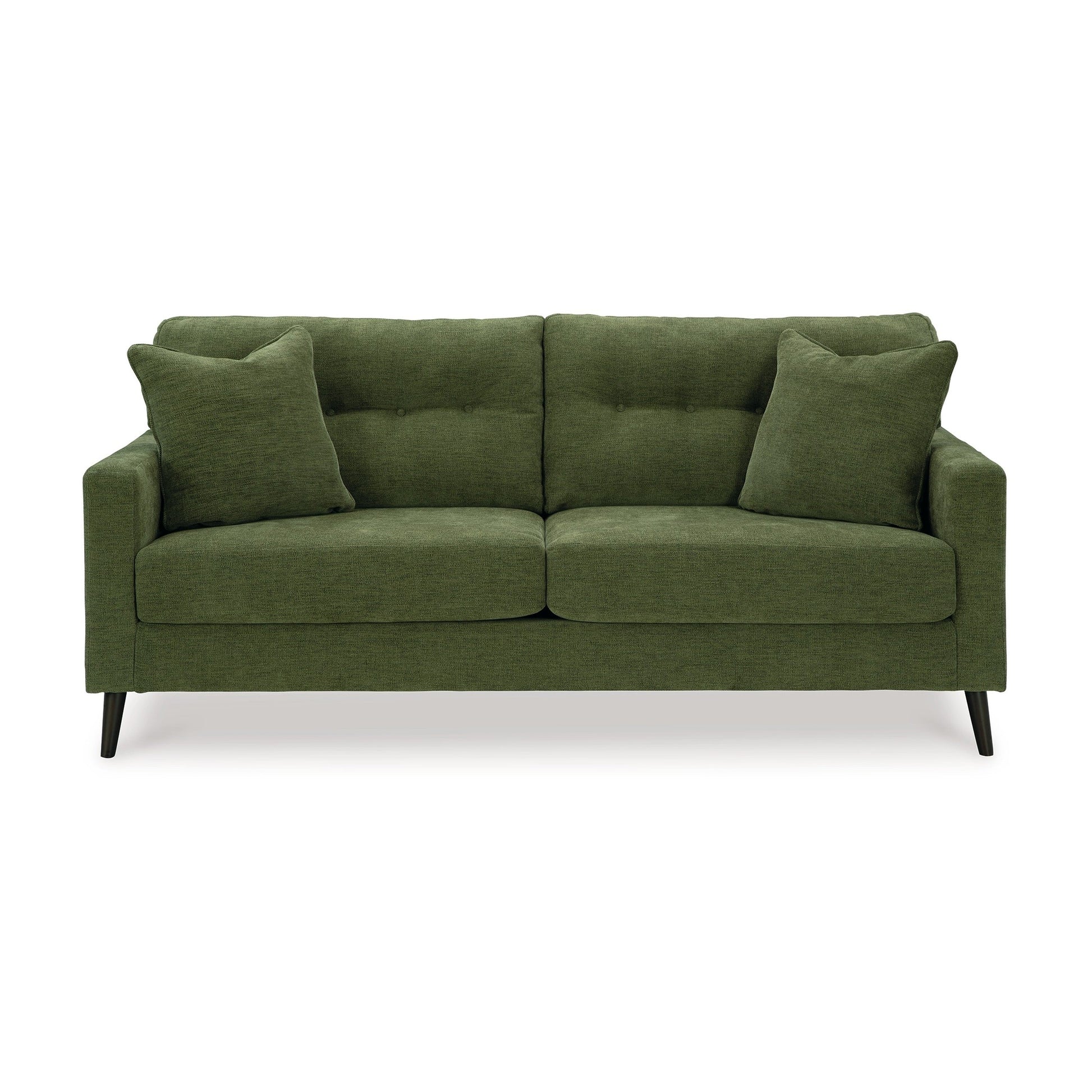 Ravviva il tuo spazio living con questo divano verde oliva, un perfetto mix di nostalgia di metà secolo e fascino moderno. Il profilo lineare e le gambe affusolate nere conferiscono un tocco di freschezza, mentre i cuscini di seduta morbidi e non reversibili e i cuscini dello schienale con bottoni trapuntati offrono comfort e un tocco di stile. I cuscini in schiuma di alta qualità sono rivestiti in fibra di poliestere. Scopri la nostra collezione Bixy per saperne di più.