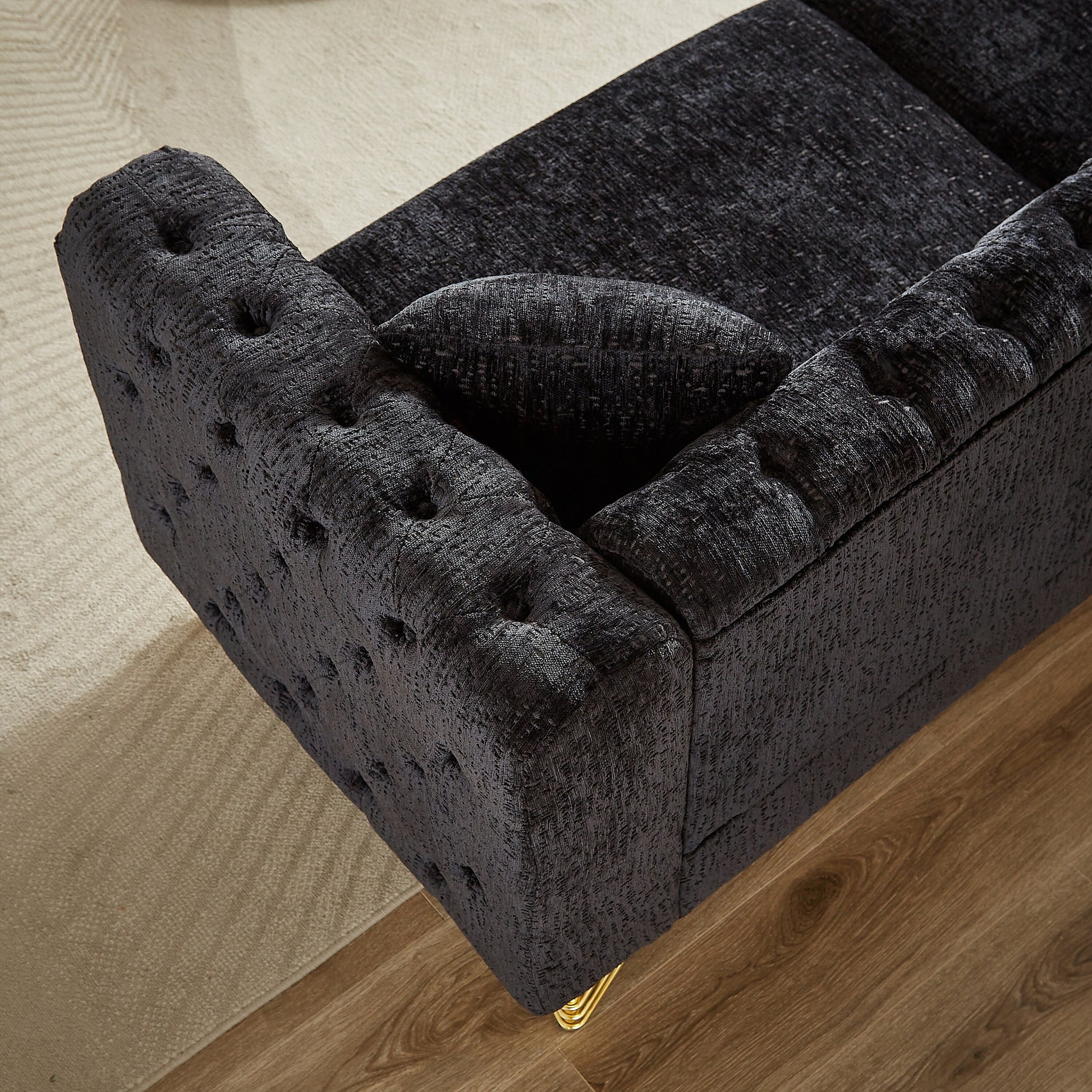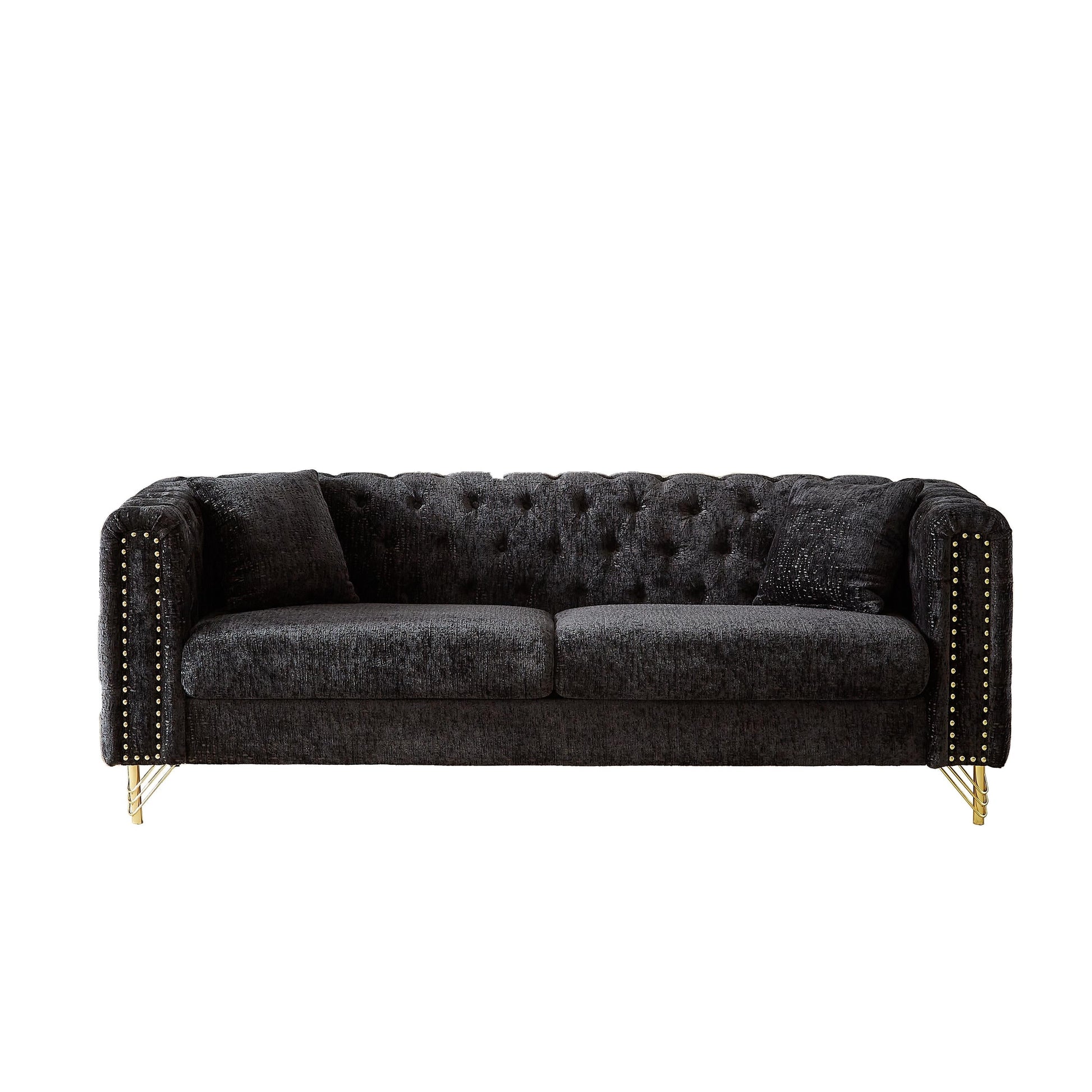 Divano a 3 posti imbottito in ciniglia nera con gambe in metallo
