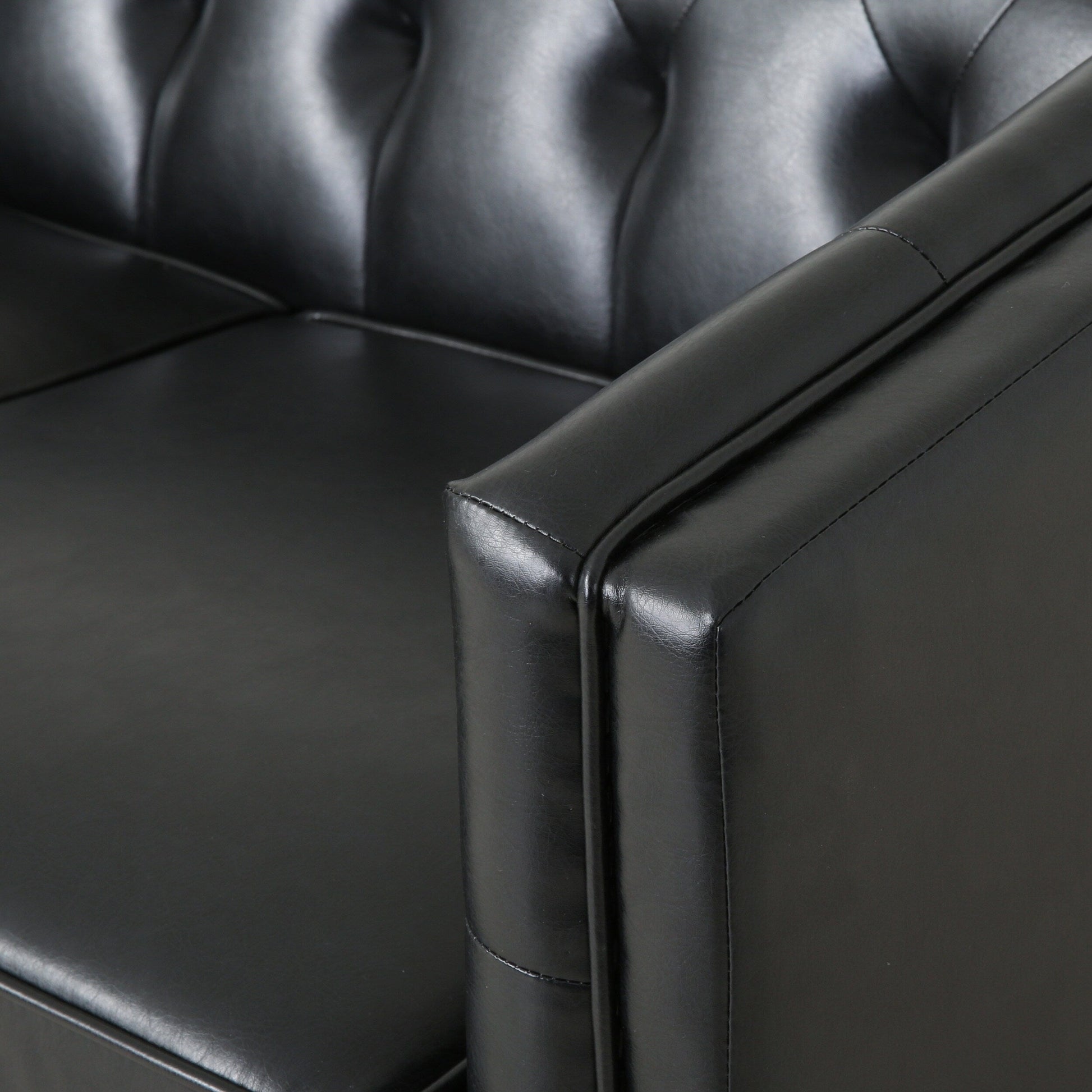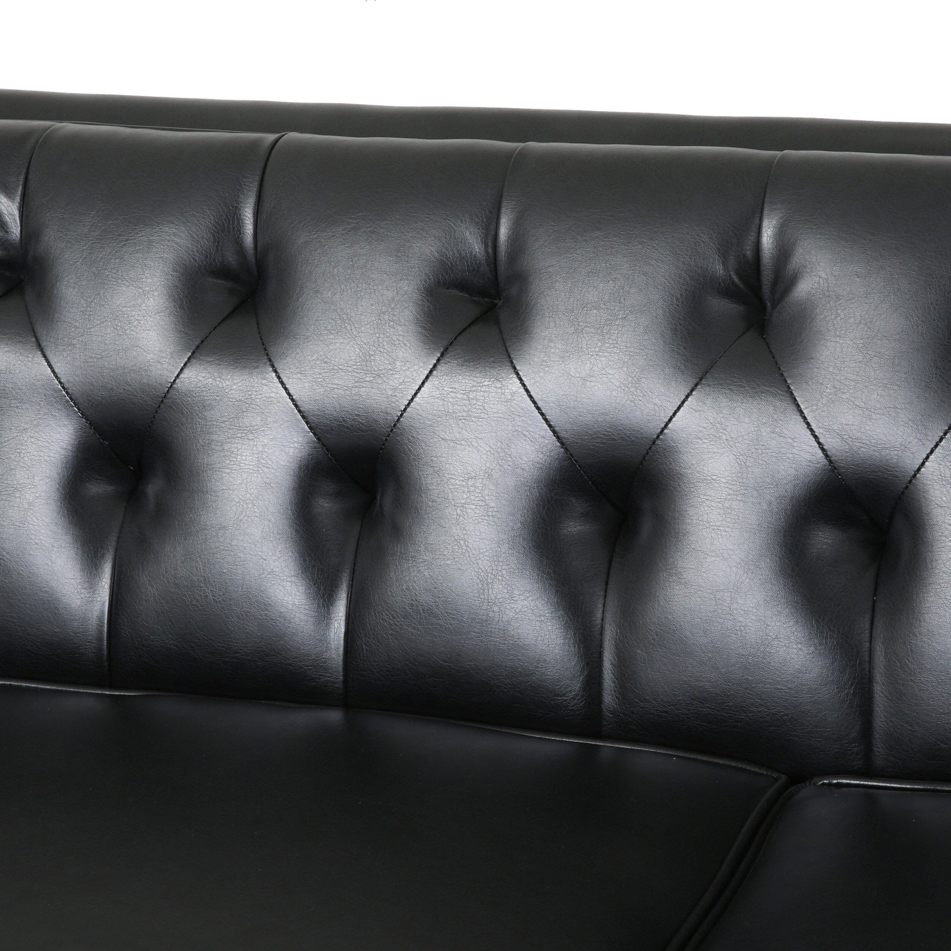 Divano moderno a 3 posti in similpelle nera con bottoni e gambe in legno per soggiorno