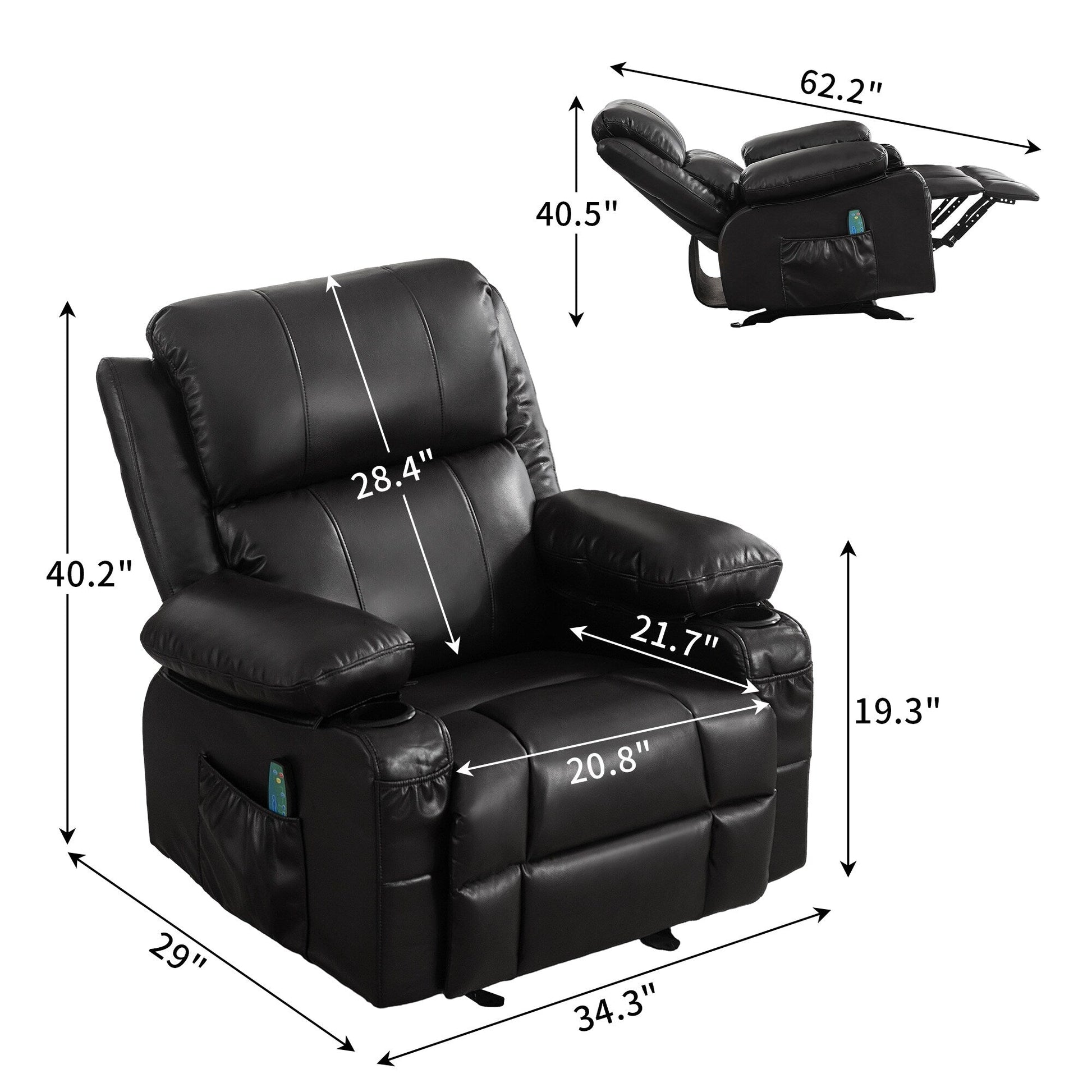 • Massaggio e riscaldamento: la poltrona dispone di 8 punti di massaggio e diverse modalità di massaggio tra cui scegliere. Le 8 potenti aree di massaggio sono distribuite su schiena, vita, cosce e polpacci, con ogni punto di massaggio azionato separatamente.