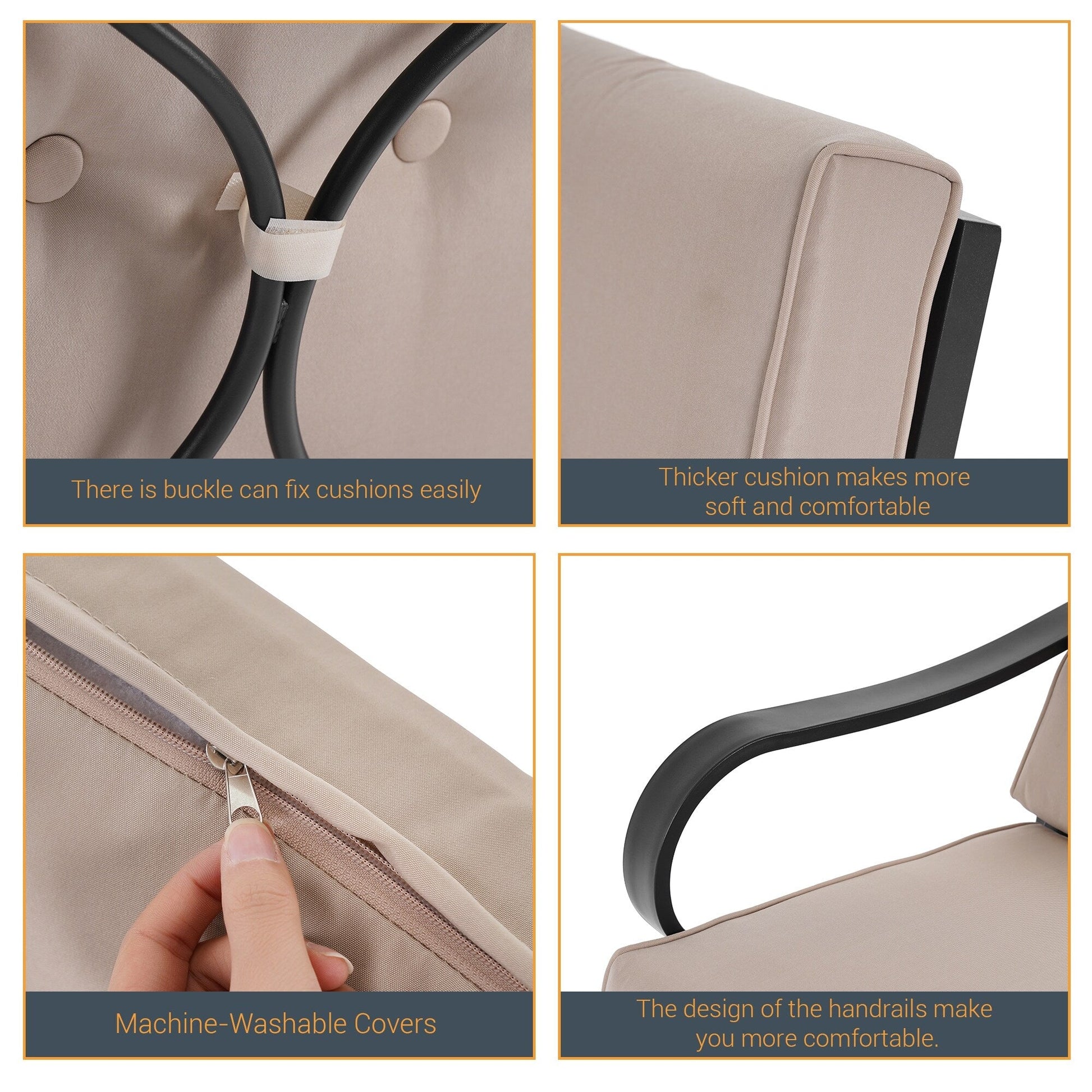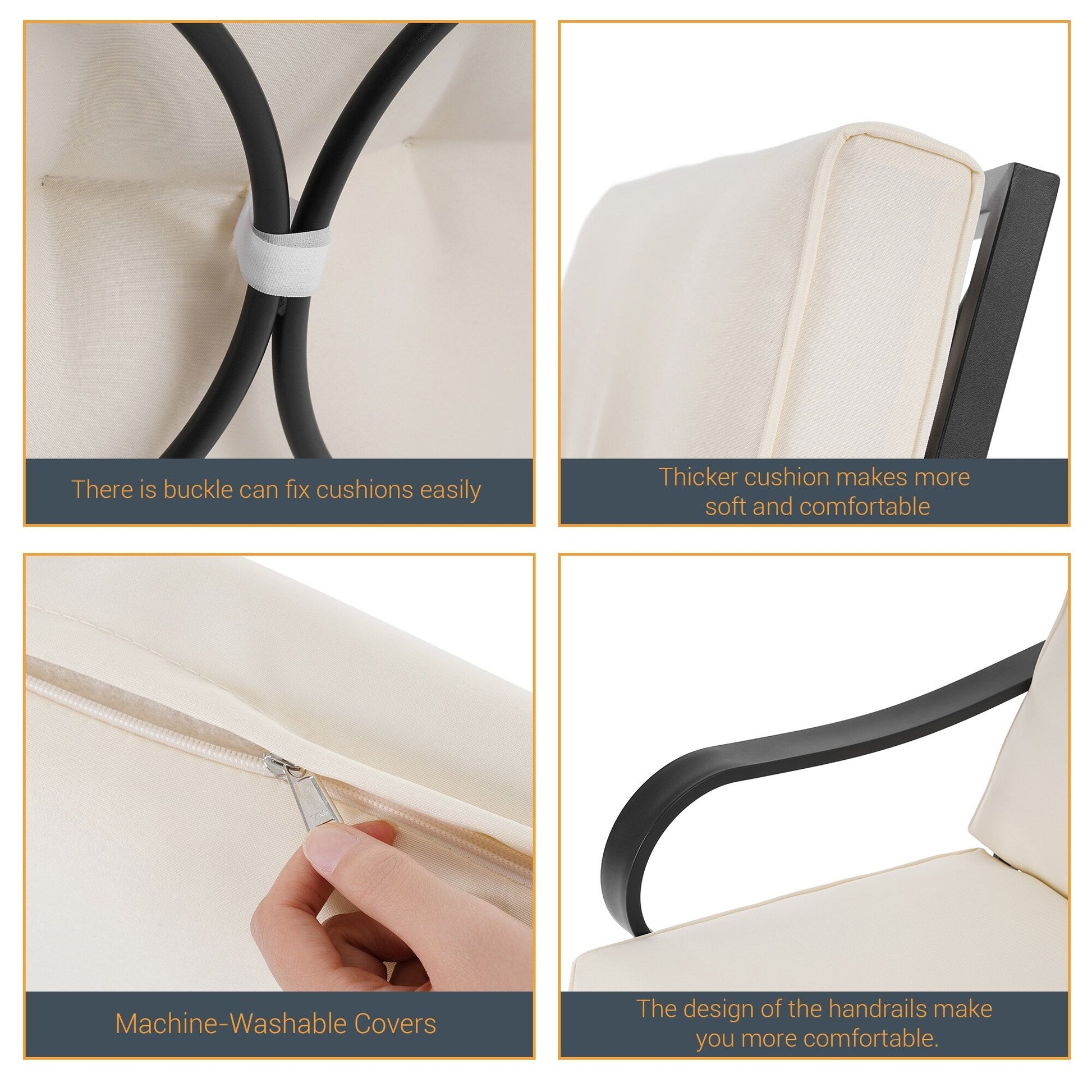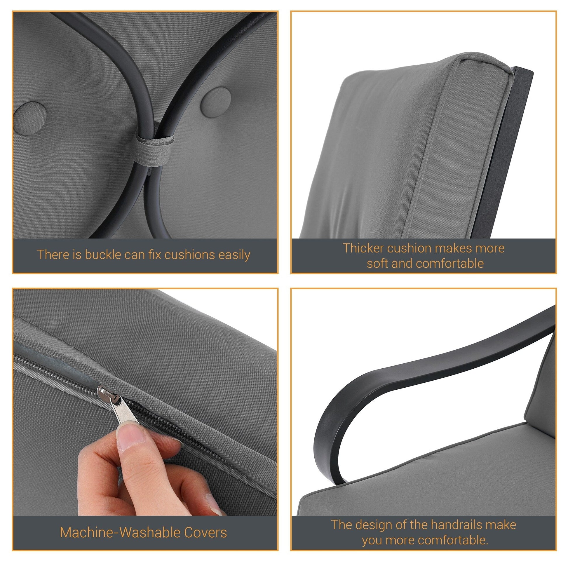 Crea un incantevole rifugio all'aperto con l'elegante set da 3 sedie a dondolo da giardino Bonosuki. Dotato di due comode sedie a dondolo con ampi cuscini per schienale e seduta e un tavolino in vetro temperato, questo set è perfetto per godersi una serata rilassante all'aperto. La struttura trapezoidale simmetrica garantisce un dondolio fluido, mentre i telai in acciaio inox verniciato a polvere con braccioli curvi ne aumentano la durata. Con diverse opzioni di colore disponibili, scegli un set che si abbini al tuo arredamento da esterno per un tocco finale perfetto.