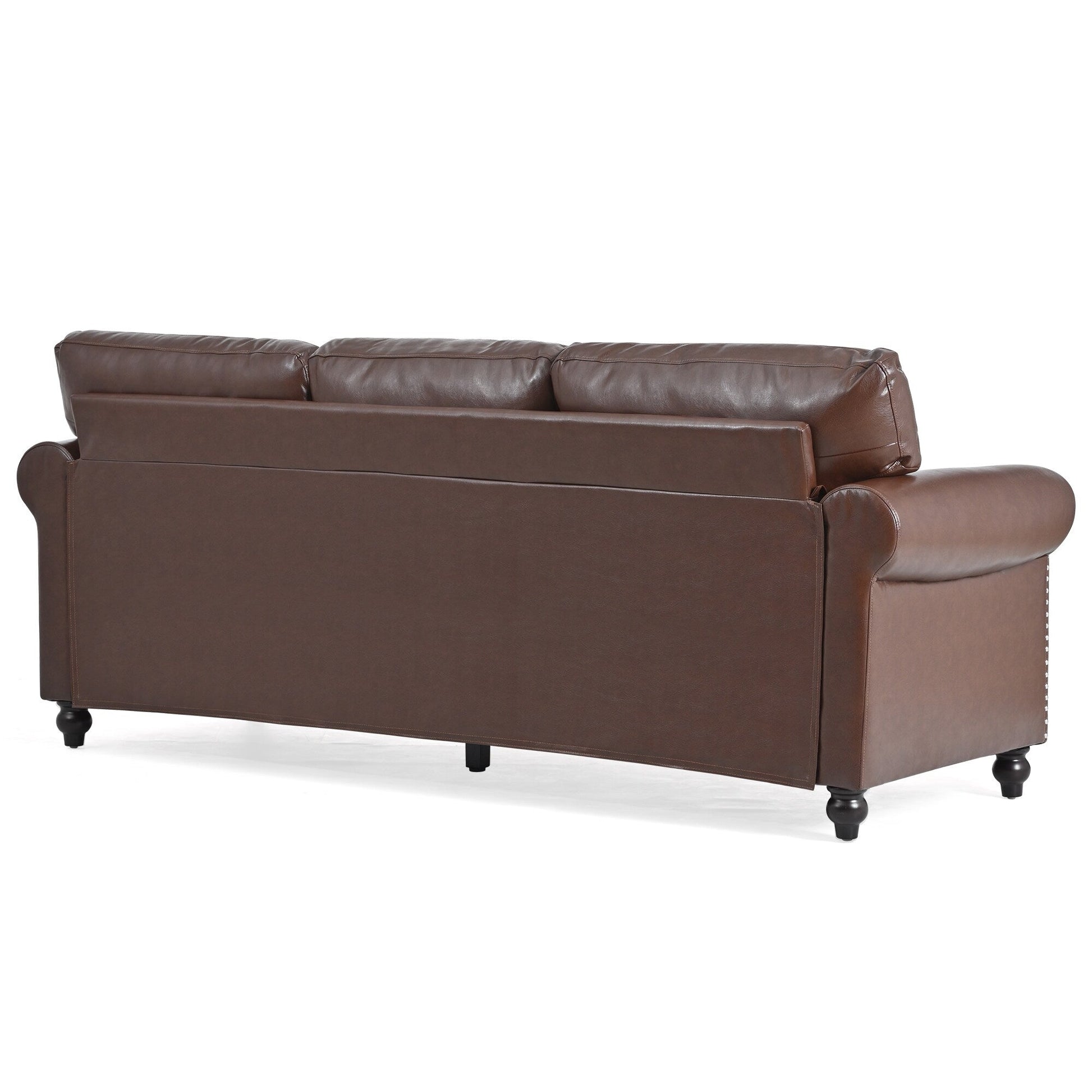 Divano imbottito a 3 posti in PU marrone 83,86 con borchie e piedini in betulla per soggiorno