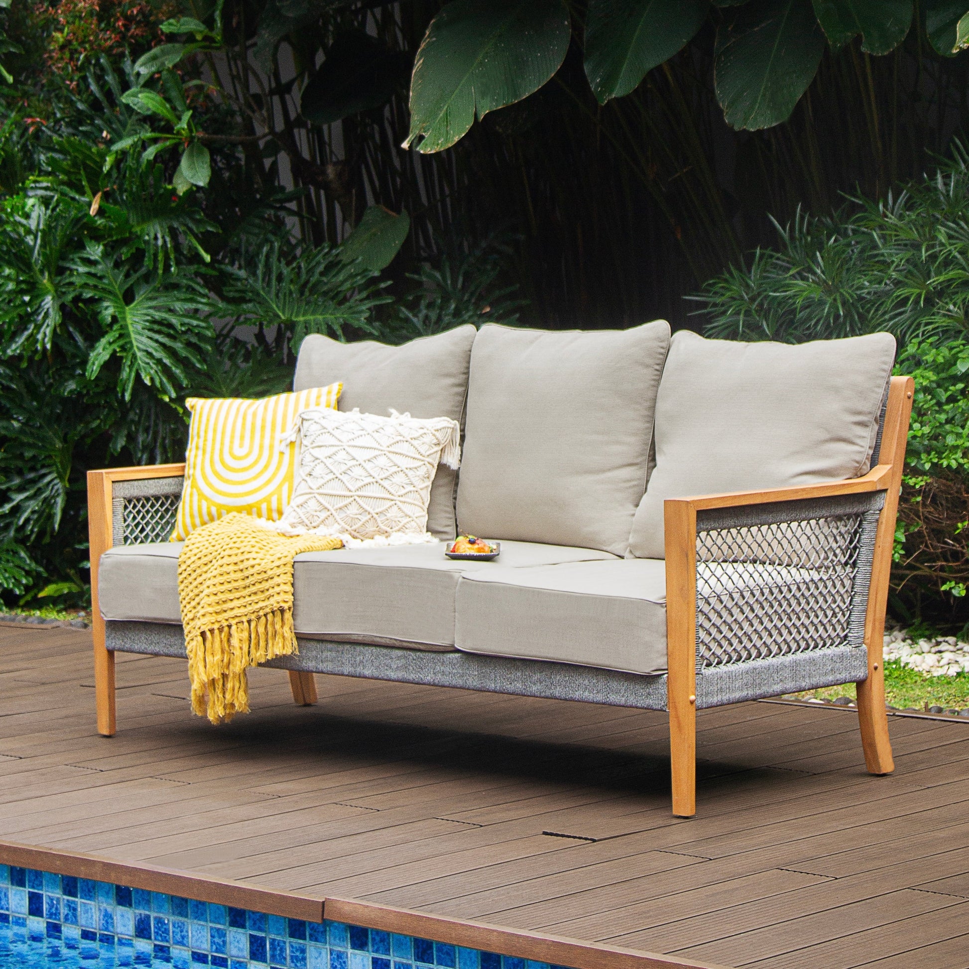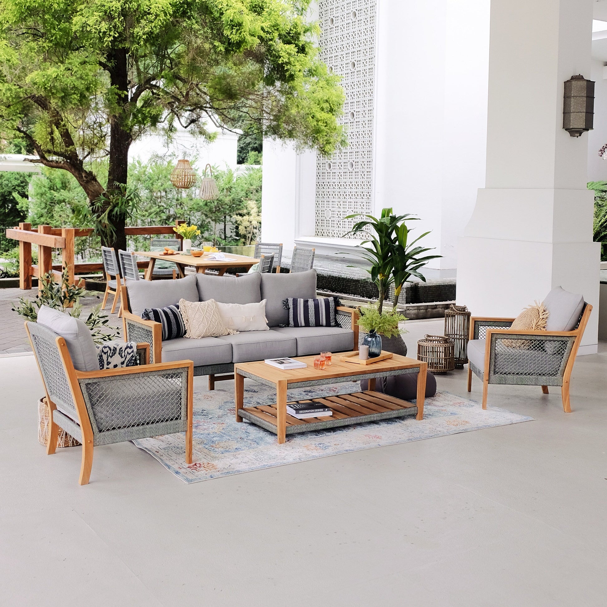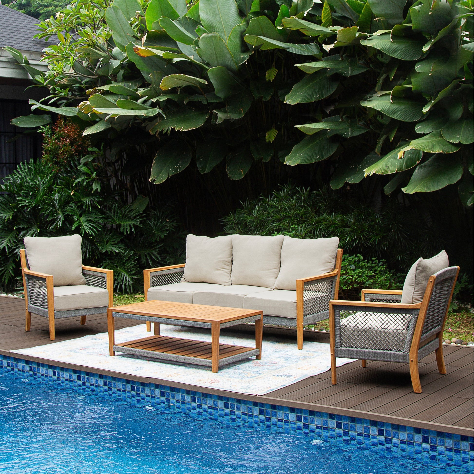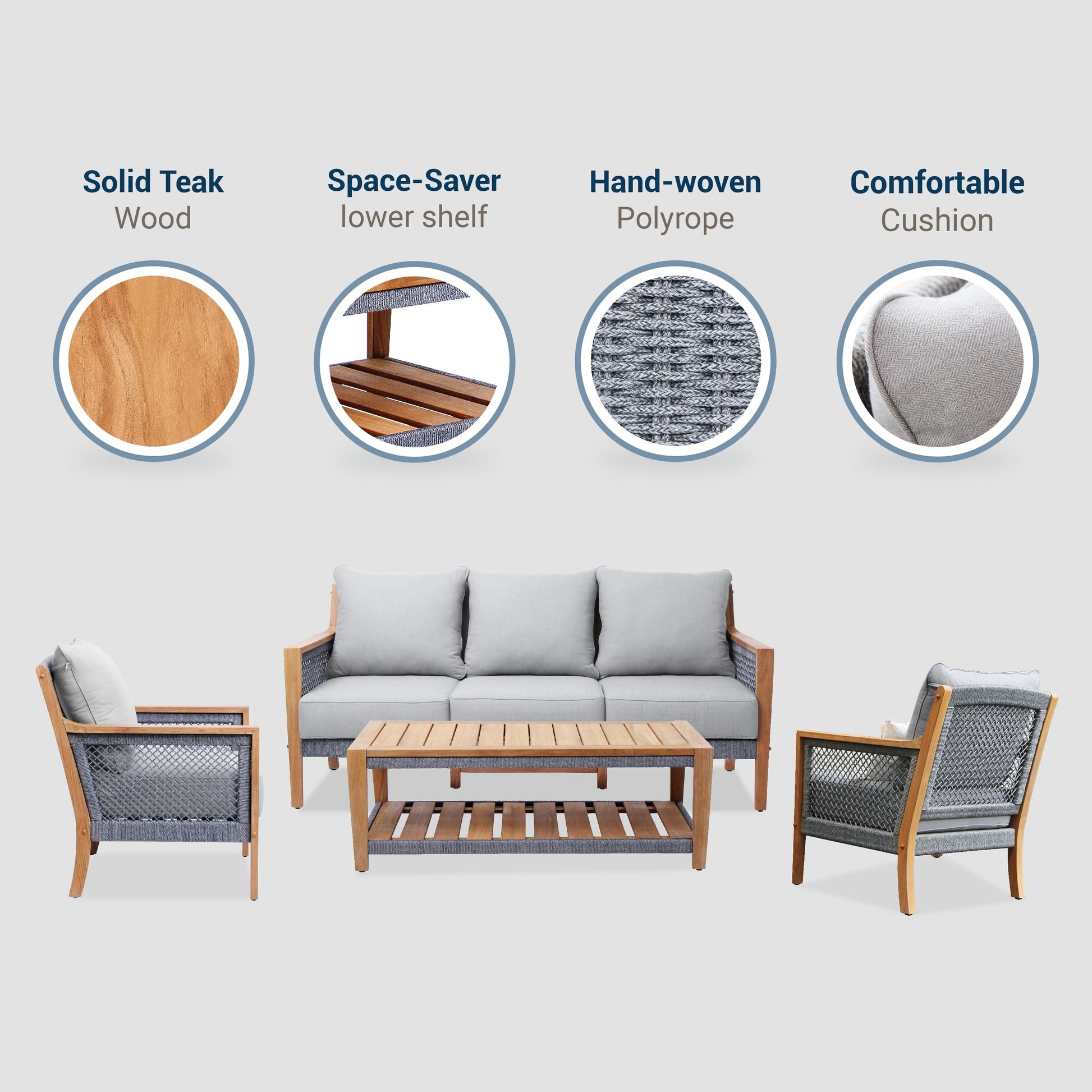 Trasforma il tuo spazio esterno in un paradiso estivo con il set da conversazione Nassau in legno di teak da 4 pezzi. Realizzato in teak proveniente da fonti sostenibili e corda intrecciata in poliestere, questo set da patio resistente alle intemperie offre stile e resistenza. Perfetto per rilassarsi a bordo piscina, sotto i pergolati o per le riunioni attorno al fuoco, è dotato di sedie con seduta profonda, morbidi cuscini in poliestere filato e un pratico tavolino da caffè. Che tu voglia sorseggiare un drink con gli amici, condividere storie sotto le stelle o semplicemente rilassarti in tutta comodità, questo set da conversazione in teak è costruito per durare. Inoltre, grazie al facile montaggio, ti rilasserai in men che non si dica!