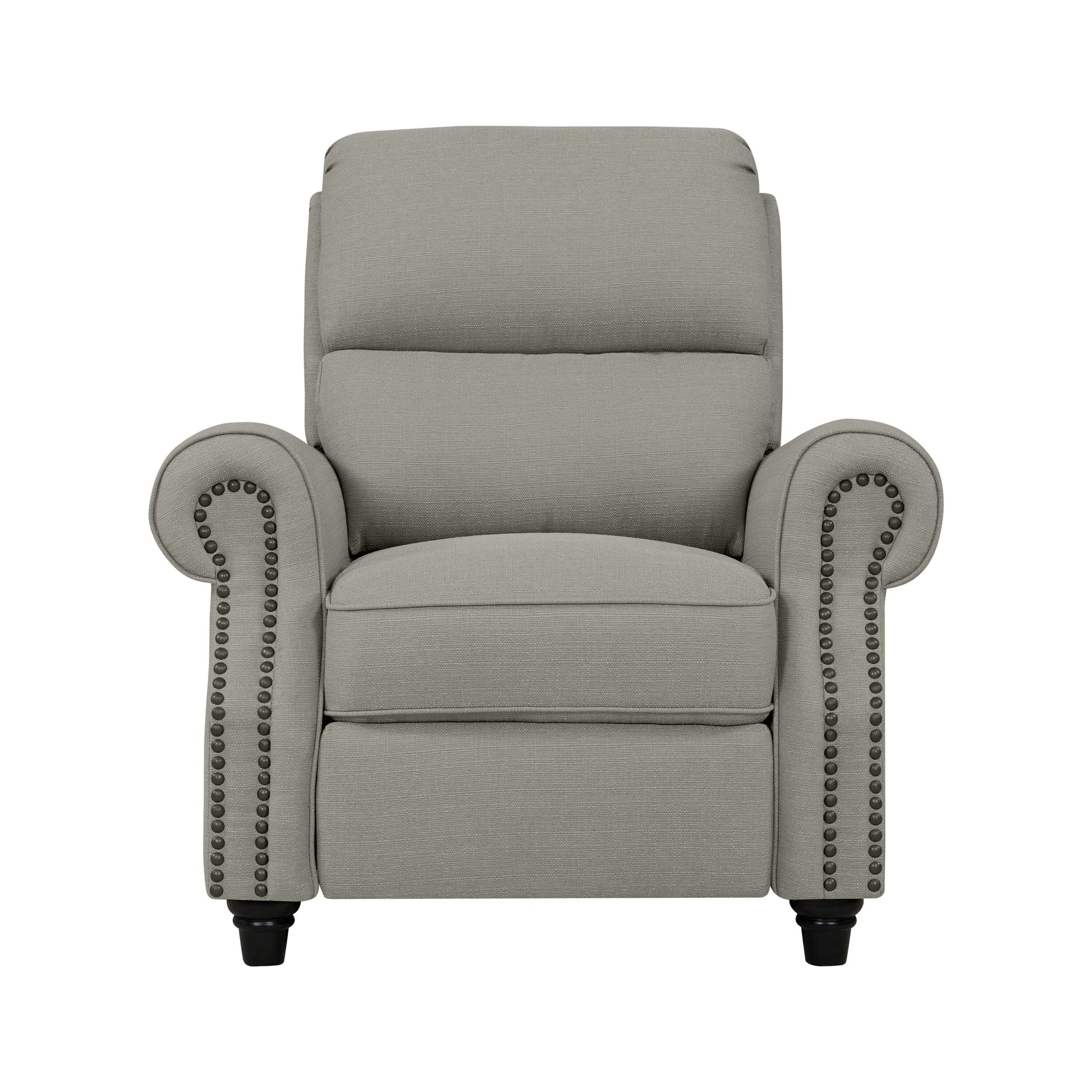 Immergiti nel comfort della poltrona reclinabile Jessie Linen di Copper Grove con schienale a spinta. Questa robusta poltrona reclinabile è rivestita in un tessuto effetto lino facile da pulire e presenta uno schienale squadrato, una seduta generosa e finiture con borchie in bronzo anticato. Con un semplice meccanismo di reclinazione a spinta e gambe in legno massello tornito, questa poltrona è l'aggiunta perfetta a qualsiasi soggiorno o angolo lettura.