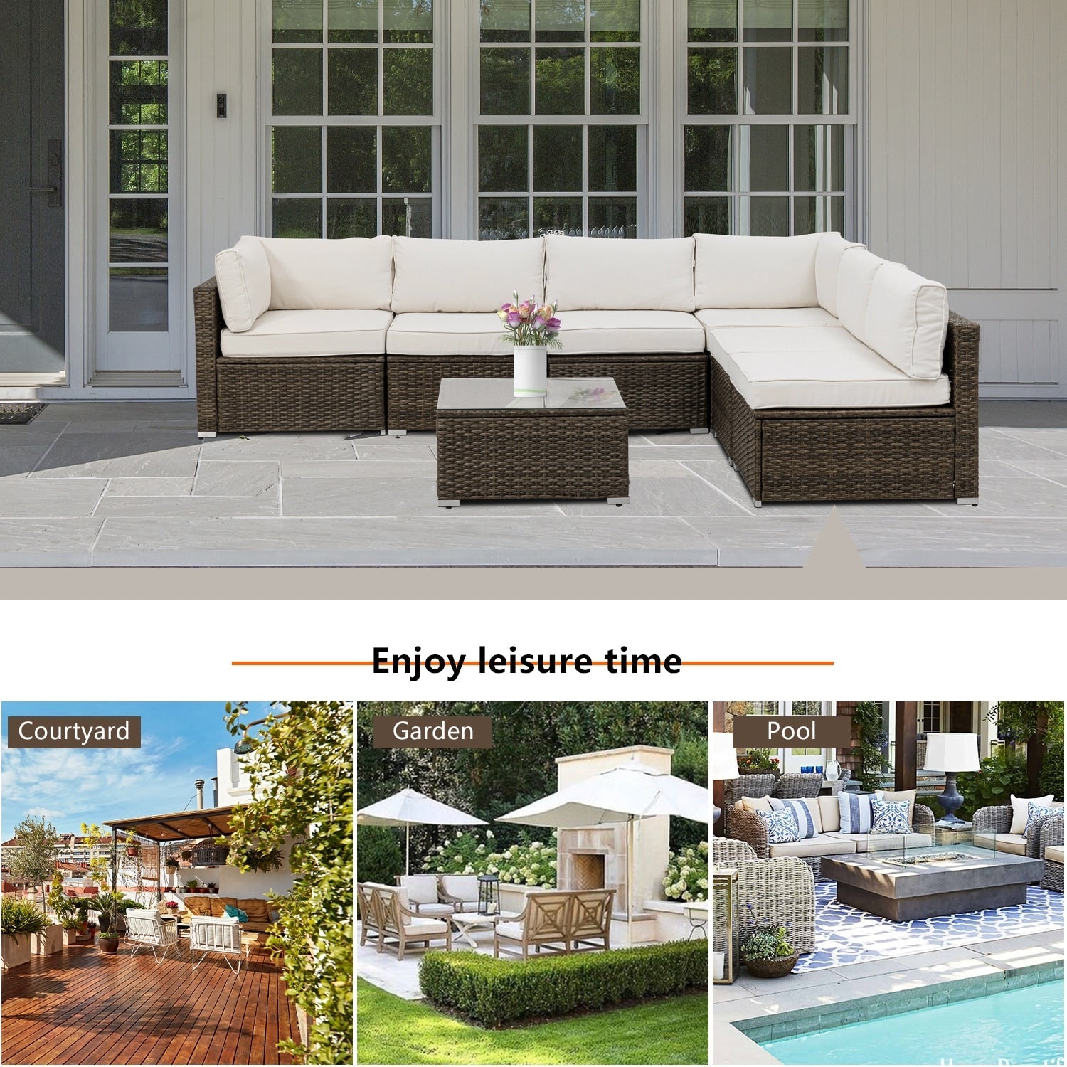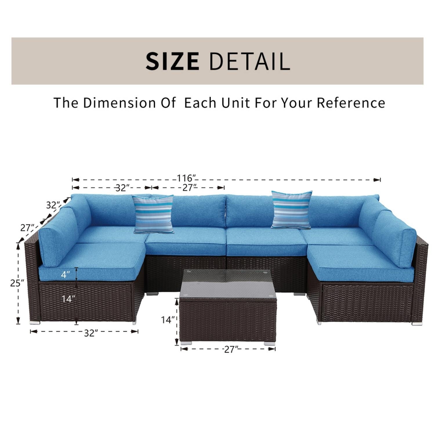 Rilassati e divertiti con stile con il set di divani componibili in vimini da 7 pezzi per esterni COSIEST. Questo elegante set include un divano componibile da sei pezzi e un tavolino da caffè con piano in vetro, perfetto per riunioni all'aperto o per rilassarsi con la famiglia e gli amici. La struttura in acciaio verniciato a polvere antiruggine e il vimini sintetico in resina PE resistente alle intemperie dall'aspetto naturale garantiscono durata e longevità. Disponibili in grigio scuro, grigio, bianco sporco o blu, le fodere dei cuscini in poliestere sono realizzate in tessuto in fibra di poliestere di qualità superiore, sfoderabile, lavabile e facile da rimettere.