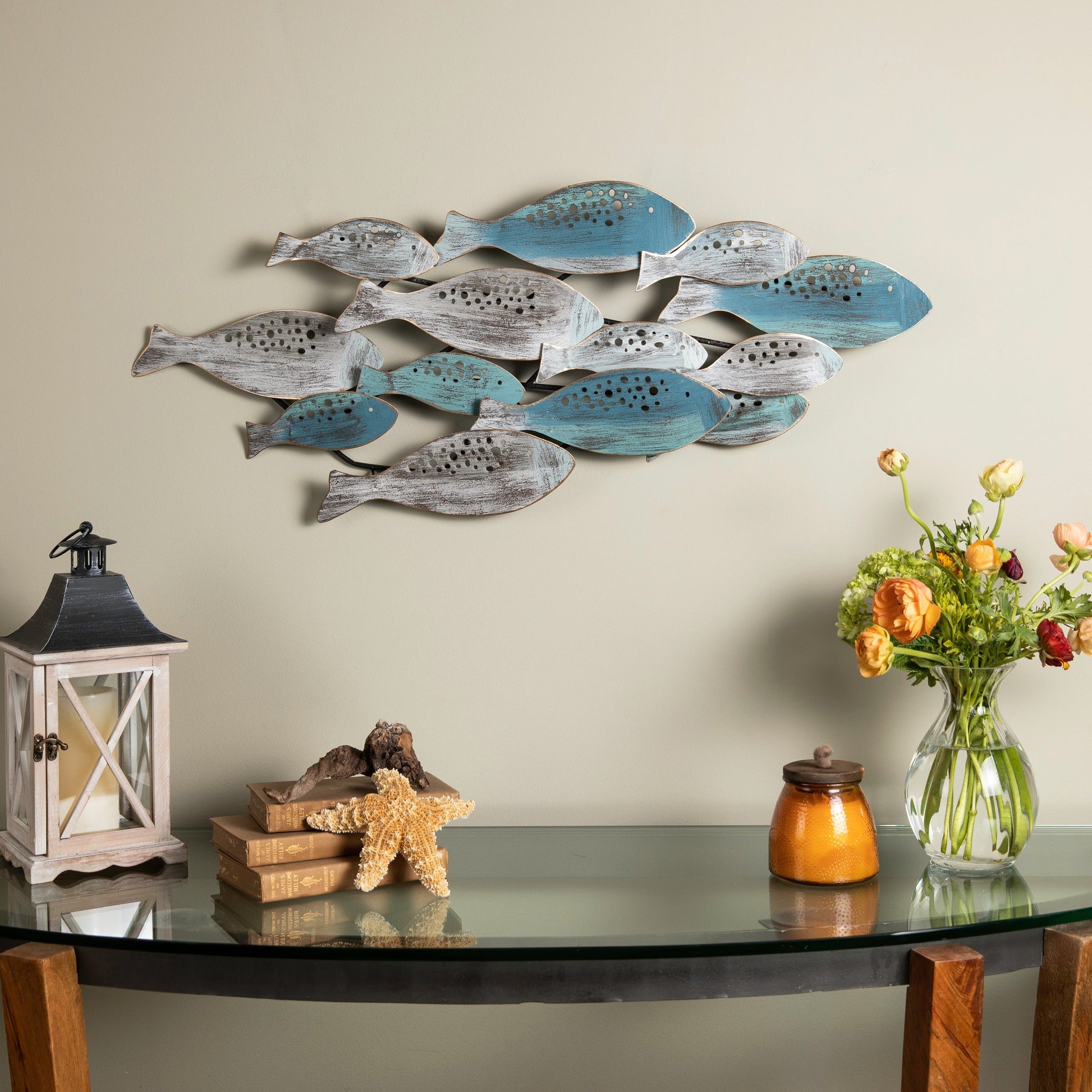 Porta la tranquillità della vita costiera nella tua casa con la moderna decorazione da parete in metallo "School of Fish" di Danya B. Questa elegante decorazione da parete è perfetta per aggiungere un tocco di stile a un soggiorno o per ravvivare una parete noiosa. Le statuette di pesce in metallo sono dipinte in diverse tonalità di blu e acqua con una finitura anticata, creando un pezzo elegante perfetto per case al mare, stabilimenti costieri o chiunque ami il mare. Realizzato in metallo e pronto per essere appeso con ganci integrati, questo pezzo è perfetto per qualsiasi stanza con decorazioni costiere, nautiche, da spiaggia o da barca.