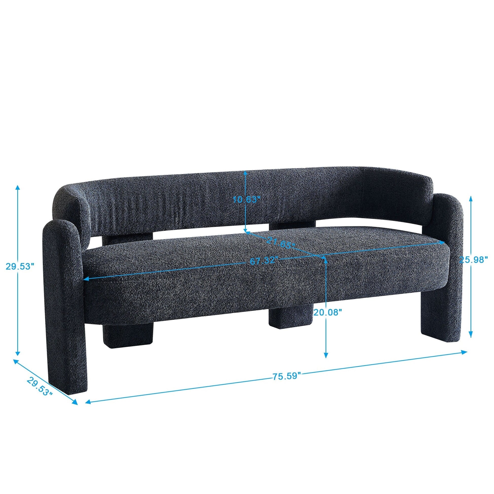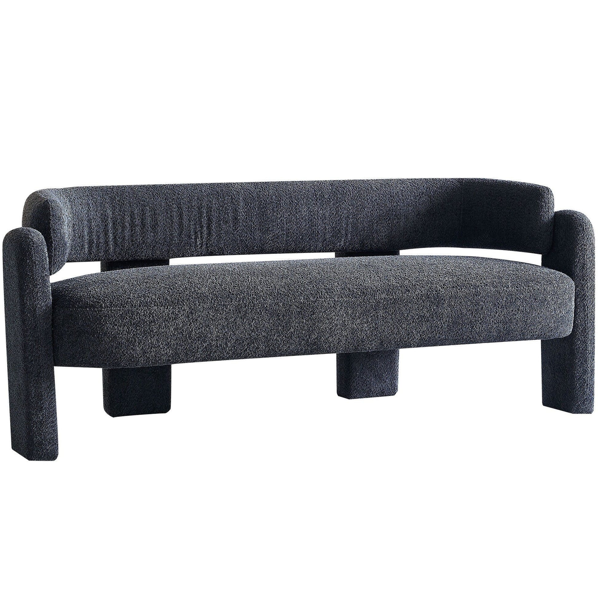 • Il divano ha una struttura rotonda realizzata in legno di pino e compensato, imbottita in schiuma e dotata di molle sinuose per un supporto extra. È rivestito in tessuto bouclé per una texture ricca e materica.
