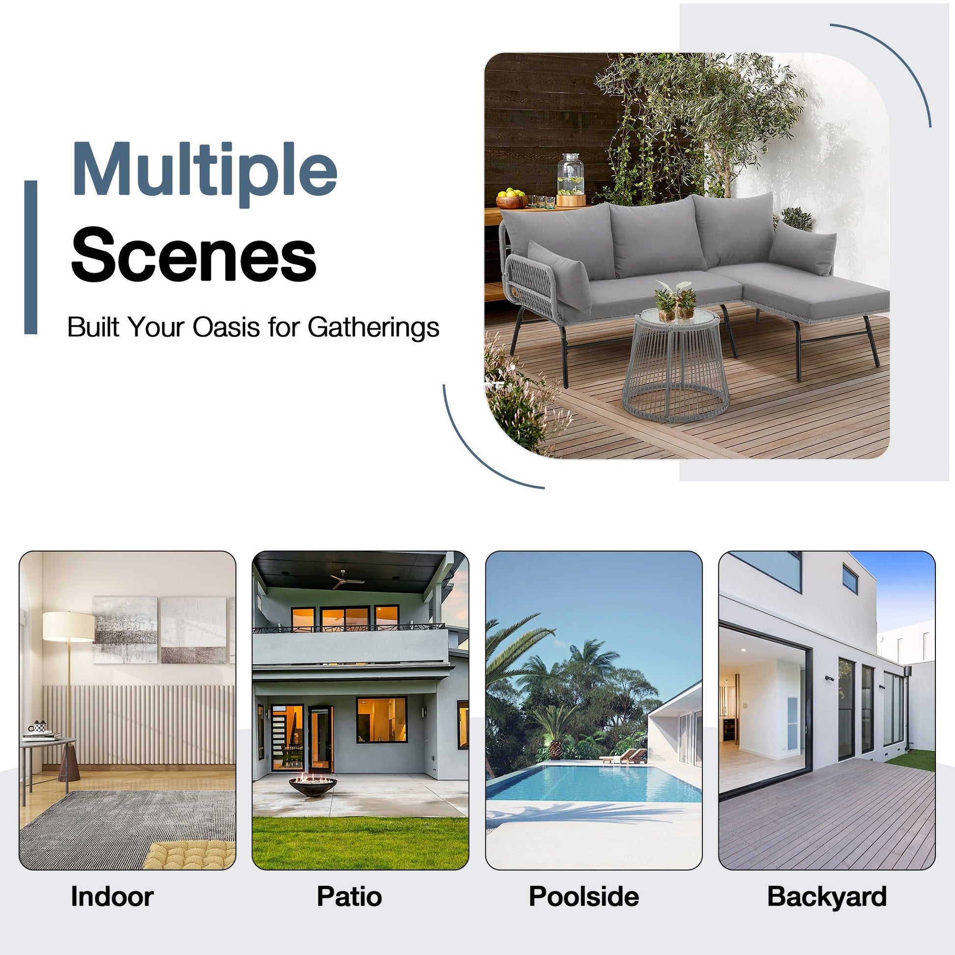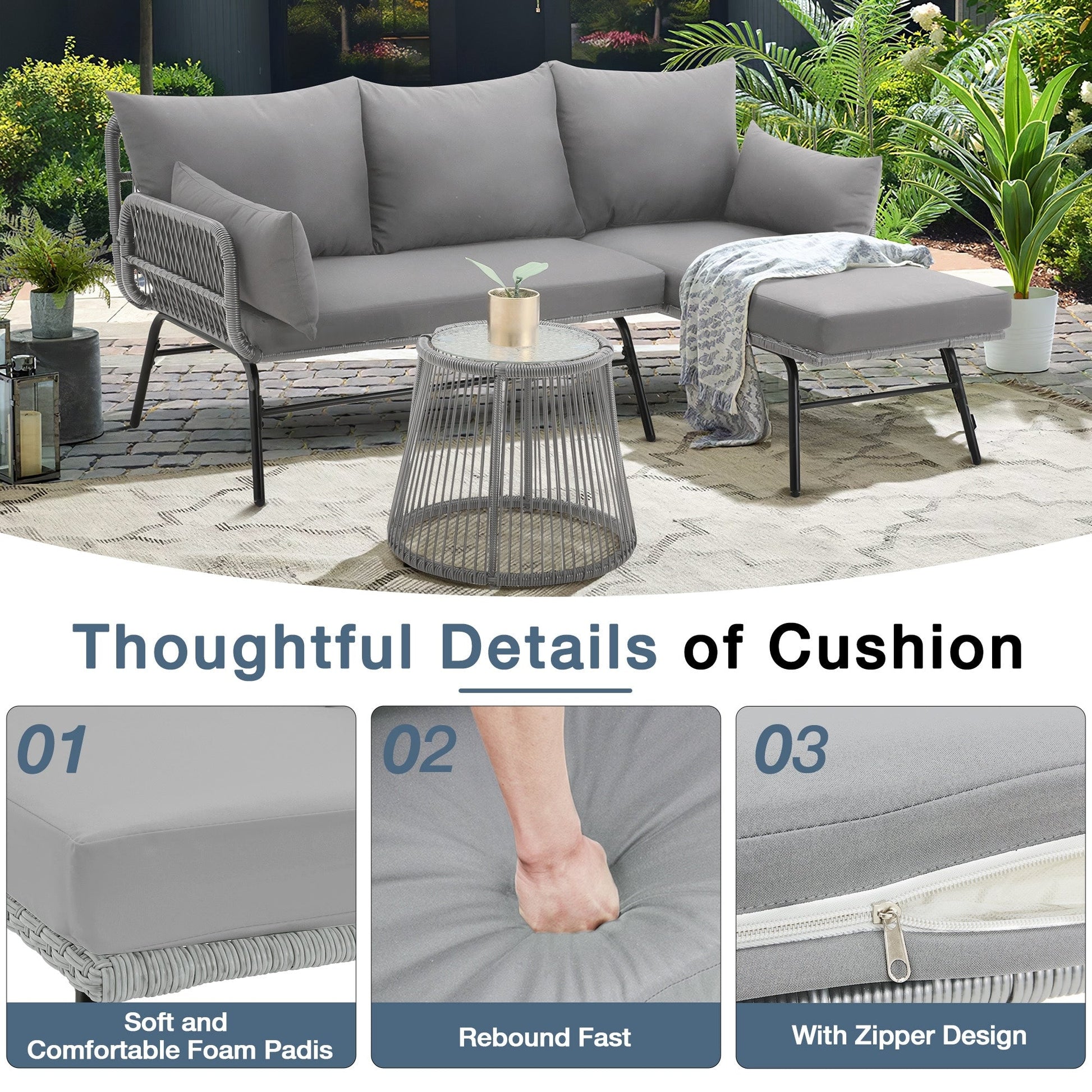 • Questo set di mobili da esterno in vimini è progettato con linee pulite e uno stile essenziale, che si abbina perfettamente a qualsiasi arredamento e aggiunge un tocco di modernità. Questo set di mobili da esterno in vimini è ideale per patio, giardino, balcone, bordo piscina e così via, donando un tocco di naturalezza al vostro spazio.
