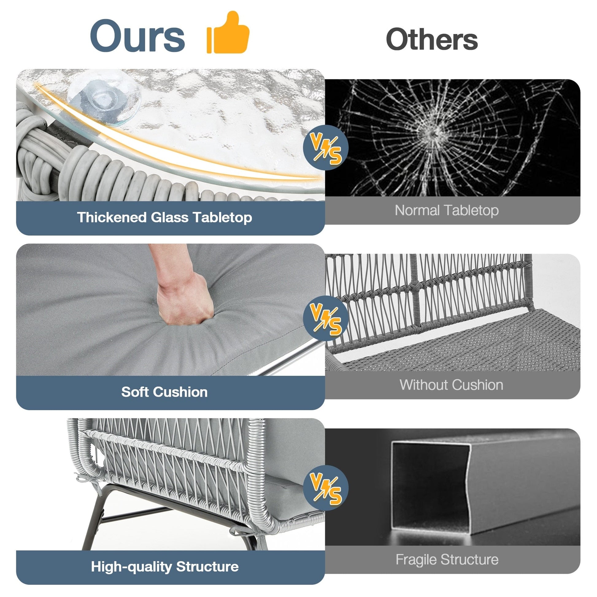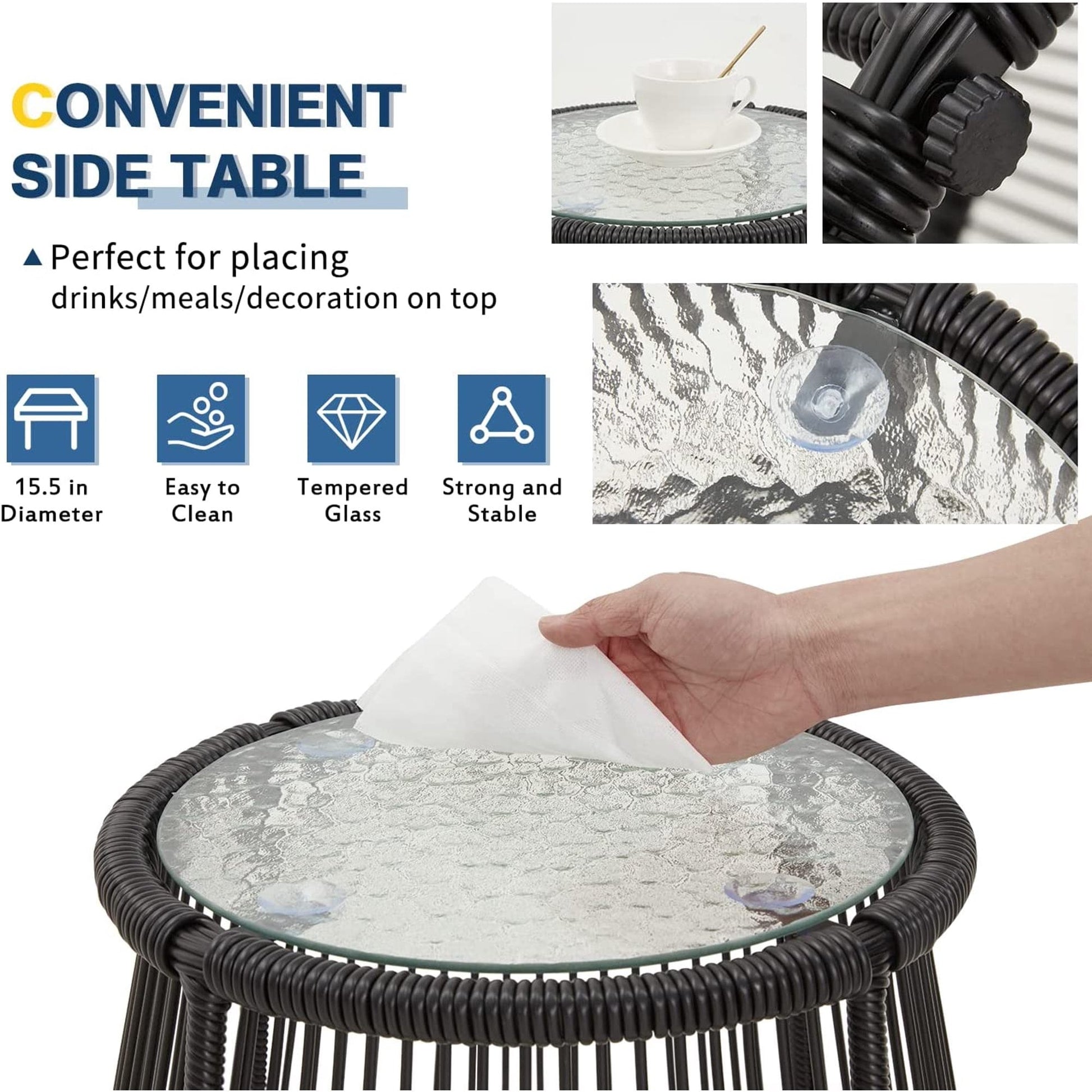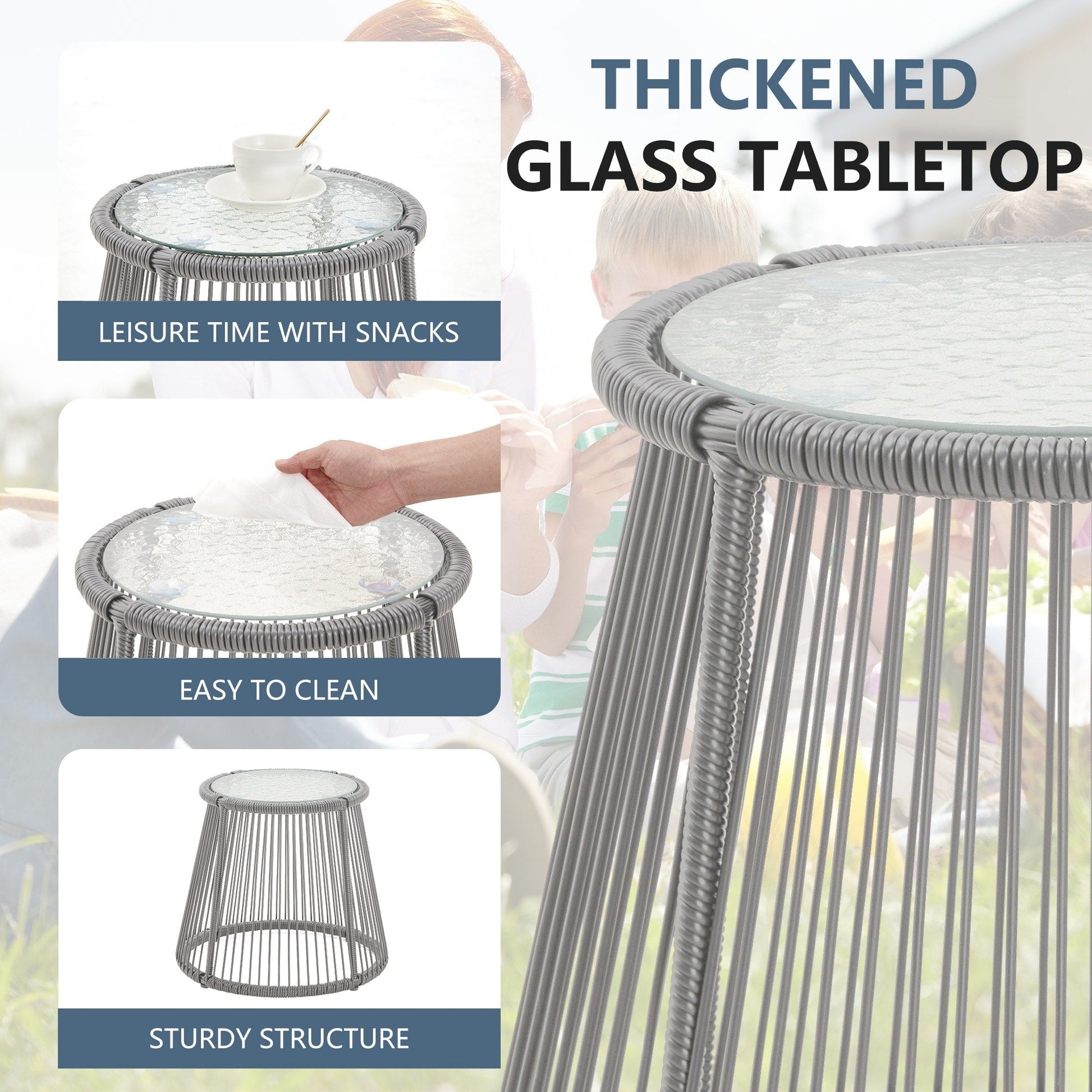 • Realizzato in rattan rotondo in PE intrecciato a mano e resistente alle intemperie, questo set di mobili da giardino può essere utilizzato a lungo. Progettato con un piano in vetro temperato ondulato da 5 mm, la superficie del tavolino è liscia e facile da pulire. Inoltre, le gambe con telaio in acciaio verniciato a polvere offrono una maggiore capacità di carico. I piedini antiscivolo aggiungono ulteriore stabilità.