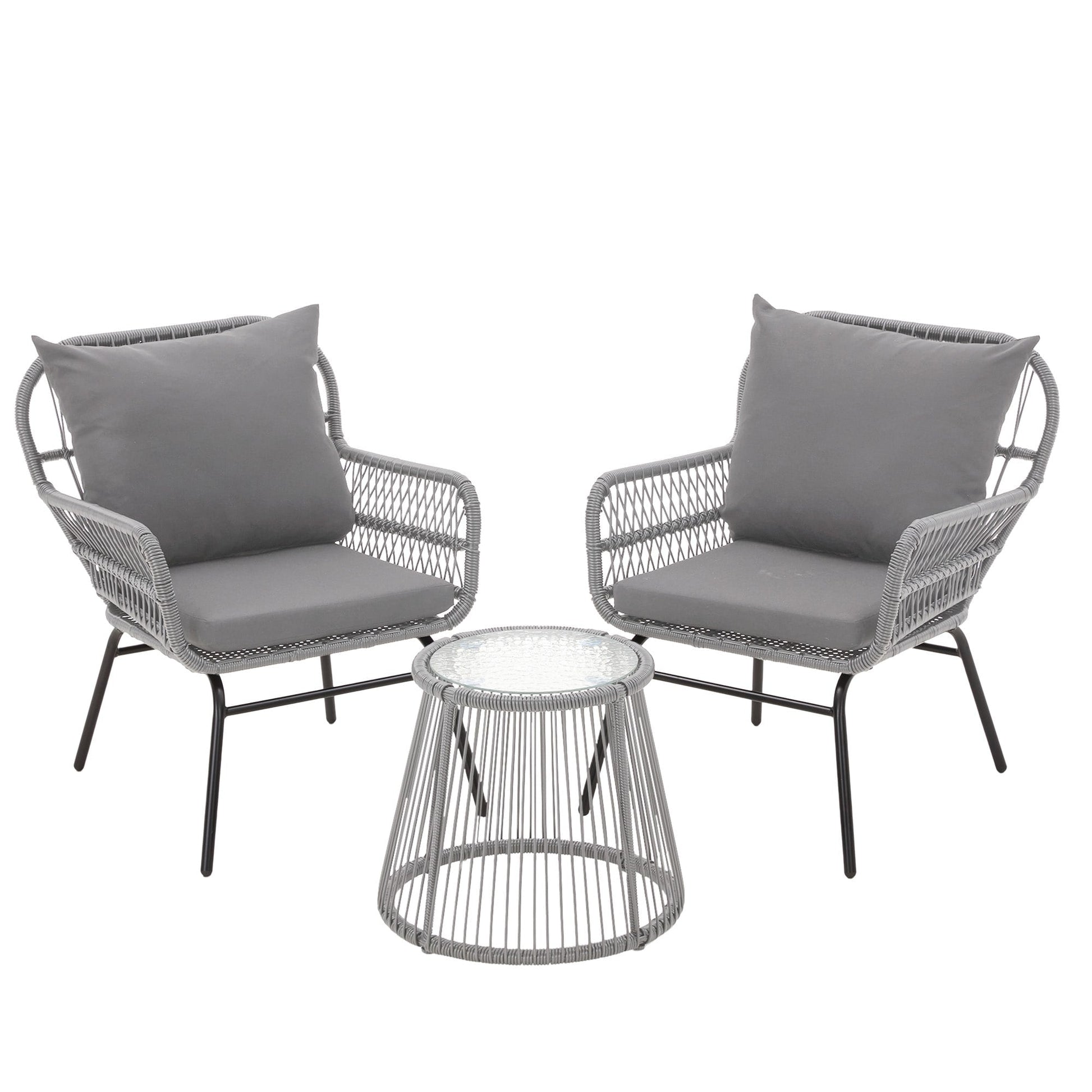Set da conversazione per patio EROMMY da 3 pezzi con tavolo in vetro e 2 poltrone, cuscini per seduta