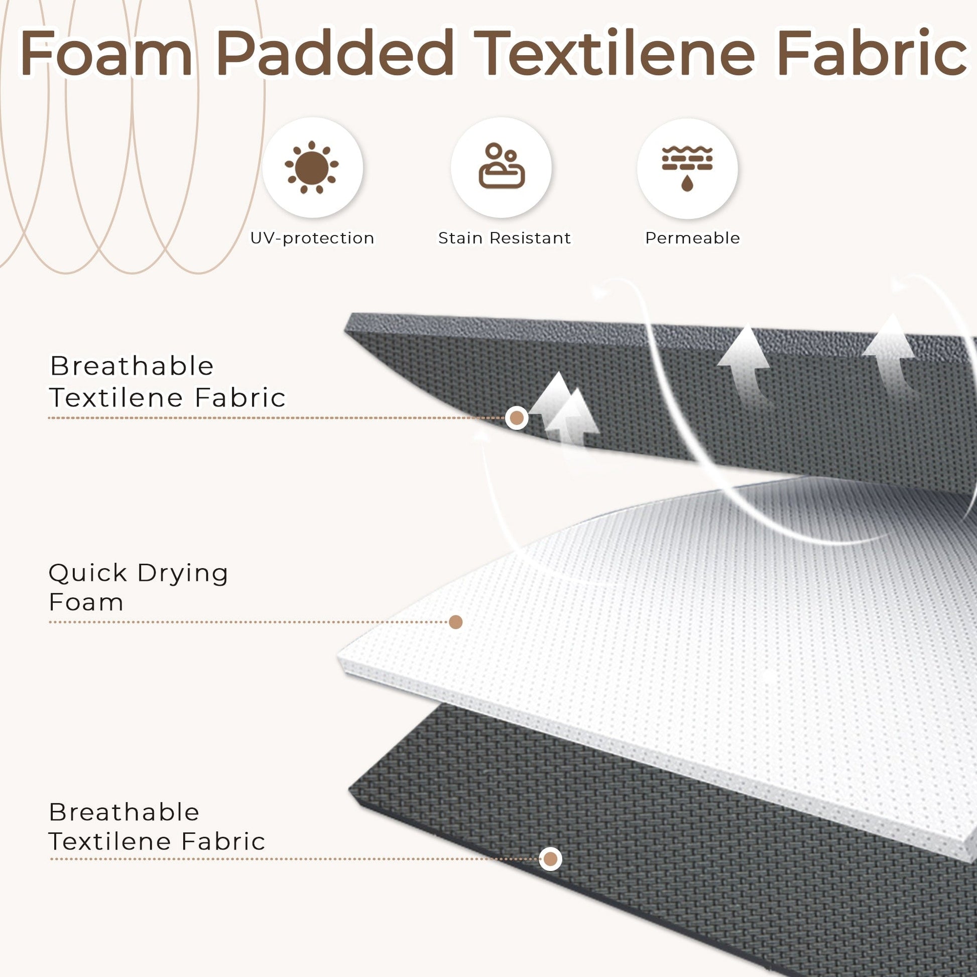 Realizzato con un tavolo a doghe in alluminio antiruggine e tessuto traspirante in Textilene, questo set di mobili da giardino è resistente ai raggi UV, ad asciugatura rapida e facile da pulire. Che siano esposti a pioggia, sole o liquidi, le superfici impermeabili rimangono fresche e prive di muffa, rendendolo una scelta affidabile per l'uso all'aperto.