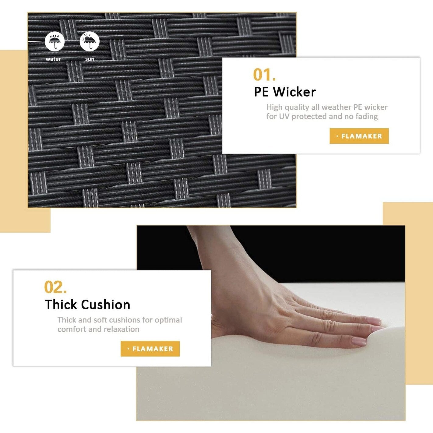 • Progettate ergonomicamente per il massimo comfort, le eleganti sedie da veranda sono dotate di cuscini e guanciali spessi in spugna, adatti sia all'uso interno che esterno.