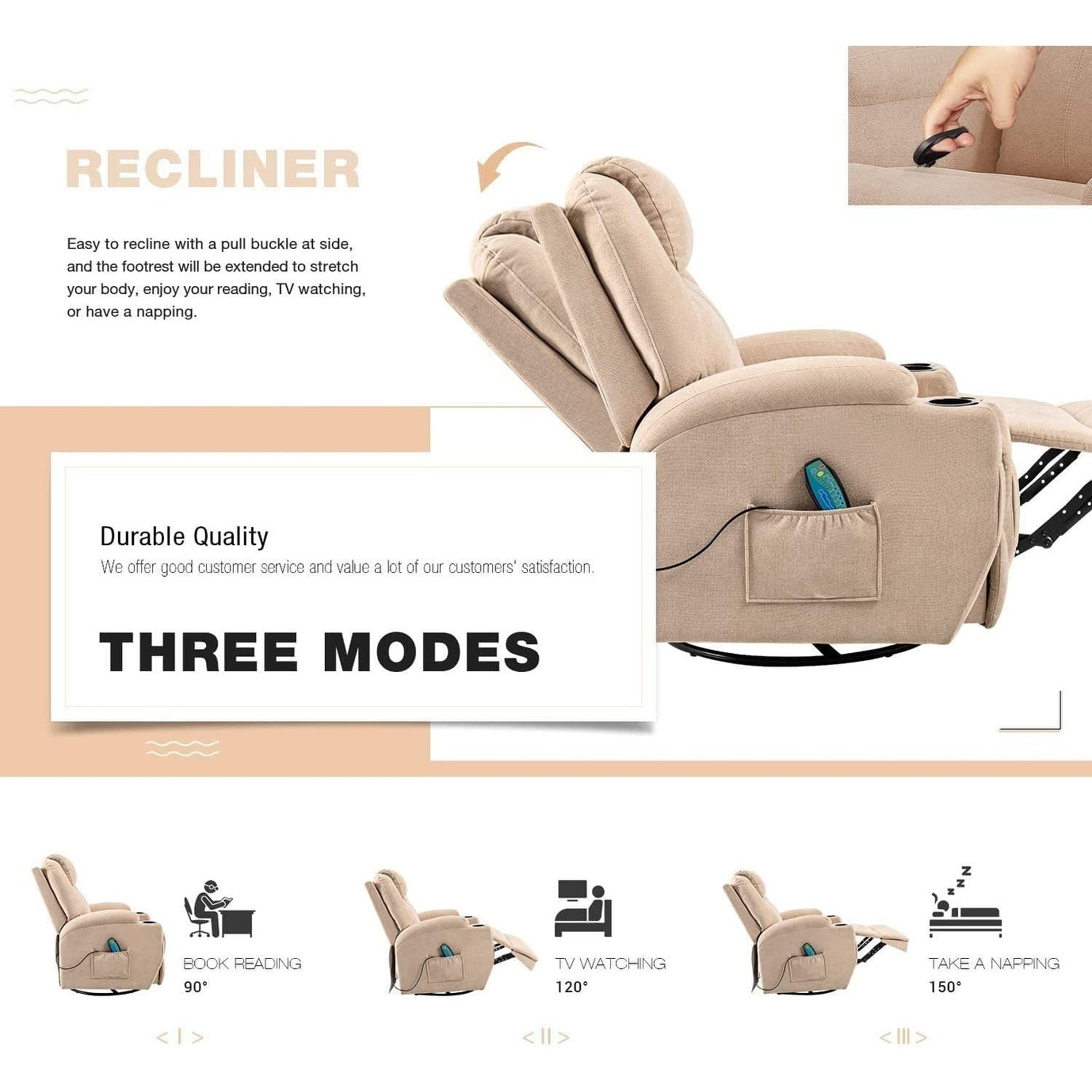Rilassati nel massimo comfort con la poltrona reclinabile massaggiante girevole con funzione di riscaldamento, disponibile in diversi colori. Questa comoda poltrona reclinabile vanta una funzione di rotazione e oscillazione fluida a 360 gradi, oltre a diverse posizioni di reclinazione e un poggiapiedi esteso per un relax ottimale. Goditi diverse funzioni di massaggio con cinque ritmi e due intensità, mirate alla zona di schienale, lombare, cosce e gambe. Quando fa freddo, usa la funzione di riscaldamento in vita per mantenerti al caldo. La poltrona è inoltre dotata di un poggiatesta più ampio e braccioli spessi per un maggiore comfort, oltre a portabicchieri e tasche laterali per una maggiore praticità. Il montaggio è semplice e la garanzia limitata di 1 anno è inclusa.