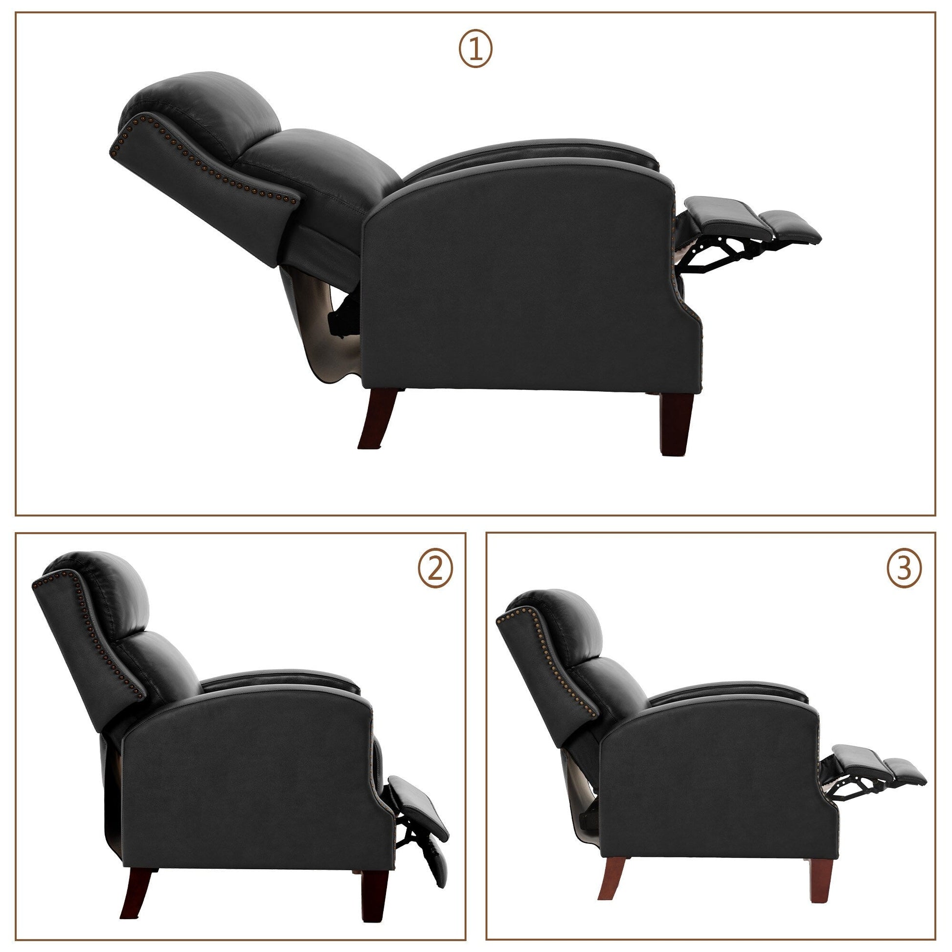 Questa versatile poltrona reclinabile in vera pelle offre un'esperienza di comfort personalizzata, adattandosi a un'ampia gamma di preferenze di seduta. Che preferiate sedervi in ​​posizione eretta, sollevare le gambe o reclinarvi completamente, questa poltrona si adatta alla posizione desiderata senza sforzo. Il design innovativo consente una transizione fluida semplicemente applicando una pressione sullo schienale, che attiva l'estensione del poggiapiedi e il suo bloccaggio in posizione con qualsiasi angolazione compresa tra 0 e 90 gradi, offrendo la massima flessibilità e relax.