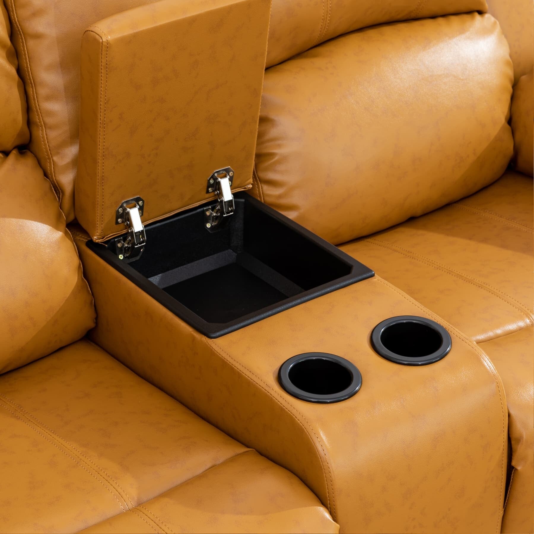B. La parte centrale del divano a due posti è dotata di contenitore per riporre gli oggetti di uso quotidiano e di portabicchieri per sistemare le bevande, comodo e flessibile.