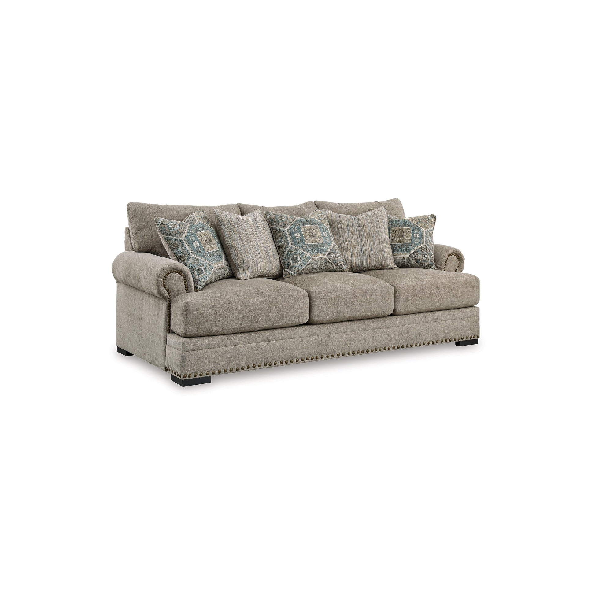 Divano Golo, 5 cuscini decorativi, tessuto grigio talpa da 97 pollici, finiture con borchie