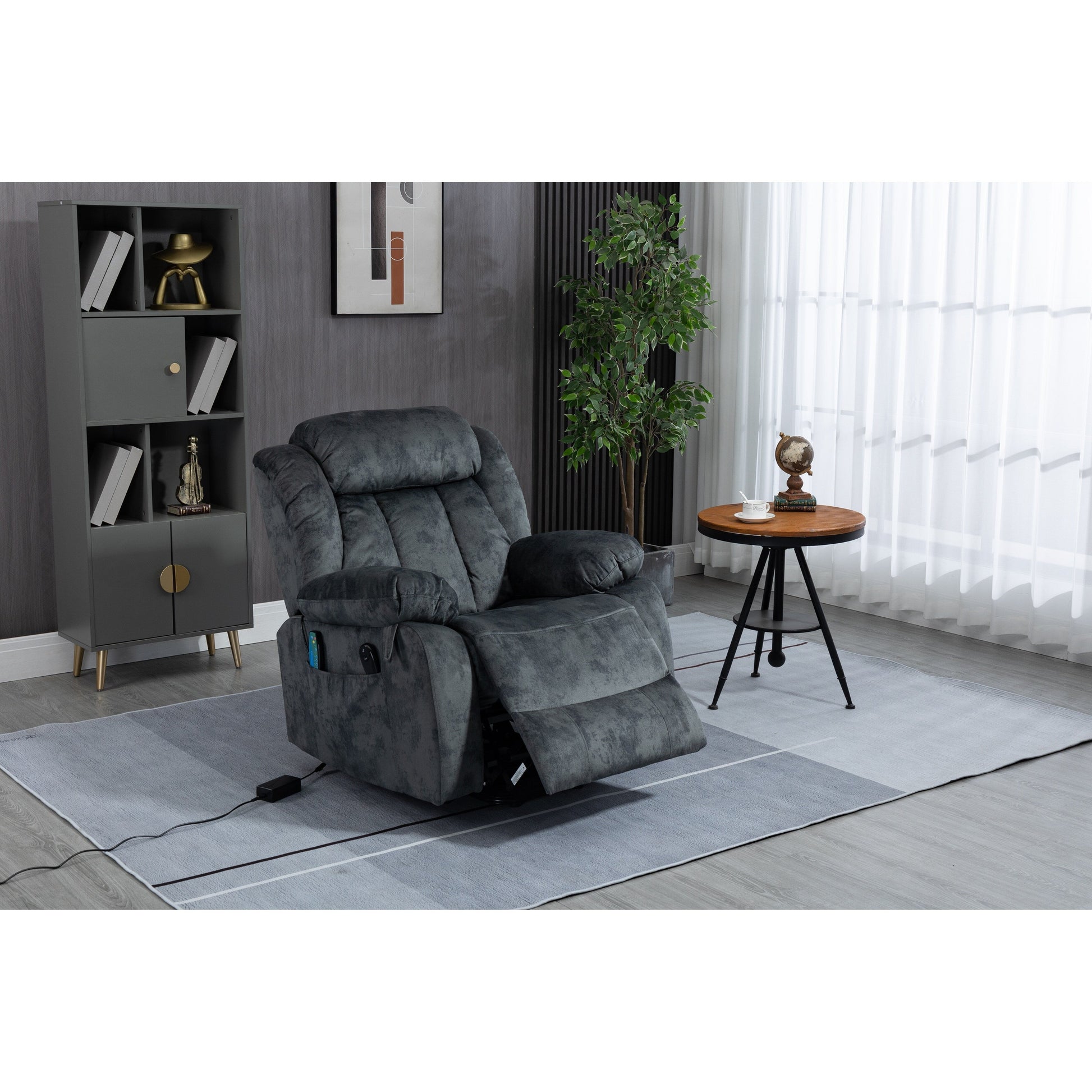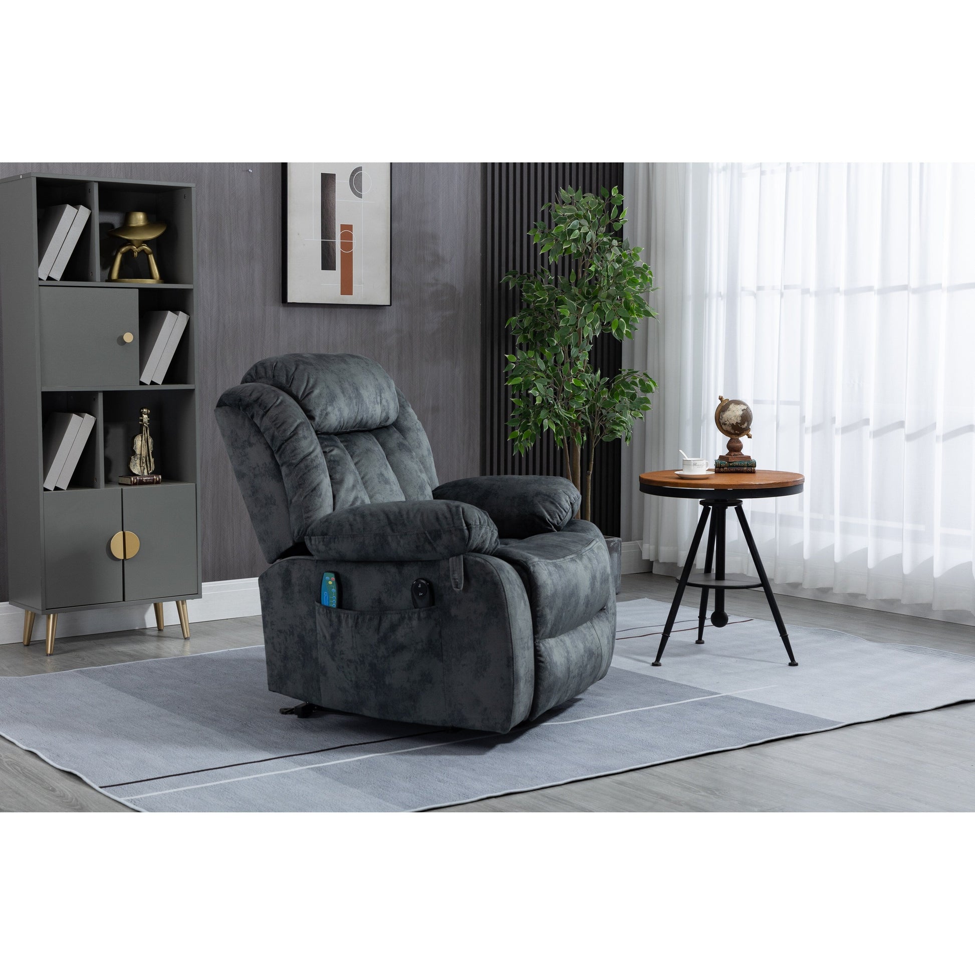 Poltrona reclinabile elettrica imbottita in velluto grigio oversize con massaggio, riscaldamento lombare, 2 tasche laterali, porta USB