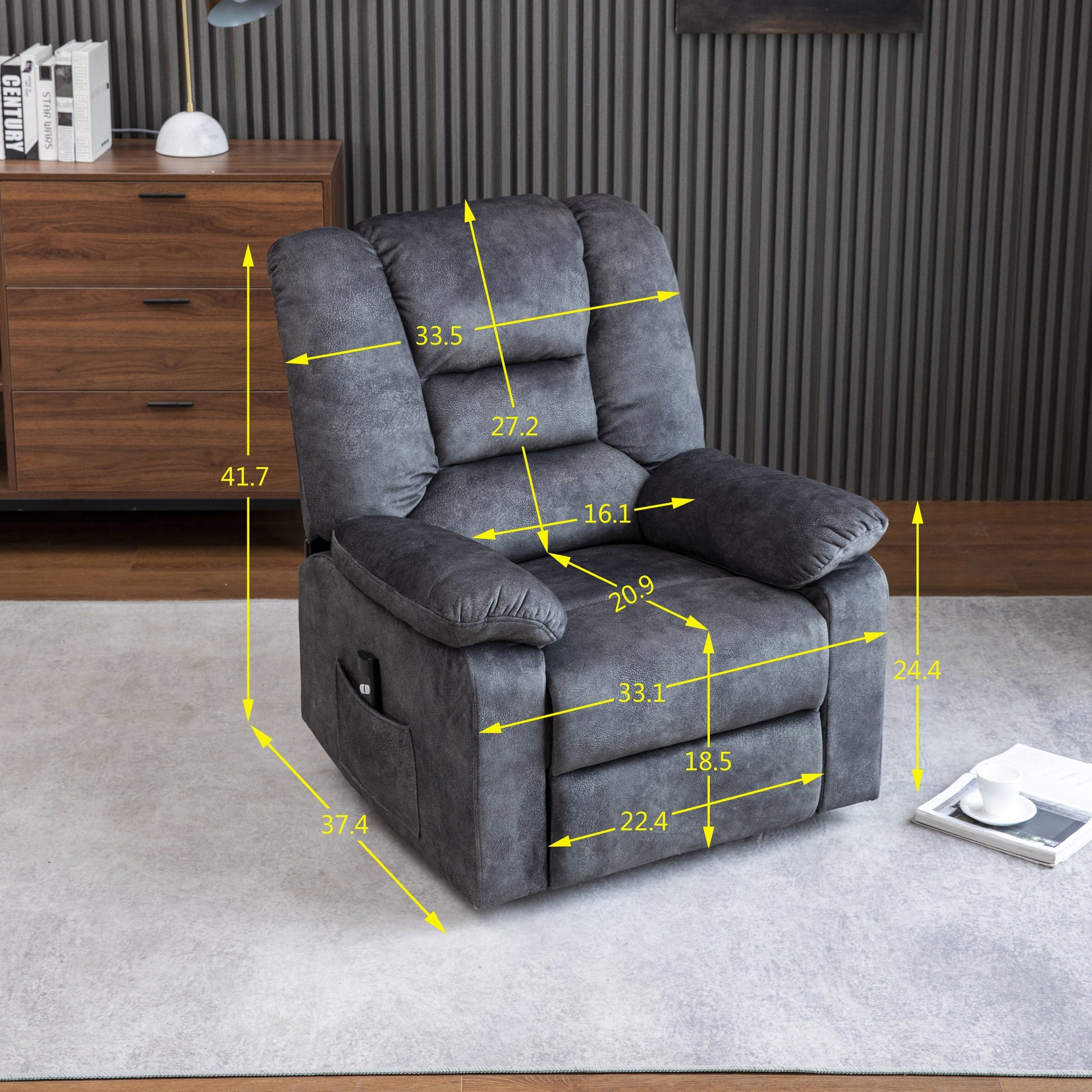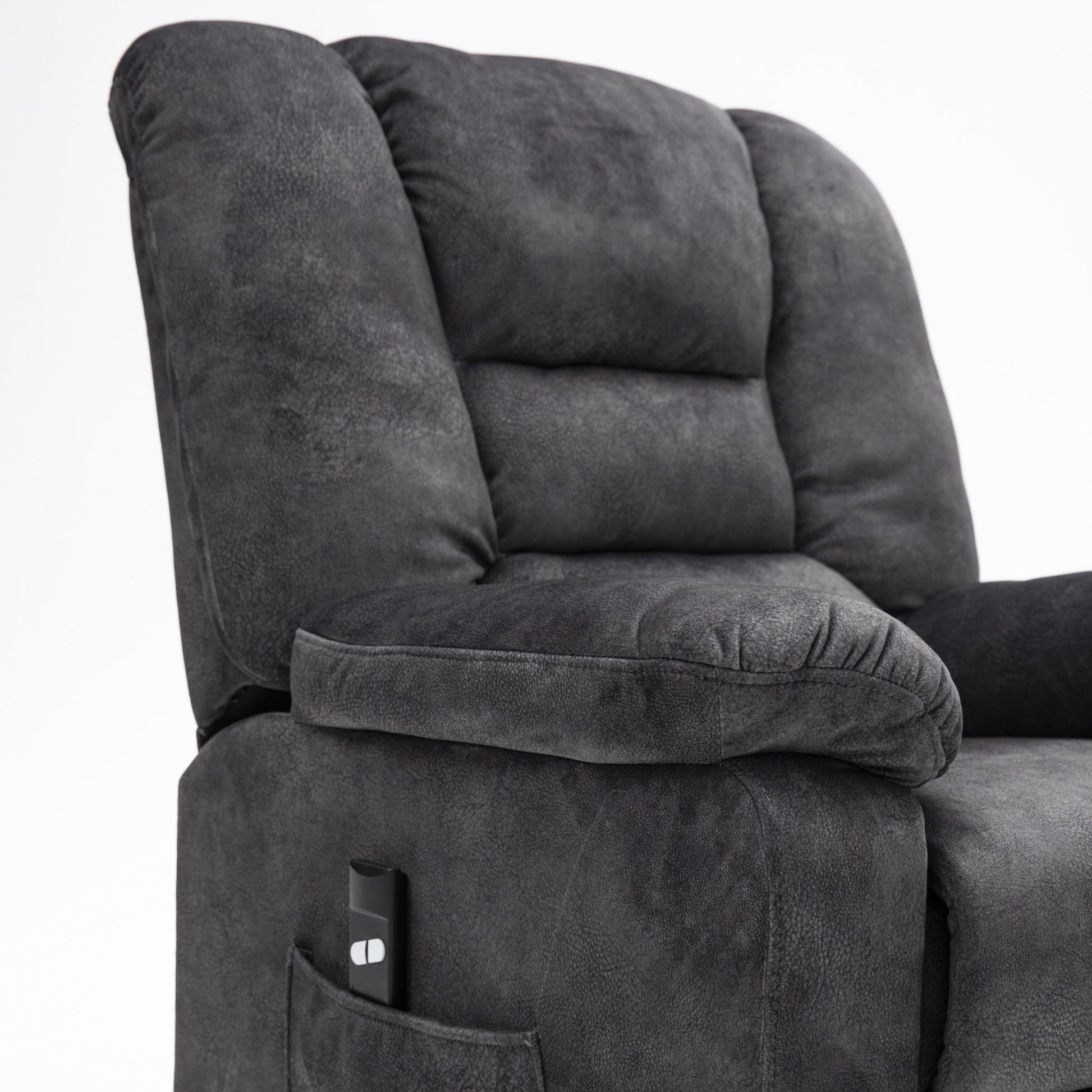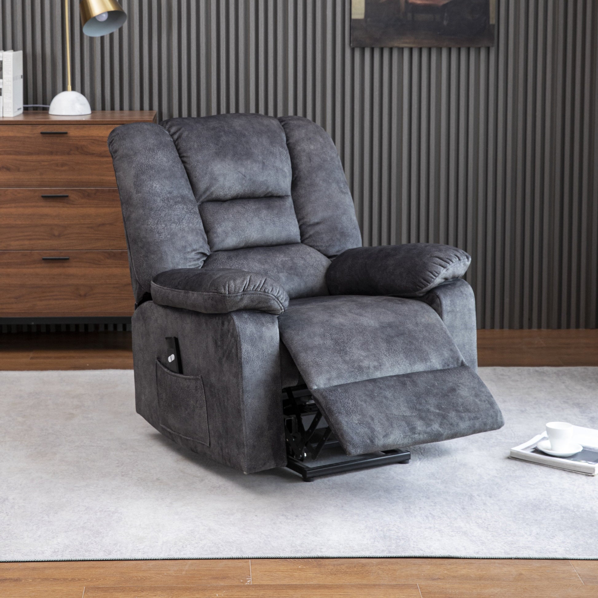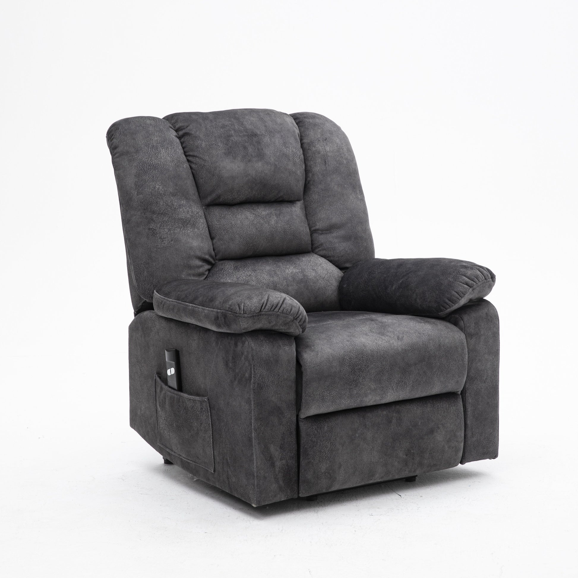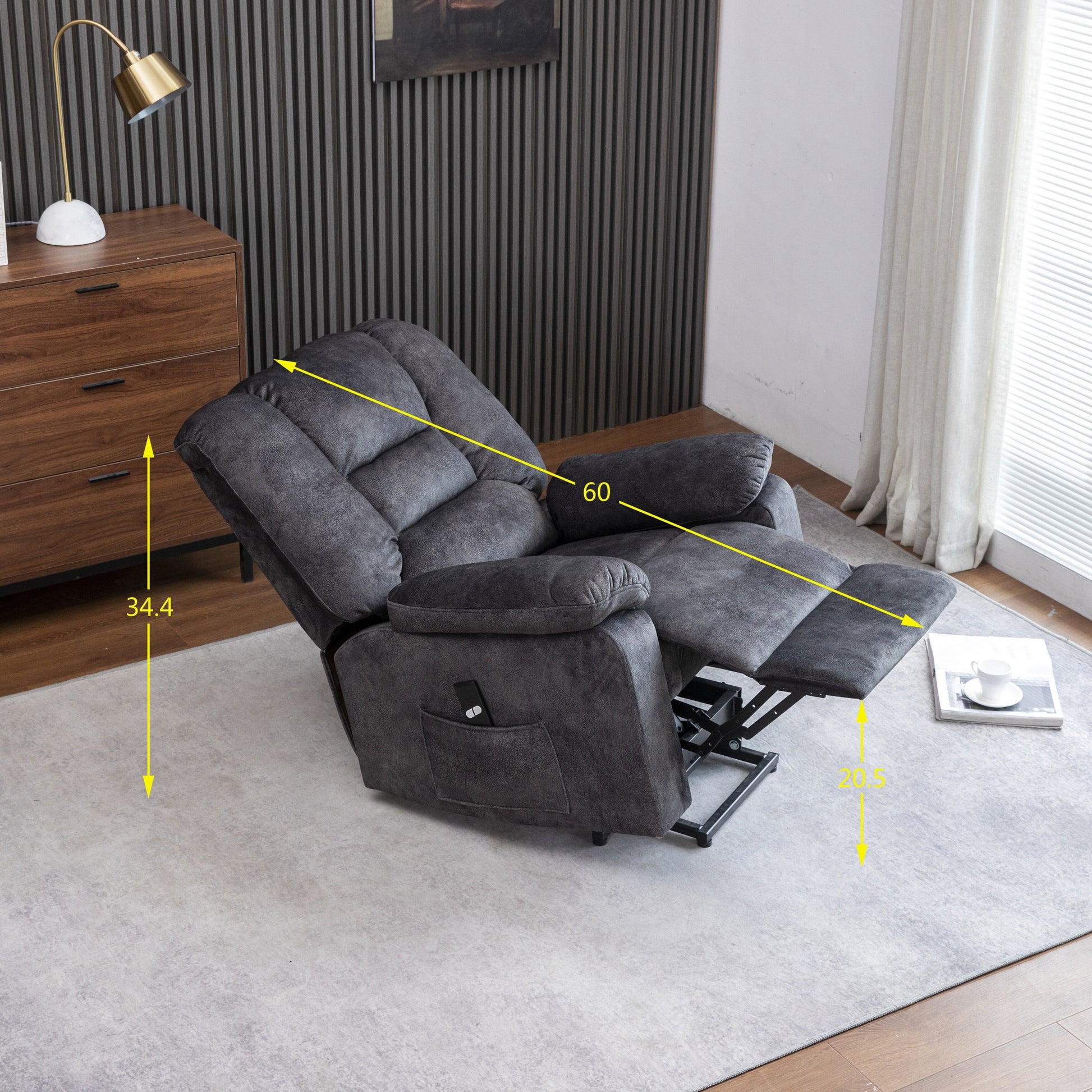 Poltrona reclinabile elettrica imbottita in velluto grigio per anziani con massaggio, riscaldamento lombare e tasche laterali portaoggetti
