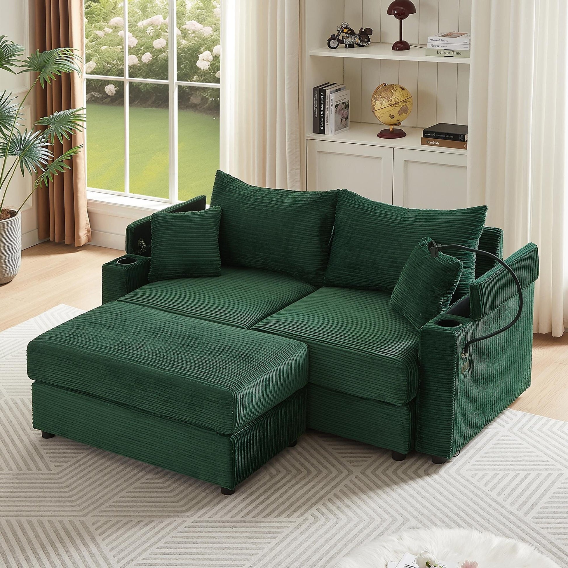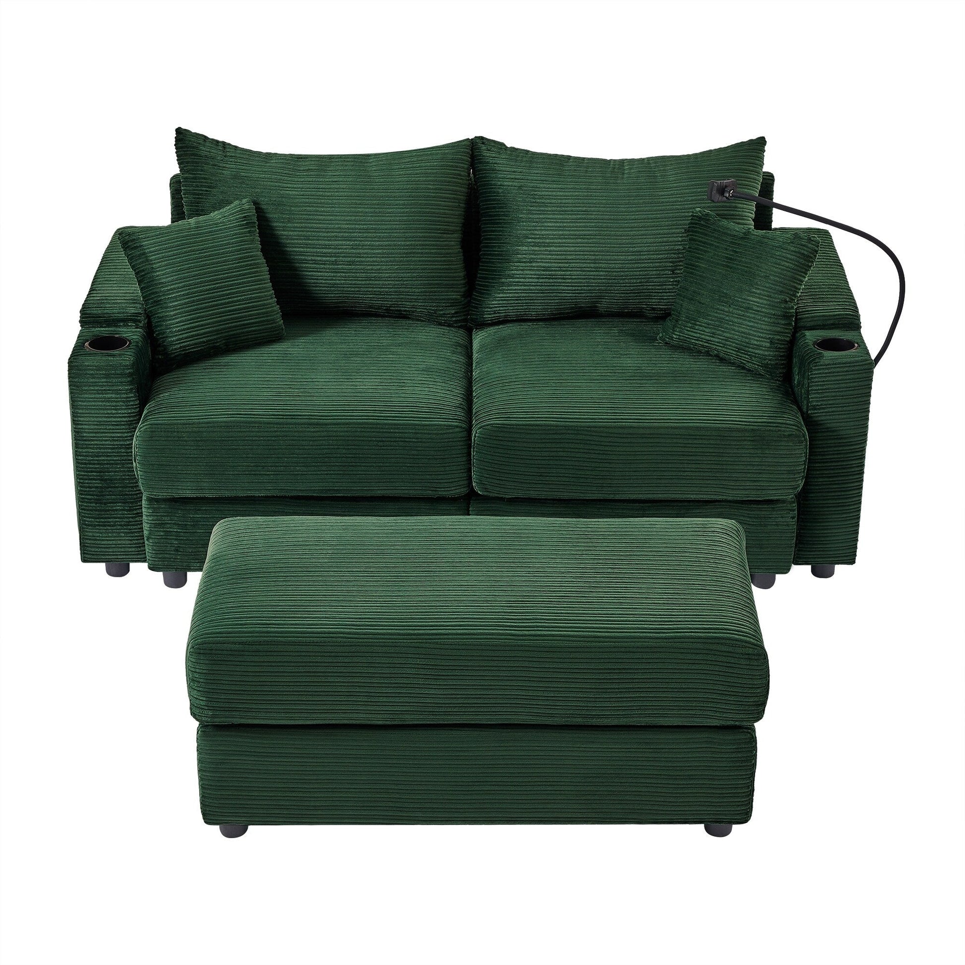 Divano a due posti in velluto a coste verde moderno da 72,8 pollici con poggiapiedi mobile, braccioli contenitivi, porta telefono e due porte USB