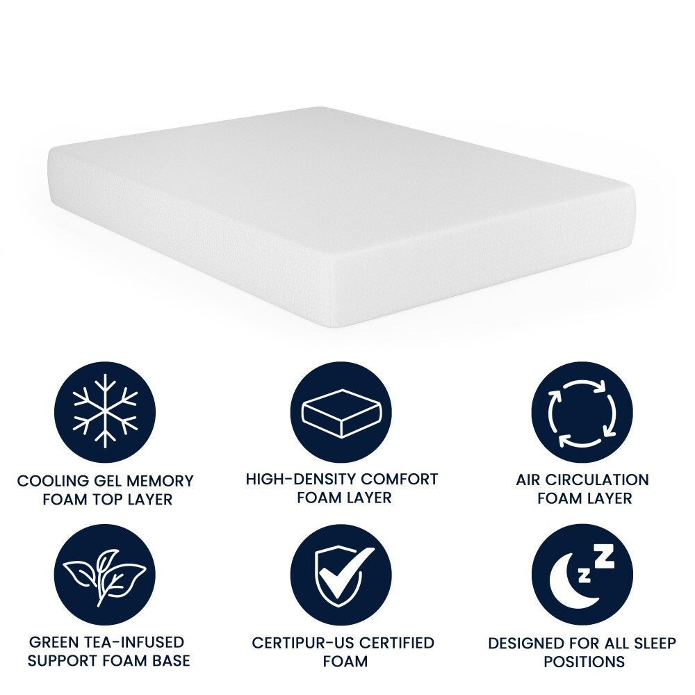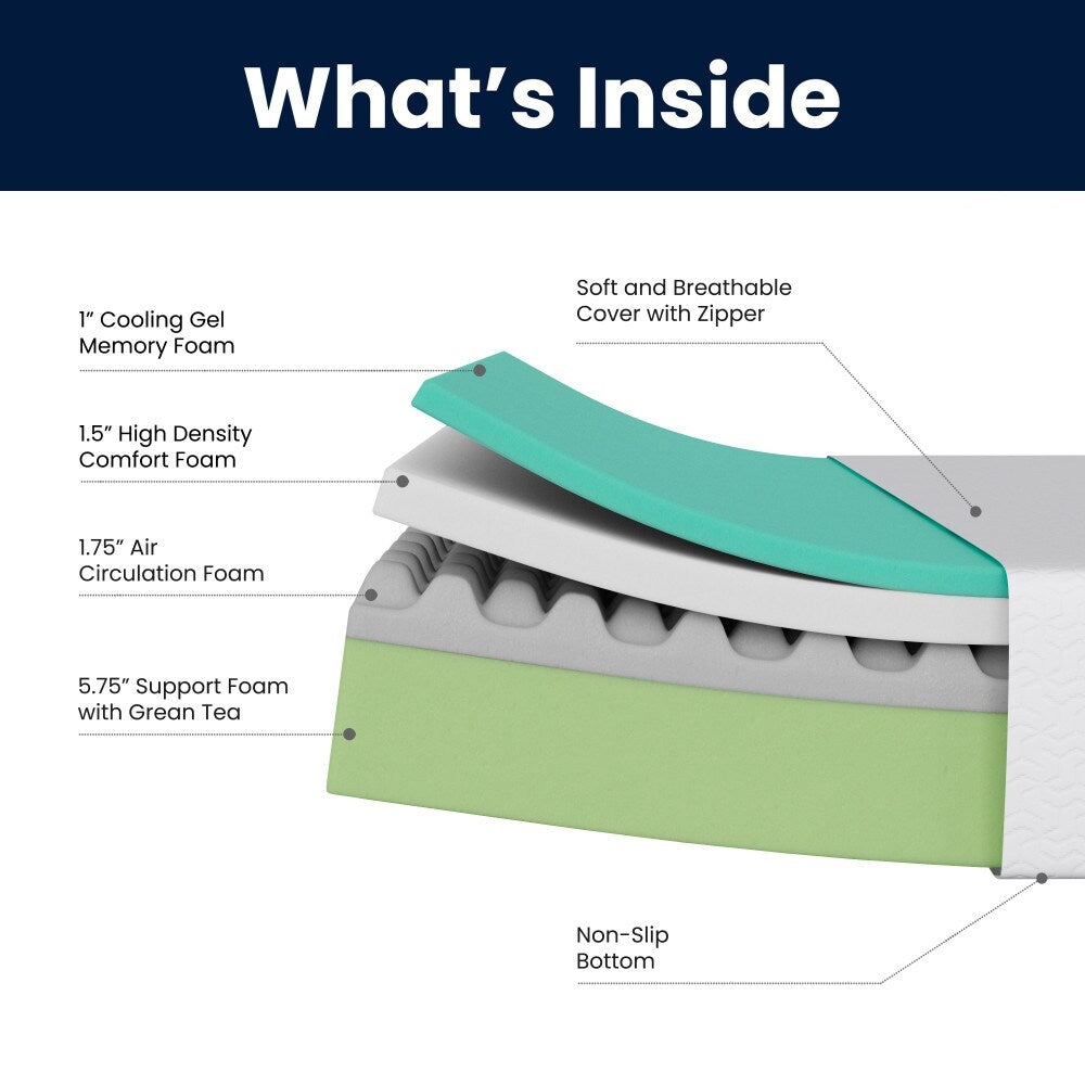 Un buon sonno notturno è una parte importante di qualsiasi routine. Assicurati di ottenere il tuo con questo materasso in memory foam a quattro strati con gel rinfrescante al tè verde, confezionato in una scatola. Questo materasso da 25 cm presenta una struttura a quattro strati che include una base in schiuma di supporto al tè verde, uno strato di schiuma comfort ad alta densità, uno strato di schiuma traspirante e uno strato superiore in memory foam con gel rinfrescante che assorbe l'umidità e aiuta a gestire calore e odori. Indipendentemente dal fatto che tu dorma su un fianco, sulla schiena o a pancia in giù, lo strato di memory foam con gel rinfrescante da 7,5 cm offre il comfort ideale per ogni posizione di sonno. E puoi riposare in tutta sicurezza sapendo che il contenuto di schiuma di alta qualità è certificato CertiPUR-US. Questo materasso senza fibra di vetro è inoltre dotato di una base antiscivolo per mantenerti robusto e comodo. Non c'è bisogno di perdere tempo con l'installazione, poiché questo materasso viene spedito compresso, arrotolato e imballato in un imballaggio sottile, quindi tutto ciò che devi fare è disimballare, srotolare e disimballare. Questo materasso è sicuro per dormire subito, ma si espande completamente entro 48-72 ore. Per la vostra comodità, questo materasso inscatolato si adatta alla maggior parte delle strutture letto ed è dotato di una cerniera per rimuovere la fodera e lavarla facilmente. Dopo una lunga giornata, godetevi il massimo comfort e una buona notte di sonno con questo materasso in memory foam a quattro strati con gel rinfrescante al tè verde, confezionato in una scatola.